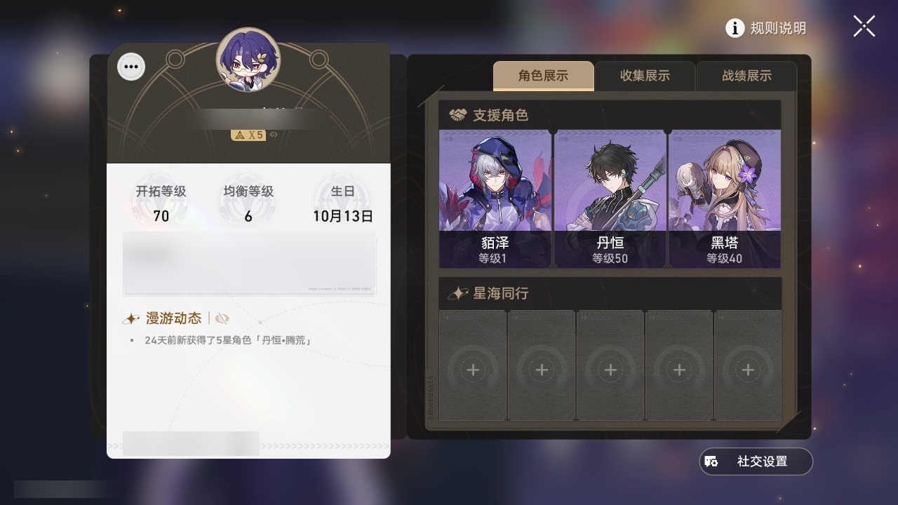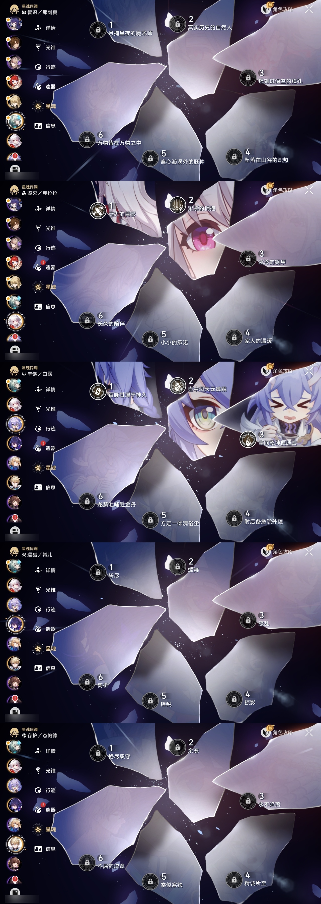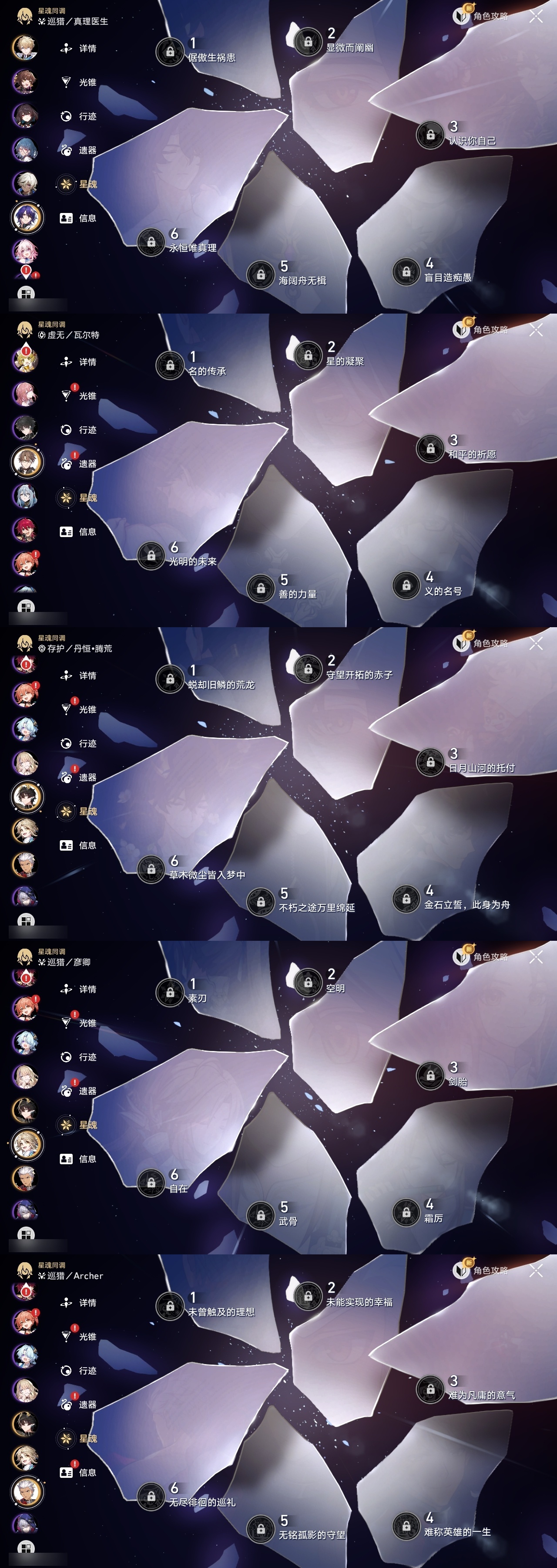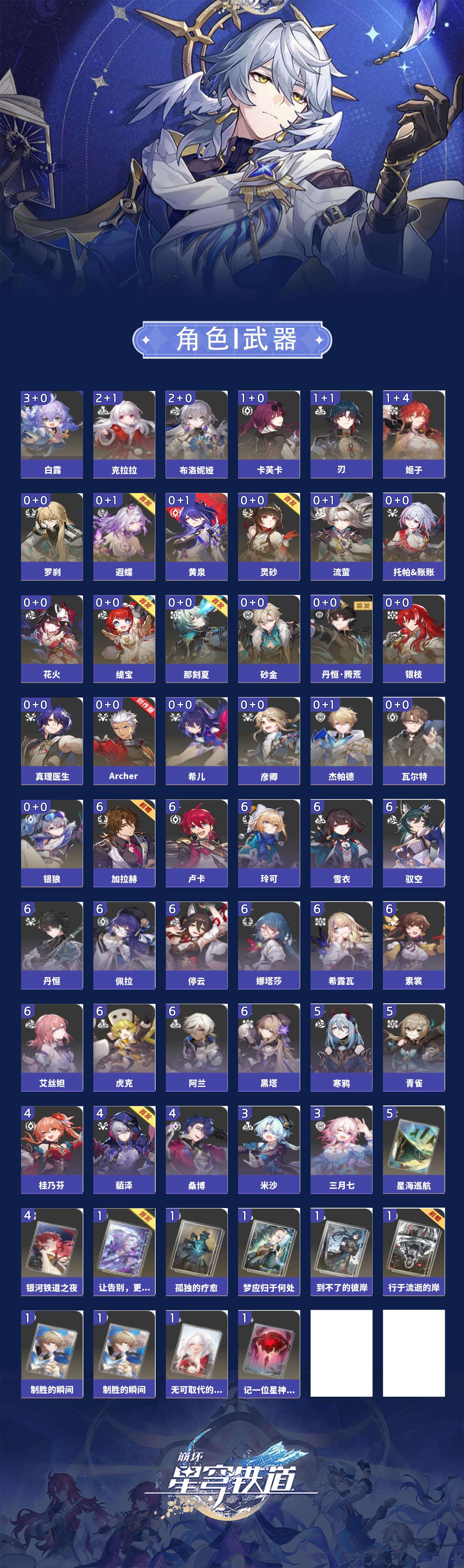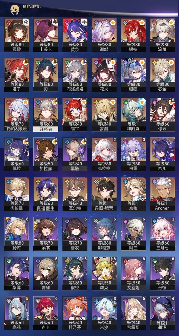 【崩坏·星穹铁道】【lyxq6143】冒险等级:70,男主,五星数量:37,五星角色:白露 3命布洛妮娅 2命克拉拉 2命姬子 1命刃 1命卡芙卡 1命银狼希儿灵砂杰帕德彦卿瓦尔特罗刹缇宝遐蝶托帕账账银枝真理医生花火那刻夏黄泉砂金archer丹恒·腾荒流萤__五星光锥:星海巡航 5精银河铁道之夜 4精记一位星神的陨落制胜的瞬间制胜的瞬间无可取代的东西不息的演算到不了的彼岸孤独的疗愈让告别,更美一些行于流逝的岸梦应归于何处__四星角色:阿兰 6命娜塔莎 6命虎克 6命黑塔 6命丹恒 6命艾丝妲 6命希露瓦 6命停云 6命素裳 6命佩拉 6命驭空 6命卢卡 6命玲可 6命雪衣 6命加拉赫 6命青雀 5命寒鸦 5命貊泽 4命桑博 4命桂乃芬 4命三月七 3命米沙 3命1