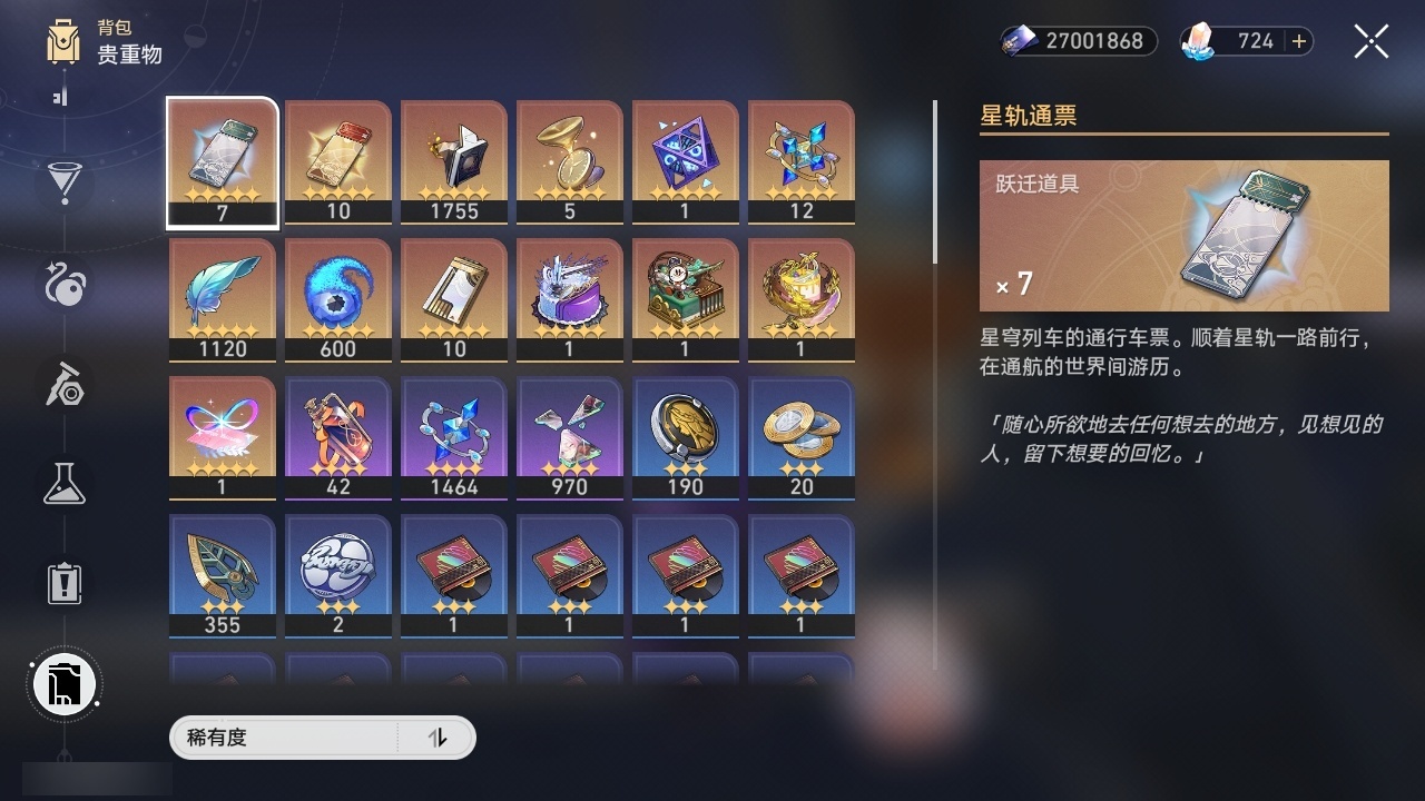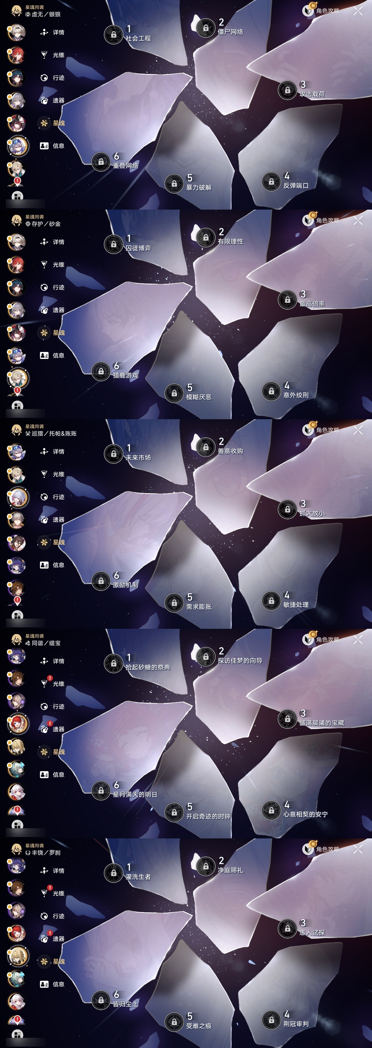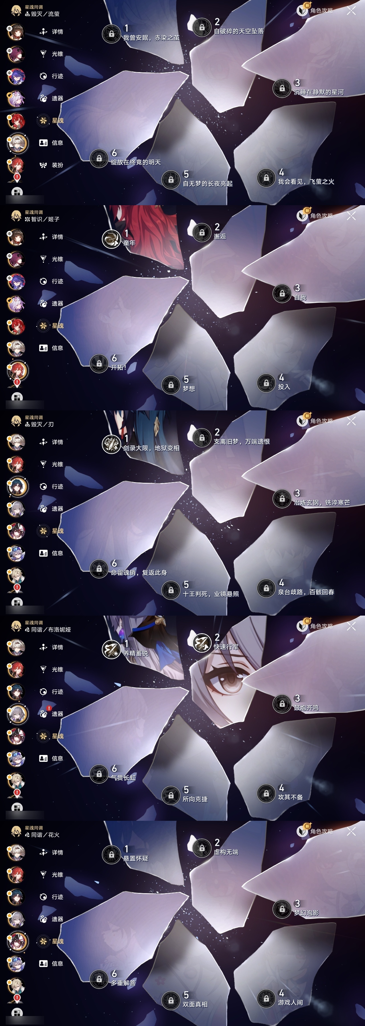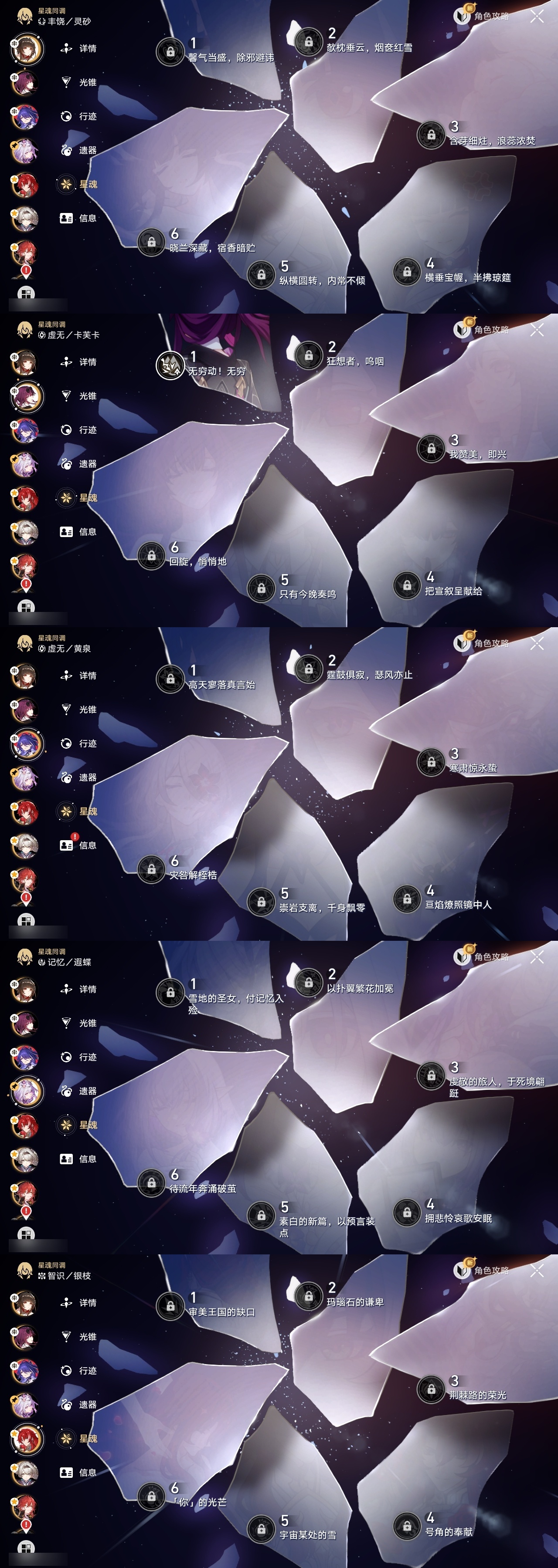 【崩坏·星穹铁道】【lyxq6143】冒险等级:70,男主,五星数量:37,五星角色:白露 3命布洛妮娅 2命克拉拉 2命姬子 1命刃 1命卡芙卡 1命银狼希儿灵砂杰帕德彦卿瓦尔特罗刹缇宝遐蝶托帕账账银枝真理医生花火那刻夏黄泉砂金archer丹恒·腾荒流萤__五星光锥:星海巡航 5精银河铁道之夜 4精记一位星神的陨落制胜的瞬间制胜的瞬间无可取代的东西不息的演算到不了的彼岸孤独的疗愈让告别,更美一些行于流逝的岸梦应归于何处__四星角色:阿兰 6命娜塔莎 6命虎克 6命黑塔 6命丹恒 6命艾丝妲 6命希露瓦 6命停云 6命素裳 6命佩拉 6命驭空 6命卢卡 6命玲可 6命雪衣 6命加拉赫 6命青雀 5命寒鸦 5命貊泽 4命桑博 4命桂乃芬 4命三月七 3命米沙 3命1