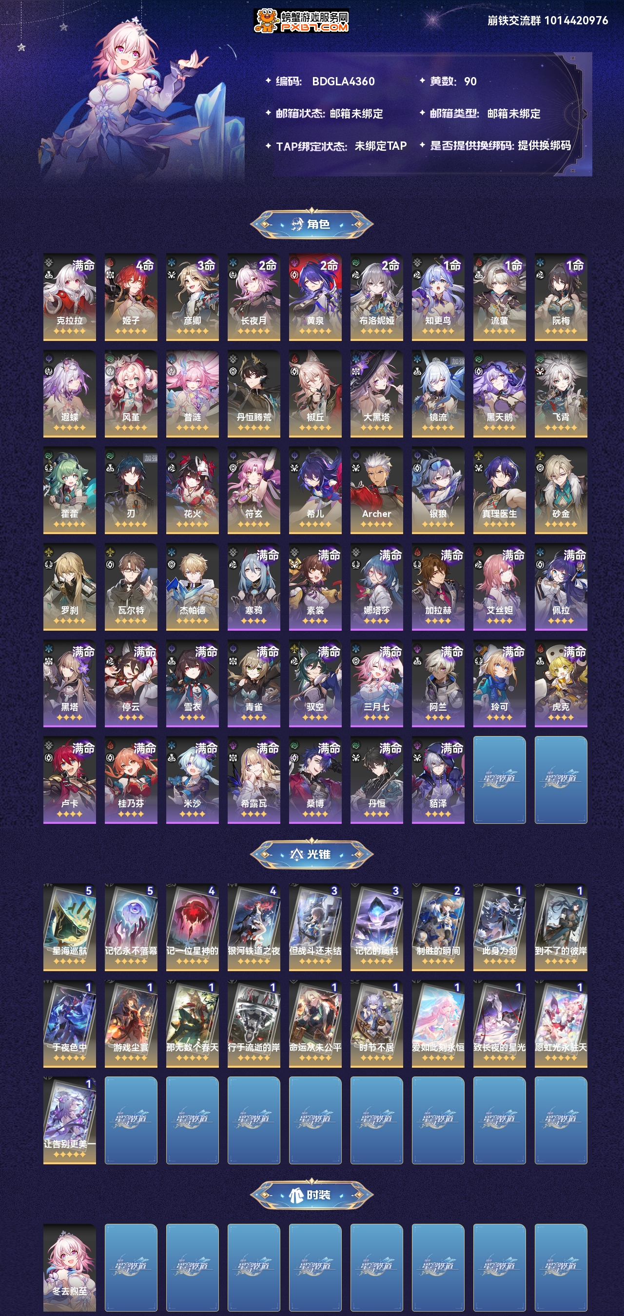 【崩坏·星穹铁道】【lyxq7675】冒险等级:70,男主,五星数量:49,绑定情况:手机号__五星角色:克拉拉 6命|姬子 4命|彦卿 3命|长夜月 2命|黄泉 2命|布洛妮娅 2命|知更鸟 1命|流萤 1命|阮·梅 1命|遐蝶|风堇|昔涟|丹恒·腾荒|椒丘|大黑塔|镜流|黑天鹅|飞霄|藿藿|刃|花火|符玄|希儿|archer|银狼|真理医生|砂金|罗刹|瓦尔特|杰帕德__五星光锥:星海巡航 5精|记忆永不落幕 5精|记一位星神的陨落 4精|银河铁道之夜 4精|但战斗还未结束 3精|记忆的质料 3精|制胜的瞬间 2精|此身为剑|到不了的彼岸|于夜色中|游戏尘寰|那无数个春天|行于流逝的岸|命运从未公平|时节不居|爱如此刻永恒|致长夜的星光|愿虹光永驻天空|让告别,更美一些,【邮箱未绑定】