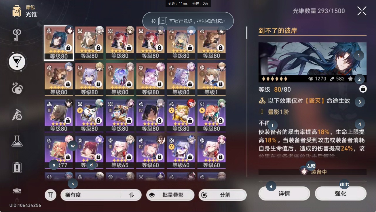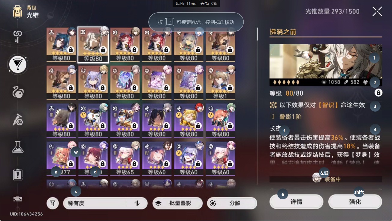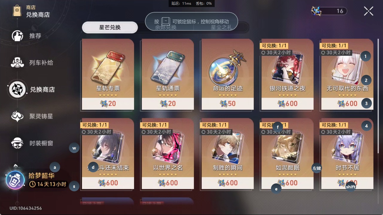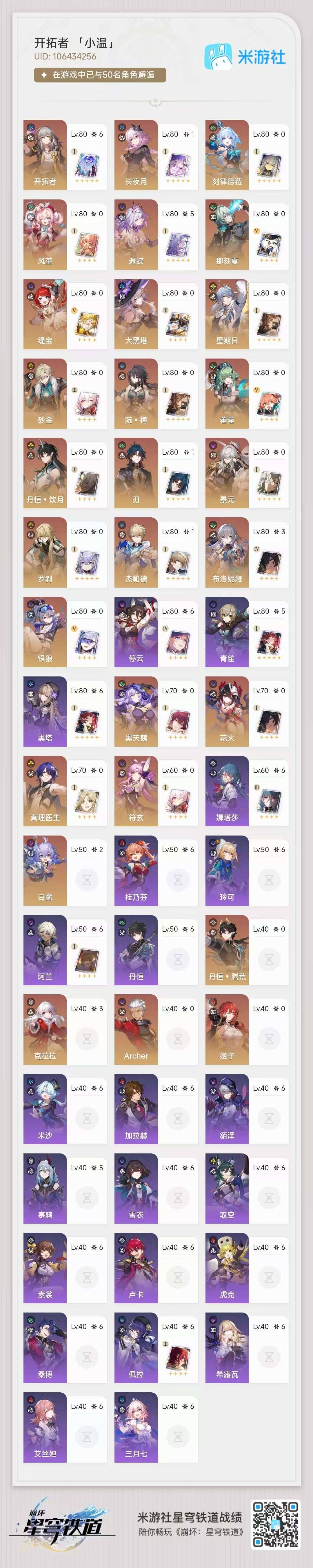 [14402144]【总黄数】:36 【5命金色角色】:5命遐蝶 【3命金色角色】:3命布洛妮娅3命克拉拉 【2命金色角色】:2命白露 【1命金色角色】:1命长夜月1命杰帕德1命刃 【0命金色角色】:0命星期日0命大黑塔0命缇宝0命那刻夏0命风堇0命archer0命刻律德菈0命景元0命姬子0命银狼0命罗刹0命丹恒•饮月0命符玄0命藿藿0命阮•梅0命真理医生0命黑天鹅0命花火0命砂金 【精1武器】:精1拂晓之前精1记忆永不落幕精1让告别,更美一些精1金血铭刻的时代精1致长夜的星光精1时节不居精1制胜的瞬间精1银河铁道之夜精1到不了的彼岸精1镜中故我