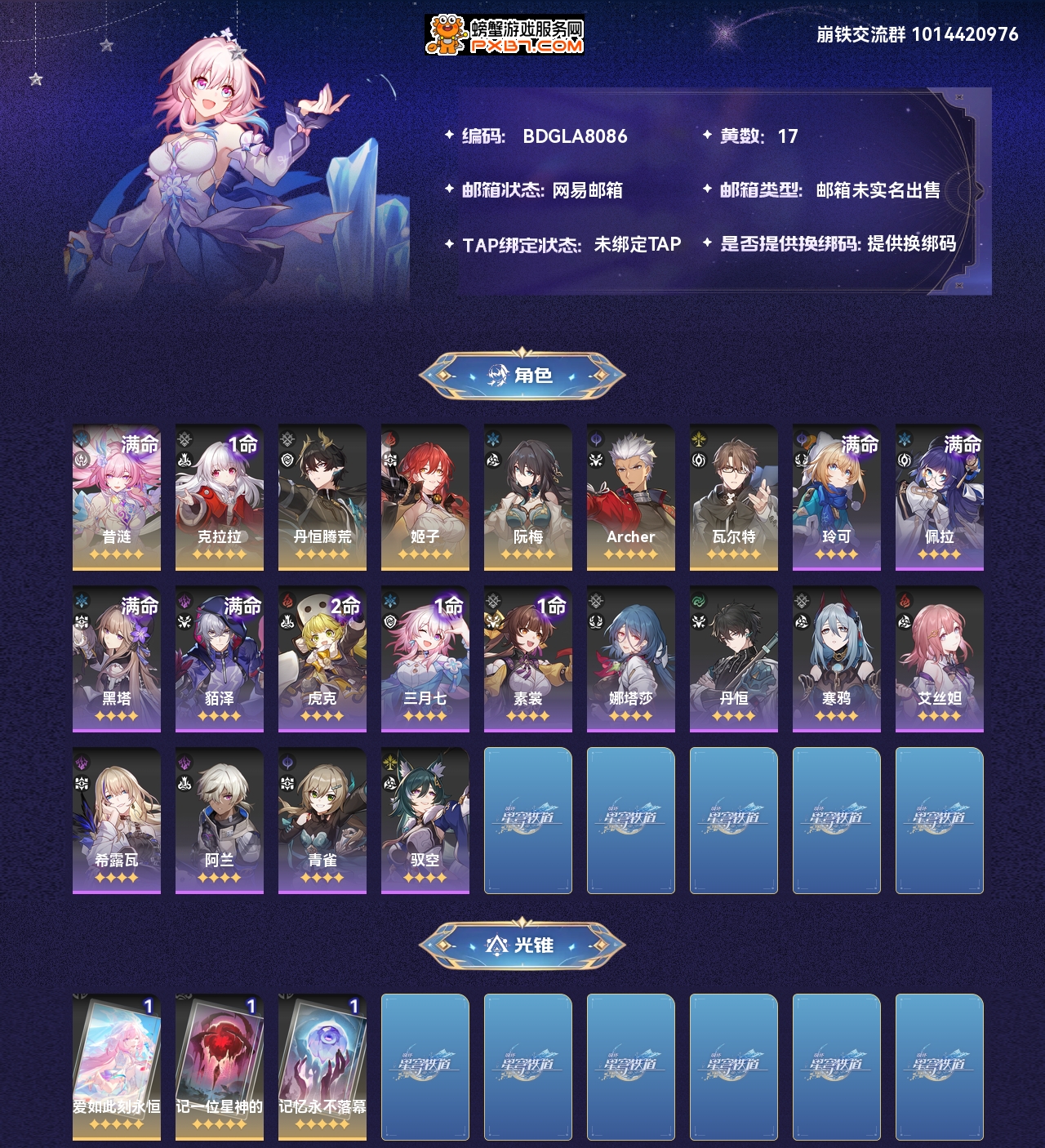 【崩坏·星穹铁道】【lyxq7639】冒险等级:64,男主,五星数量:10,绑定情况:邮箱__五星角色:昔涟 6命|克拉拉 1命|丹恒·腾荒|姬子|阮·梅|archer|瓦尔特__五星光锥:爱如此刻永恒|记一位星神的陨落|记忆永不落幕,【邮箱未实名】