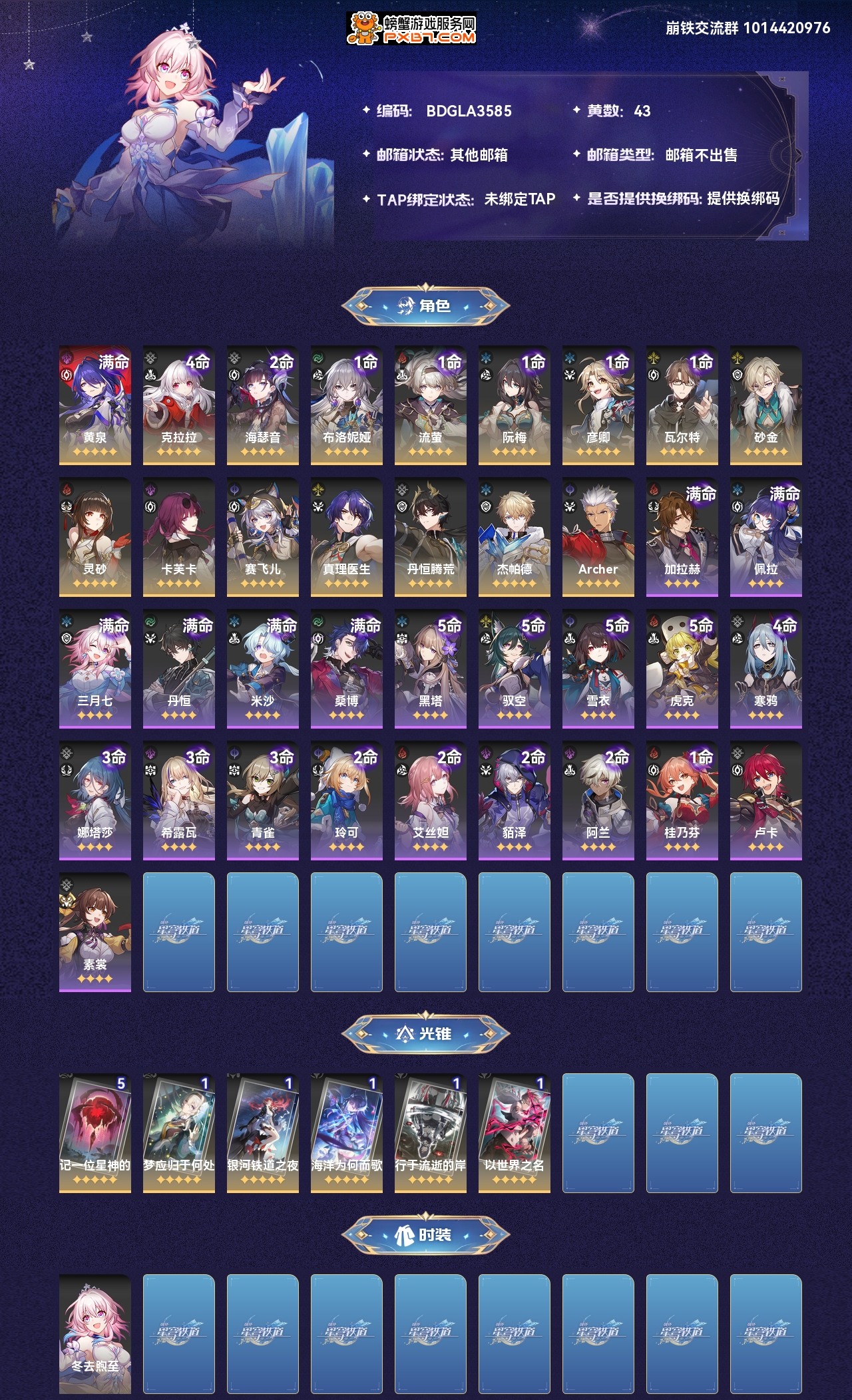 【崩坏·星穹铁道】【lyxq7644】冒险等级:70,女主,五星数量:22,绑定情况:邮箱__五星角色:黄泉 6命|克拉拉 4命|海瑟音 2命|布洛妮娅 1命|流萤 1命|阮·梅 1命|彦卿 1命|瓦尔特 1命|砂金|灵砂|卡芙卡|赛飞儿|真理医生|丹恒·腾荒|杰帕德|archer__五星光锥:记一位星神的陨落 5精|梦应归于何处|银河铁道之夜|海洋为何而歌|行于流逝的岸|以世界之名,【邮箱不出售】