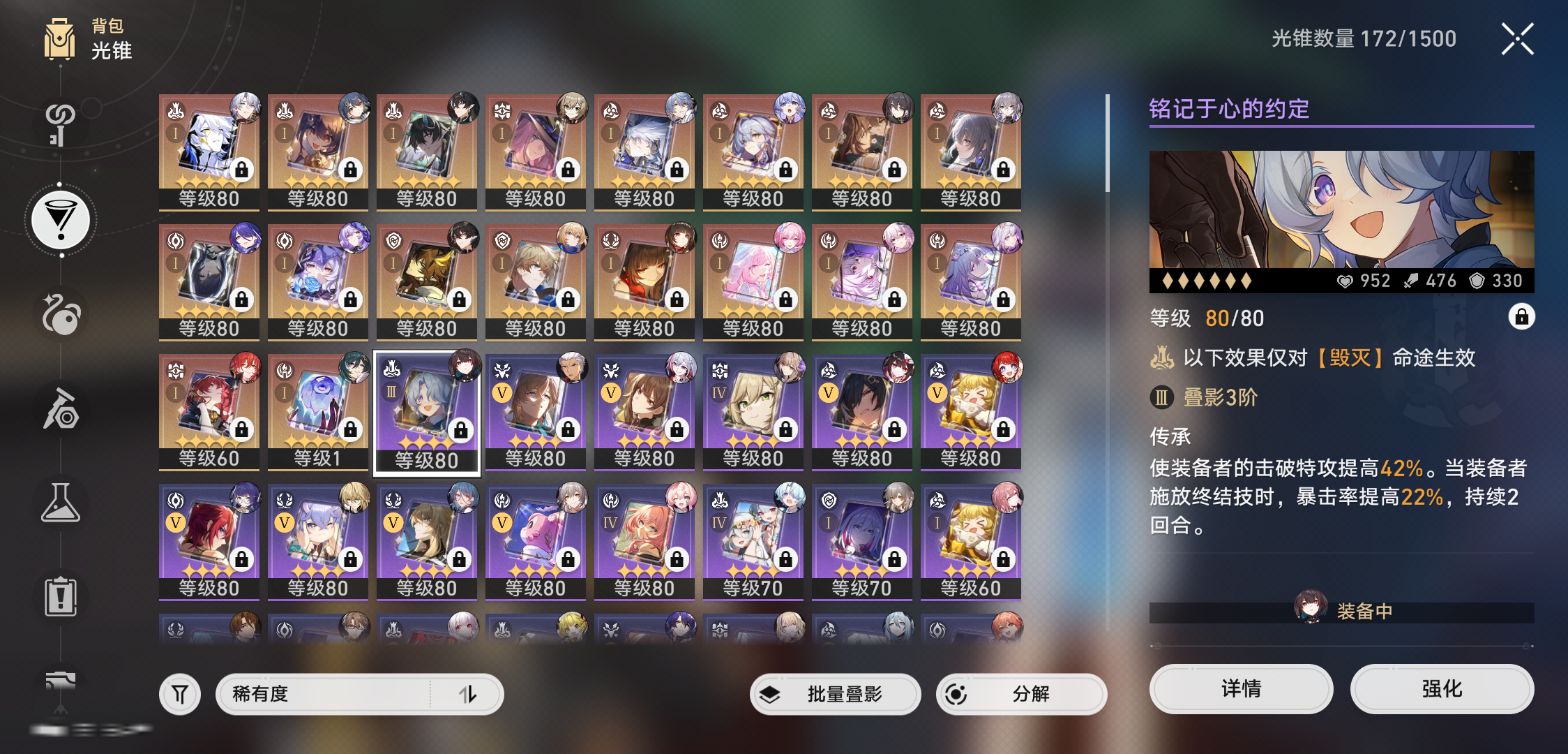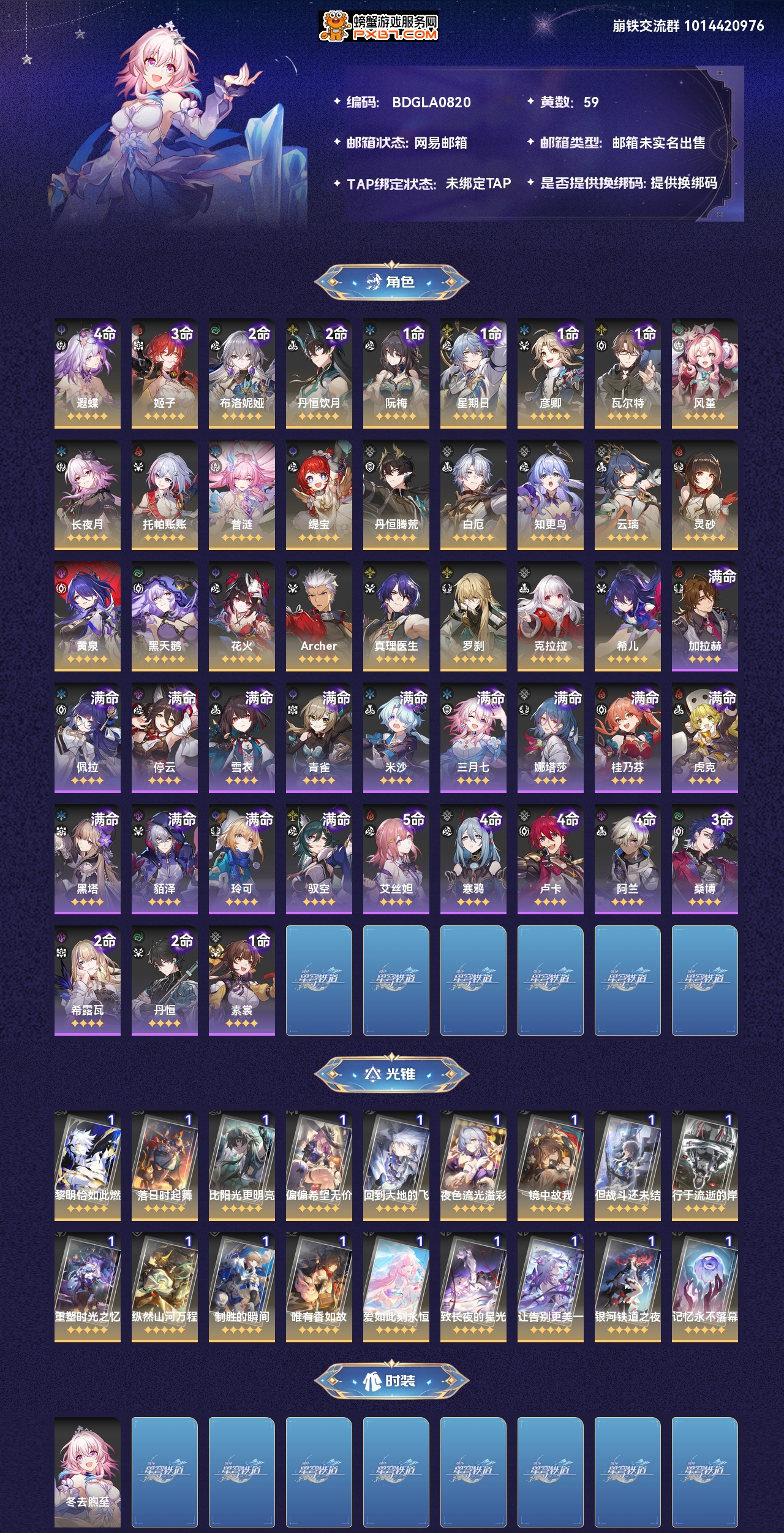 【崩坏·星穹铁道】【lyxq7500】冒险等级:70,女主,五星数量:44,绑定情况:邮箱__五星角色:遐蝶 4命|姬子 3命|布洛妮娅 2命|丹恒·饮月 2命|阮·梅 1命|星期日 1命|彦卿 1命|瓦尔特 1命|风堇|长夜月|托帕账账|昔涟|缇宝|丹恒·腾荒|白厄|知更鸟|云璃|灵砂|黄泉|黑天鹅|花火|archer|真理医生|罗刹|克拉拉|希儿__五星光锥:黎明恰如此燃烧|落日时起舞|比阳光更明亮的|偏偏希望无价|回到大地的飞行|夜色流光溢彩|镜中故我|但战斗还未结束|行于流逝的岸|重塑时光之忆|纵然山河万程|制胜的瞬间|唯有香如故|爱如此刻永恒|致长夜的星光|让告别,更美一些|银河铁道之夜|记忆永不落幕,【邮箱未实名】