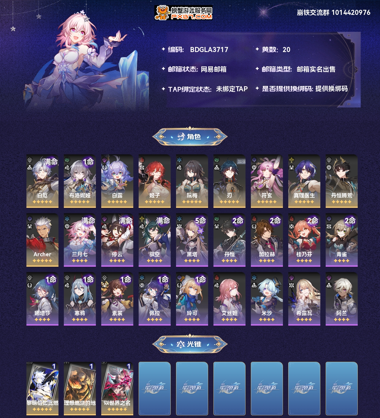 【崩坏·星穹铁道】【lyxq7624】冒险等级:65,男主,五星数量:13,绑定情况:手机号__五星角色:白厄 6命|布洛妮娅 1命|白露|姬子|阮·梅|刃|符玄|真理医生|丹恒·腾荒|archer__五星光锥:黎明恰如此燃烧|理想燃烧的地狱|以世界之名,【邮箱已实名】