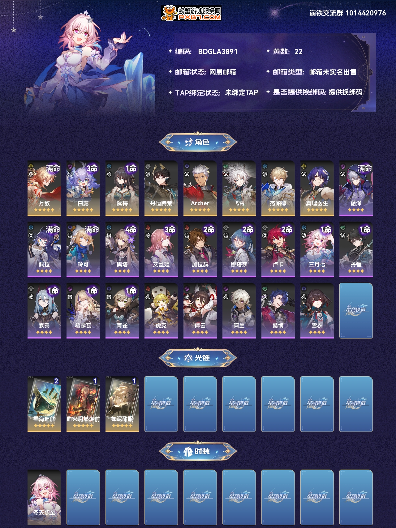 【崩坏·星穹铁道】【lyxq7560】冒险等级:60,男主,五星数量:11,绑定情况:邮箱__五星角色:万敌 6命|白露 3命|阮·梅 1命|丹恒·腾荒|archer|飞霄|杰帕德|真理医生__五星光锥:星海巡航 2精|血火啊,燃烧前路|如泥酣眠,【邮箱未实名】