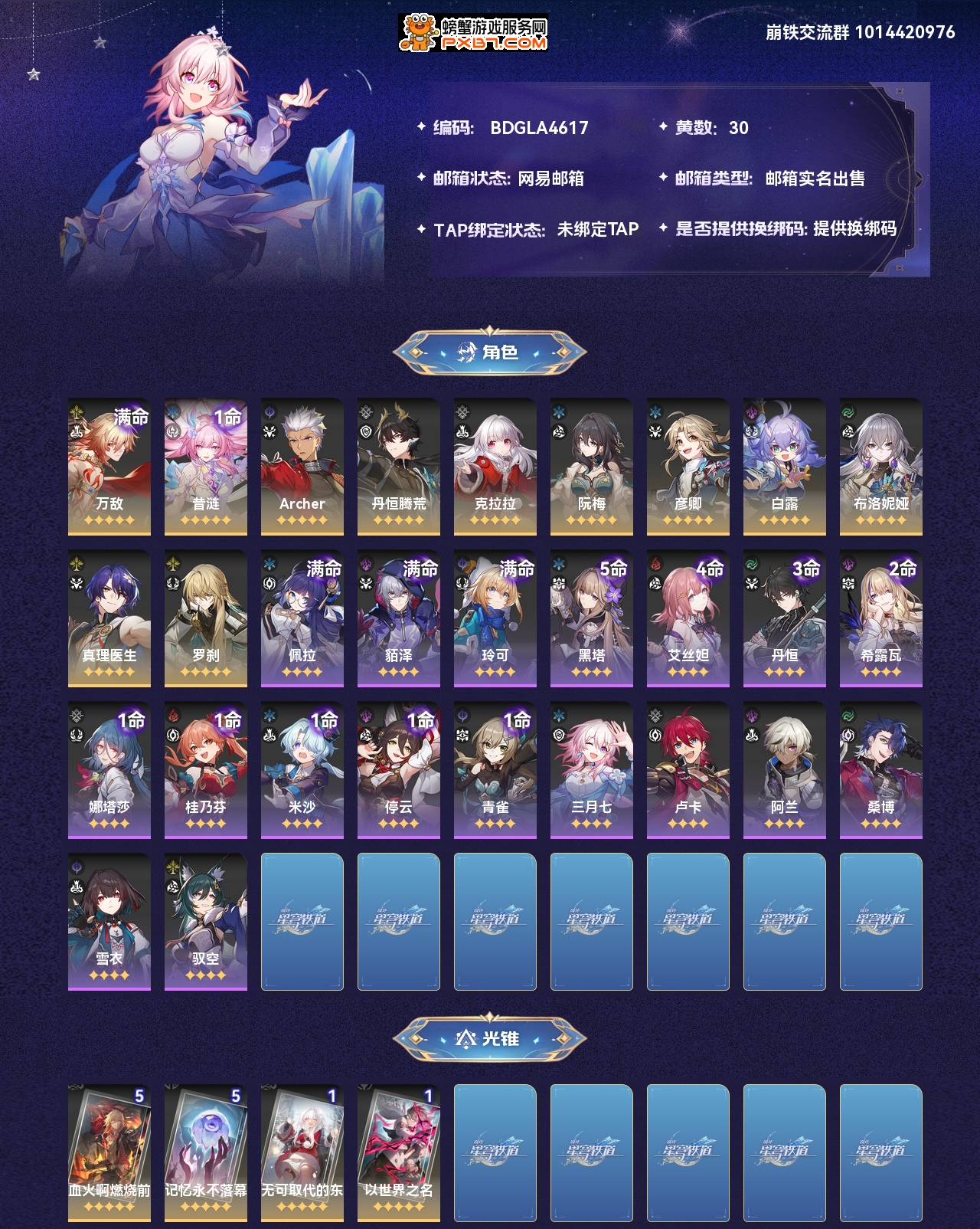 【崩坏·星穹铁道】【lyxq7672】冒险等级:62,女主,五星数量:15,绑定情况:邮箱__五星角色:万敌 6命|昔涟 1命|archer|丹恒·腾荒|克拉拉|阮·梅|彦卿|白露|布洛妮娅|真理医生|罗刹__五星光锥:血火啊,燃烧前路 5精|记忆永不落幕 5精|无可取代的东西|以世界之名,【邮箱已实名】