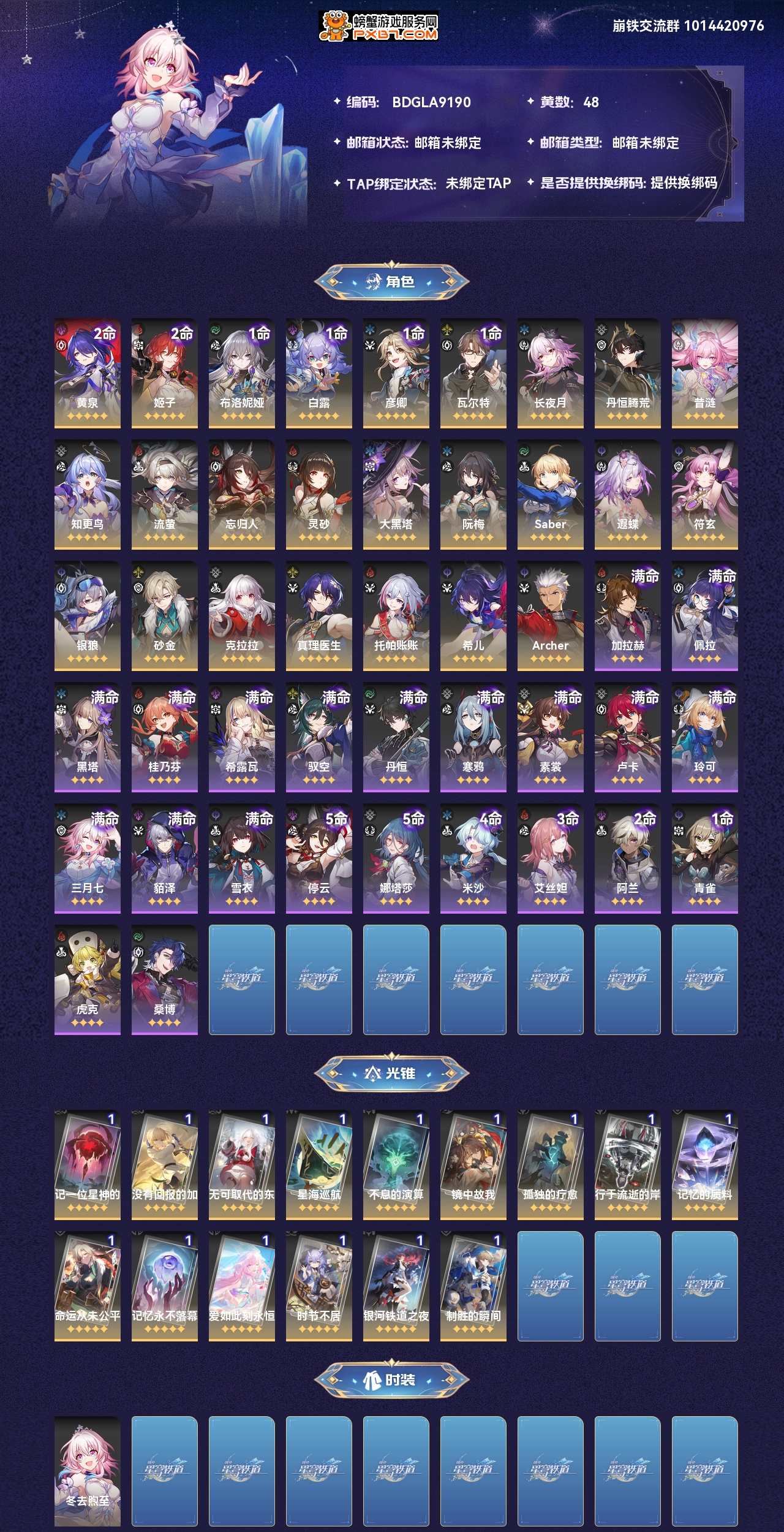 【崩坏·星穹铁道】【lyxq7694】冒险等级:70,男主,五星数量:40,绑定情况:手机号__五星角色:黄泉 2命|姬子 2命|布洛妮娅 1命|白露 1命|彦卿 1命|瓦尔特 1命|长夜月|丹恒·腾荒|昔涟|知更鸟|流萤|忘归人|灵砂|大黑塔|阮·梅|saber|遐蝶|符玄|银狼|砂金|克拉拉|真理医生|托帕账账|希儿|archer__五星光锥:记一位星神的陨落|没有回报的加冕|无可取代的东西|星海巡航|不息的演算|镜中故我|孤独的疗愈|行于流逝的岸|记忆的质料|命运从未公平|记忆永不落幕|爱如此刻永恒|时节不居|银河铁道之夜|制胜的瞬间,【邮箱未绑定】