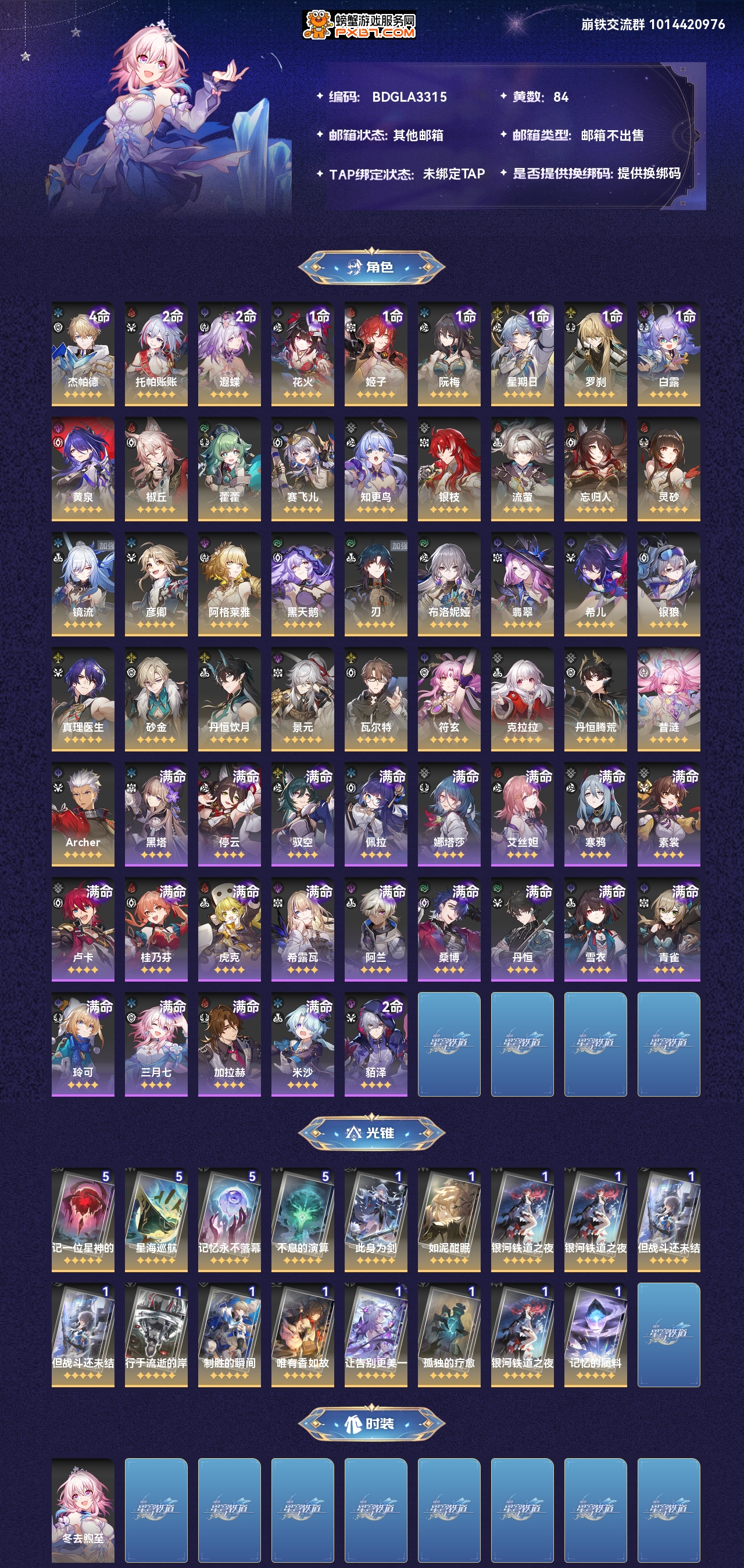 【崩坏·星穹铁道】【lyxq7760】冒险等级:70,男主,五星数量:51,绑定情况:手机号__五星角色:杰帕德 4命|托帕账账 2命|遐蝶 2命|花火 1命|姬子 1命|阮·梅 1命|星期日 1命|罗刹 1命|白露 1命|黄泉|椒丘|藿藿|赛飞儿|知更鸟|银枝|流萤|忘归人|灵砂|镜流|彦卿|阿格莱雅|黑天鹅|刃|布洛妮娅|翡翠|希儿|银狼|真理医生|砂金|丹恒·饮月|景元|瓦尔特|符玄|克拉拉|丹恒·腾荒|昔涟|archer__五星光锥:记一位星神的陨落 5精|星海巡航 5精|记忆永不落幕 5精|不息的演算 5精|此身为剑|如泥酣眠|银河铁道之夜|但战斗还未结束|行于流逝的岸|制胜的瞬间|唯有香如故|让告别,更美一些|孤独的疗愈|记忆的质料,【邮箱不出售】