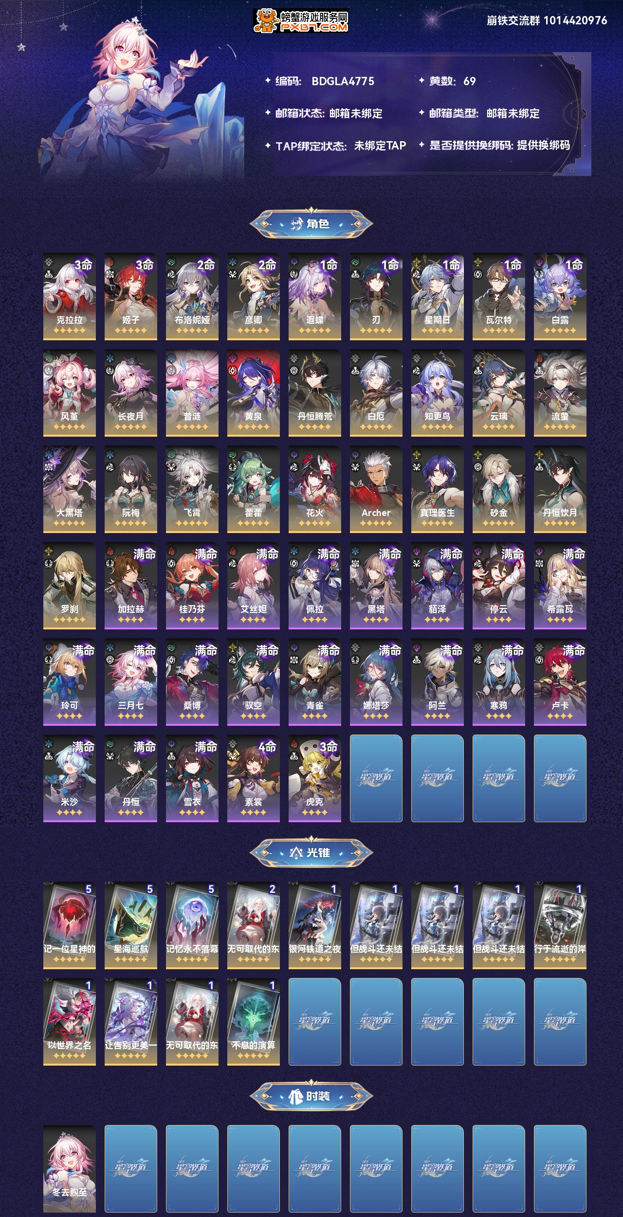 【崩坏·星穹铁道】【lyxq7767】冒险等级:70,女主,五星数量:38,绑定情况:手机号__五星角色:克拉拉 3命|姬子 3命|布洛妮娅 2命|彦卿 2命|遐蝶 1命|刃 1命|星期日 1命|瓦尔特 1命|白露 1命|风堇|长夜月|昔涟|黄泉|丹恒·腾荒|白厄|知更鸟|云璃|流萤|大黑塔|阮·梅|飞霄|藿藿|花火|archer|真理医生|砂金|丹恒·饮月|罗刹__五星光锥:记一位星神的陨落 5精|星海巡航 5精|记忆永不落幕 5精|无可取代的东西 2精|银河铁道之夜|但战斗还未结束|行于流逝的岸|以世界之名|让告别,更美一些|不息的演算,【邮箱未绑定】