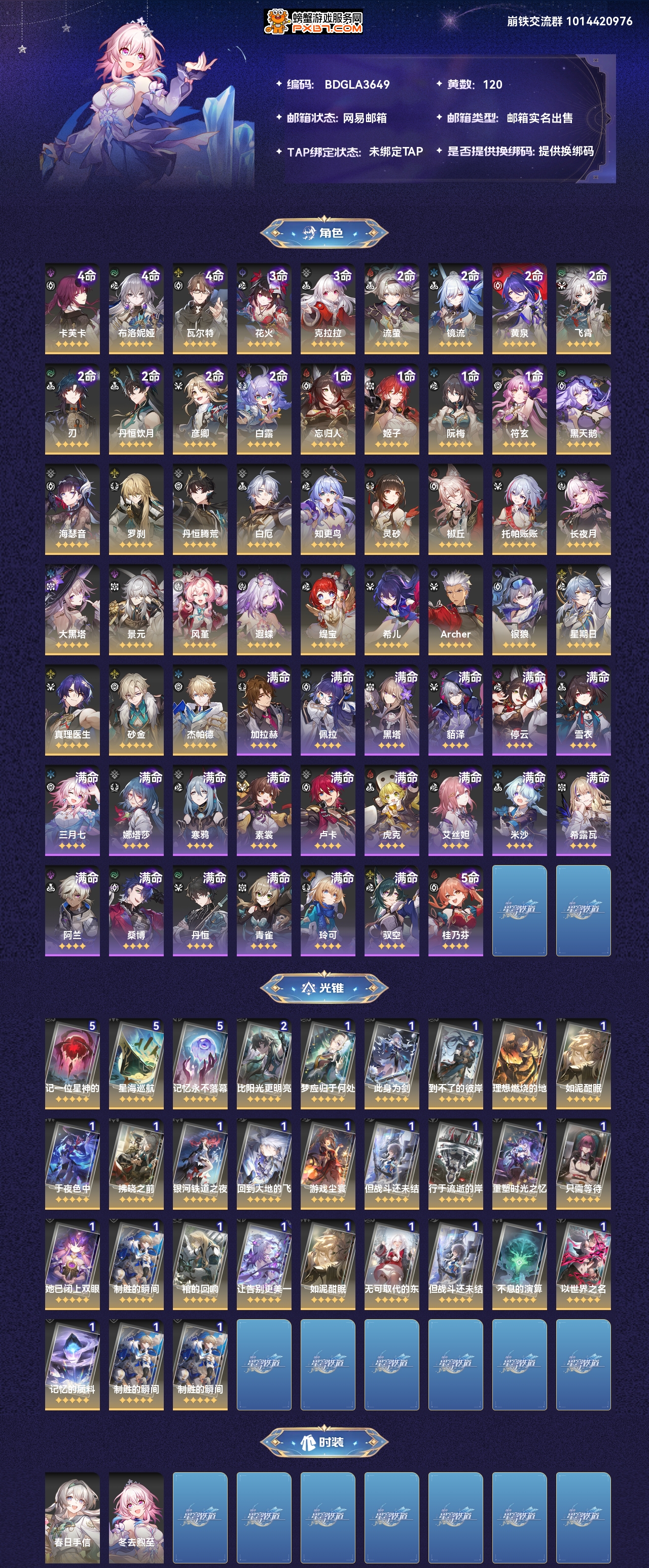【崩坏·星穹铁道】【lyxq7557】冒险等级:70,女主,五星数量:65,绑定情况:邮箱__五星角色:卡芙卡 4命|布洛妮娅 4命|瓦尔特 4命|花火 3命|克拉拉 3命|流萤 2命|镜流 2命|黄泉 2命|飞霄 2命|刃 2命|丹恒·饮月 2命|彦卿 2命|白露 2命|忘归人 1命|姬子 1命|阮·梅 1命|符玄 1命|黑天鹅|海瑟音|罗刹|丹恒·腾荒|白厄|知更鸟|灵砂|椒丘|托帕账账|长夜月|大黑塔|景元|风堇|遐蝶|缇宝|希儿|archer|银狼|星期日|真理医生|砂金|杰帕德__五星光锥:记一位星神的陨落 5精|星海巡航 5精|记忆永不落幕 5精|比阳光更明亮的 2精|梦应归于何处|此身为剑|到不了的彼岸|理想燃烧的地狱|如泥酣眠|于夜色中|拂晓之前|银河铁道之夜|回到大地的飞行|游戏尘寰|但战斗还未结束|行于流逝的岸|重塑时光之忆|只需等待|她已闭上双眼|制胜的瞬间|棺的回响|让告别,更美一些|无可取代的东西|不息的演算|以世界之名|记忆的质料,【邮箱已实名】