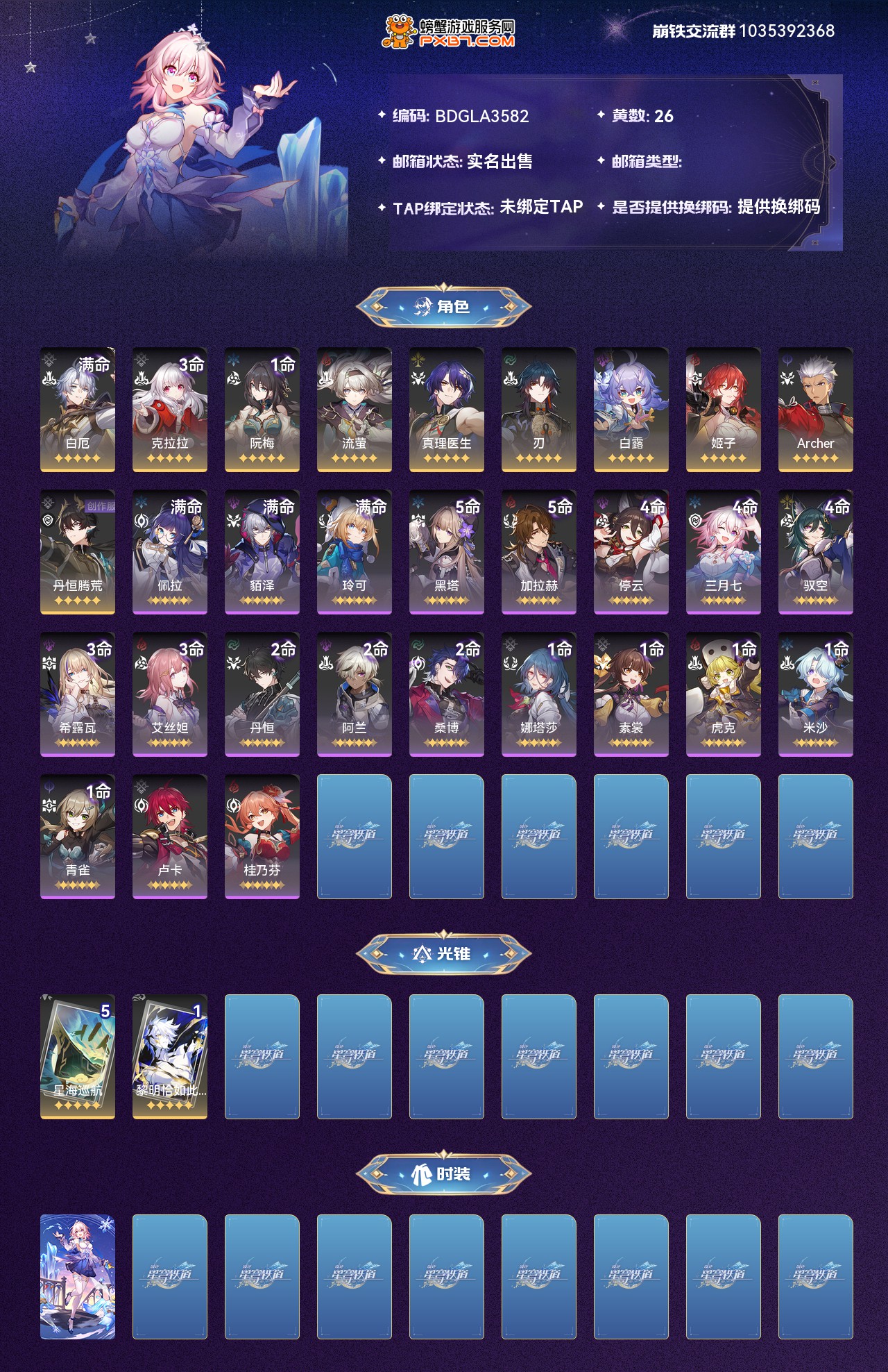 【崩坏·星穹铁道】【lyxq7737】冒险等级:64,女主,五星数量:12,绑定情况:邮箱__五星角色:白厄 6命|克拉拉 3命|阮·梅 1命|真理医生|刃|白露|姬子|archer|丹恒·腾荒|流萤__五星光锥:星海巡航 5精|黎明恰如此燃烧,【邮箱已实名】