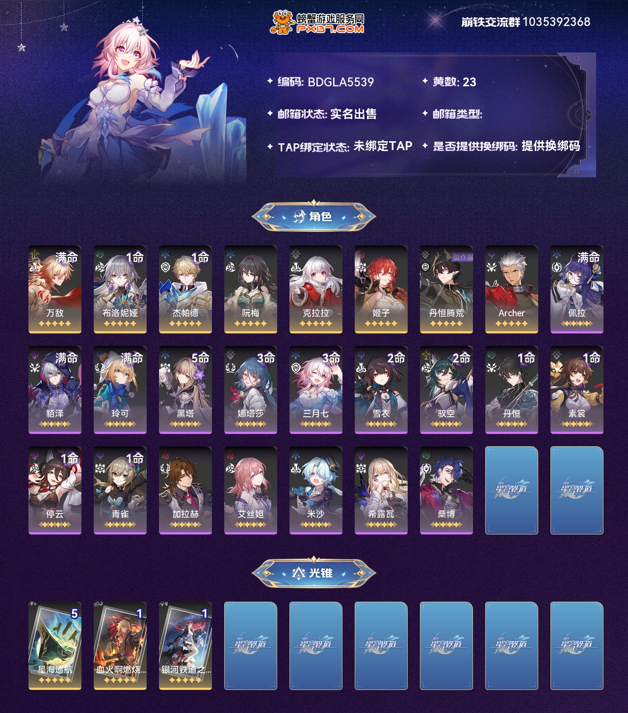 【崩坏·星穹铁道】【lyxq7777】冒险等级:64,女主,五星数量:11,绑定情况:邮箱__五星角色:万敌 6命|布洛妮娅 1命|杰帕德 1命|阮·梅|克拉拉|姬子|丹恒·腾荒|archer__五星光锥:星海巡航 5精|血火啊,燃烧前路|银河铁道之夜,【邮箱已实名】