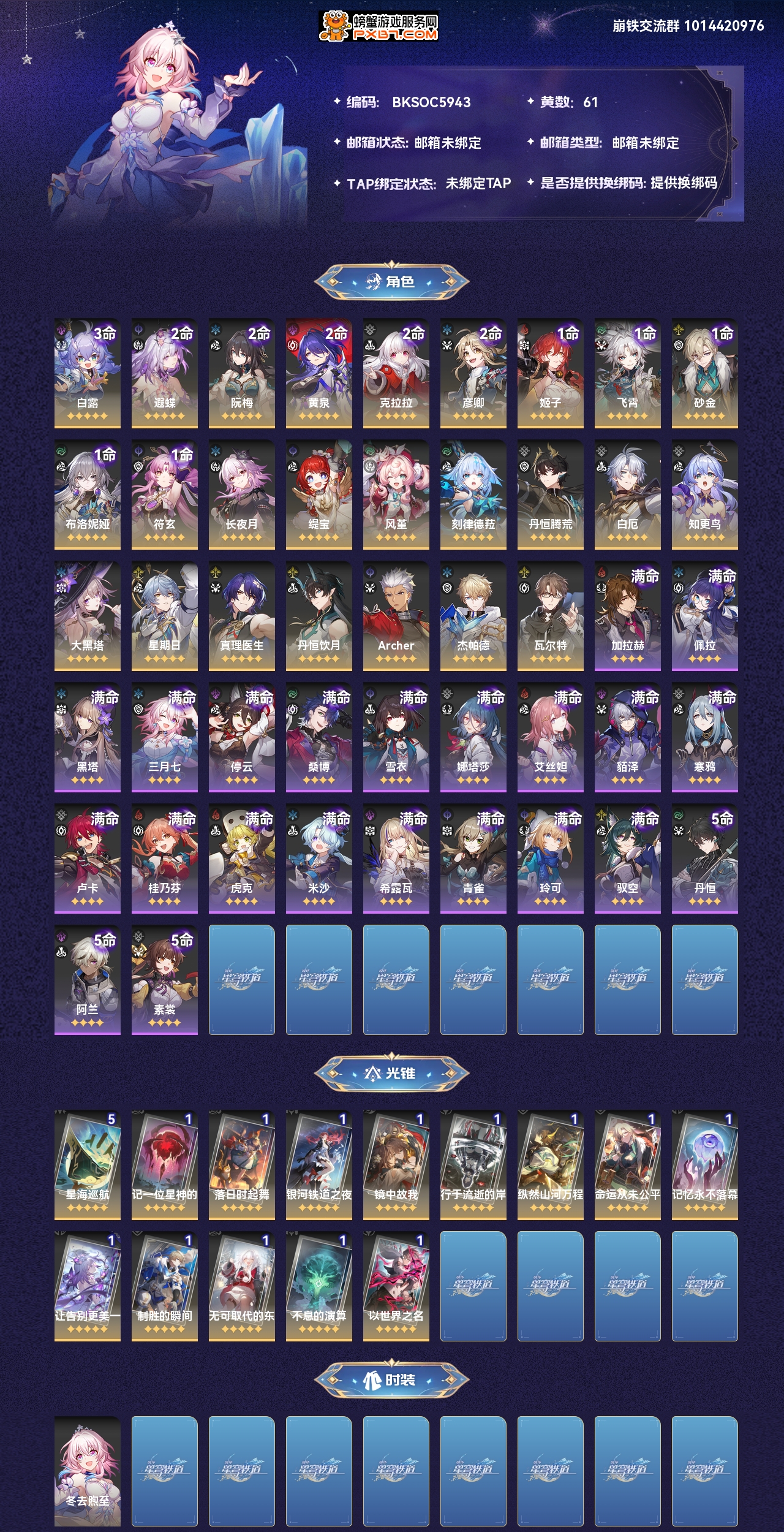 【崩坏·星穹铁道】【lyxq7944】冒险等级:70,男主,五星数量:39,绑定情况:手机号__五星角色:白露 3命|遐蝶 2命|阮·梅 2命|黄泉 2命|克拉拉 2命|彦卿 2命|姬子 1命|飞霄 1命|砂金 1命|布洛妮娅 1命|符玄 1命|长夜月|缇宝|风堇|刻律德菈|丹恒·腾荒|白厄|知更鸟|大黑塔|星期日|真理医生|丹恒·饮月|archer|杰帕德|瓦尔特__五星光锥:星海巡航 5精|记一位星神的陨落|落日时起舞|银河铁道之夜|镜中故我|行于流逝的岸|纵然山河万程|命运从未公平|记忆永不落幕|让告别,更美一些|制胜的瞬间|无可取代的东西|不息的演算|以世界之名,【邮箱未绑定】