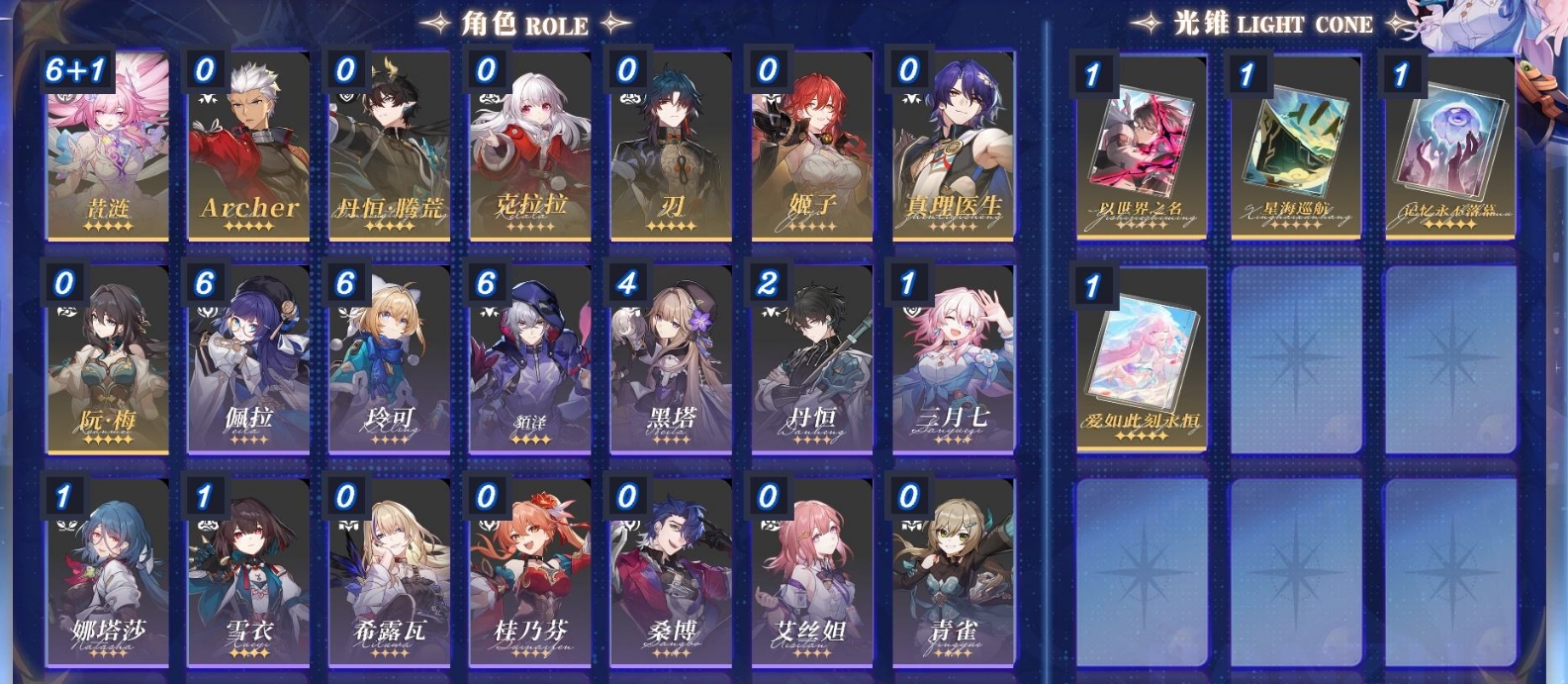 [14727439]m24360,64级女主18黄梦华120星琼663星轨专票2星轨通票08个五星角色:满命昔涟刃丹恒腾荒真理医生姬子archer克拉拉阮梅4个五星光锥:精1星海巡航精1以世界之名精1爱如此刻永恒精1记忆永不落幕