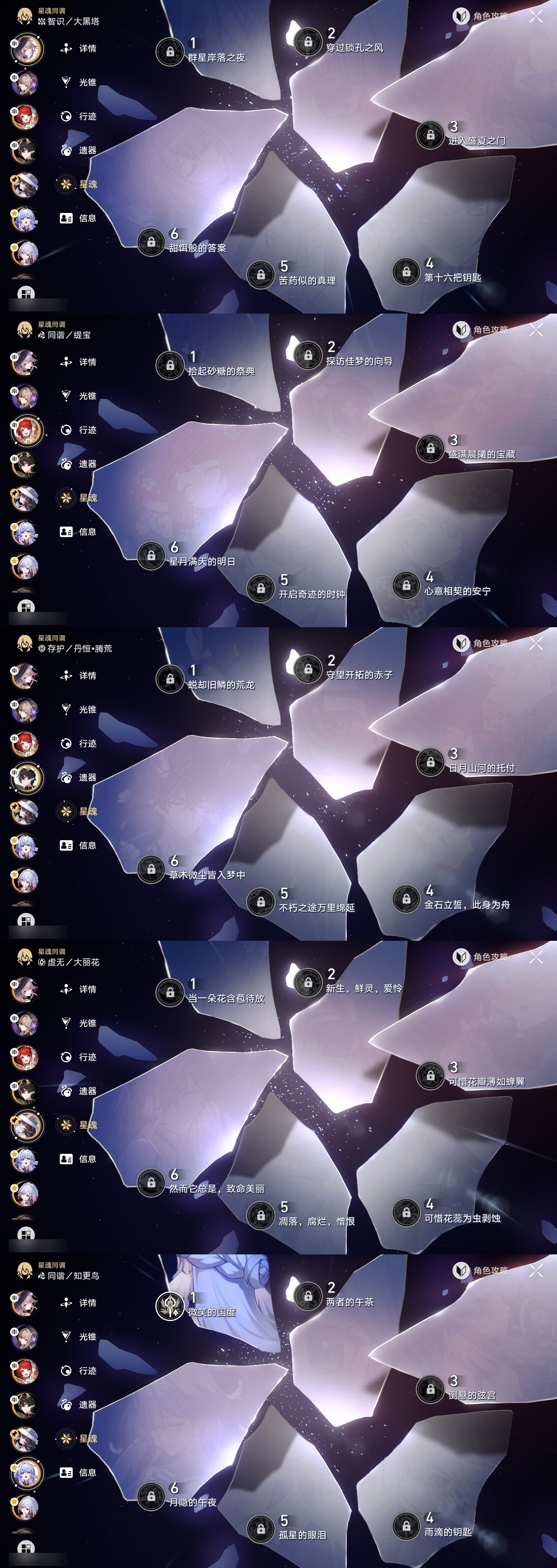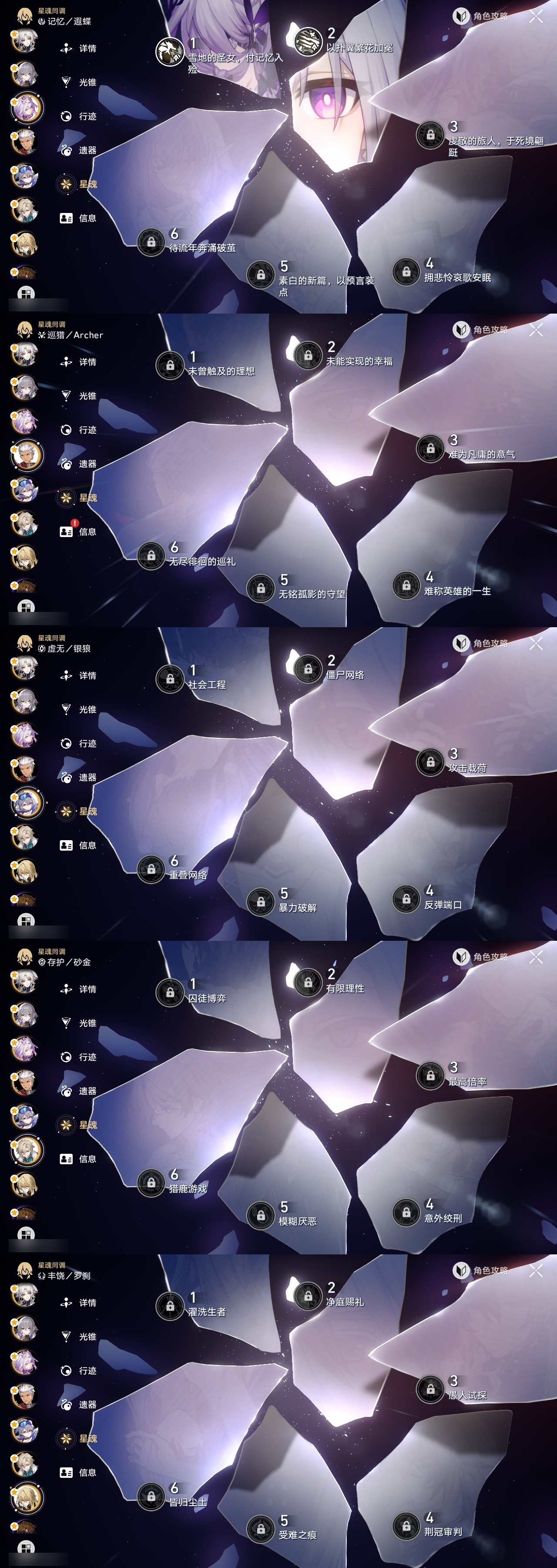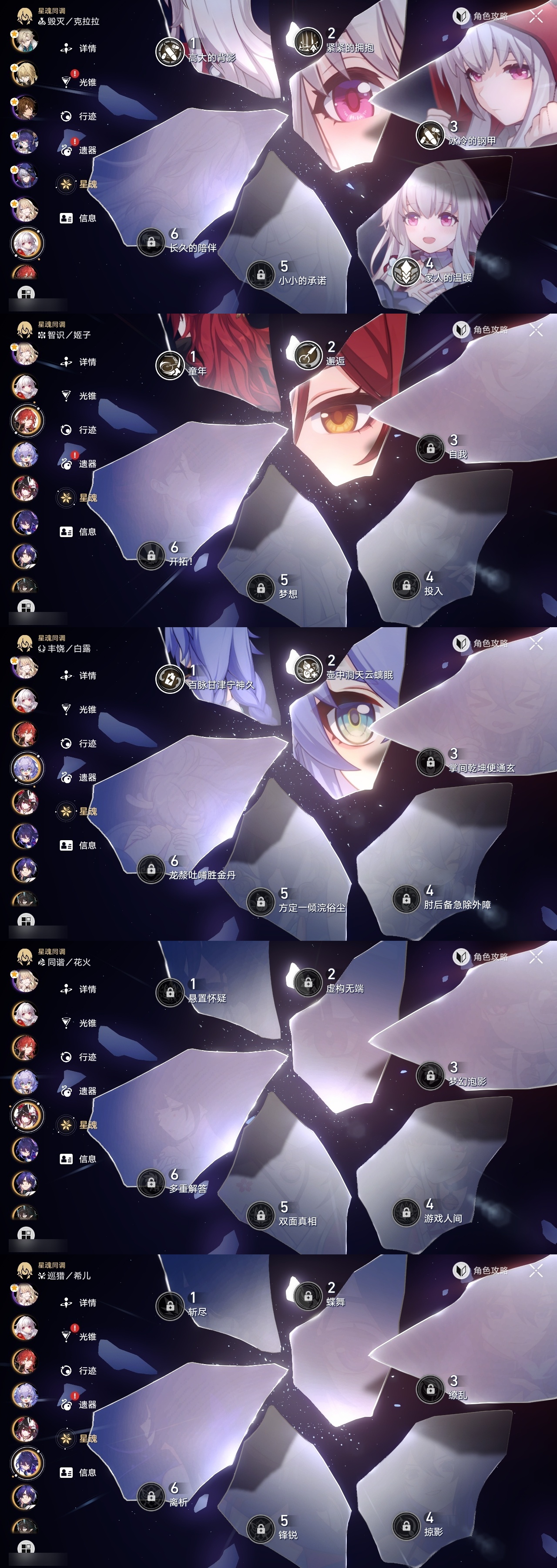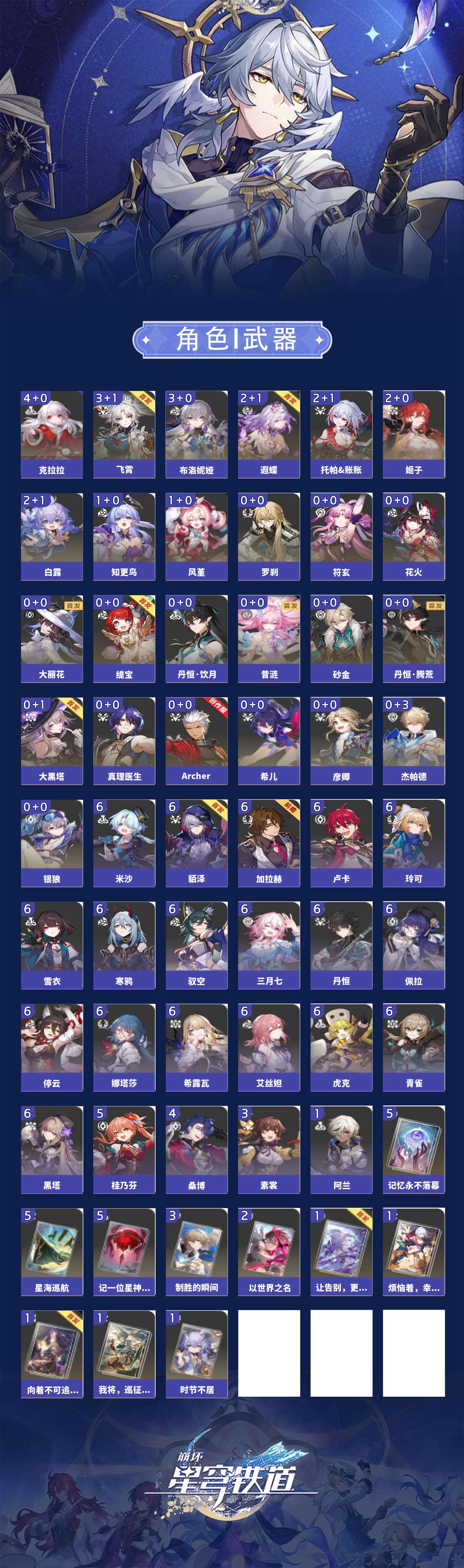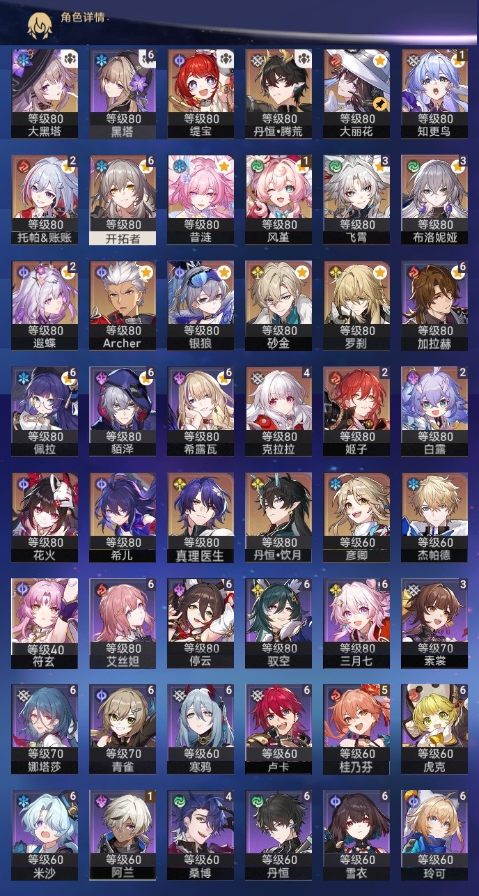 【崩坏·星穹铁道】【lyxq8279】冒险等级:70,女主,五星数量:35,五星角色:克拉拉 4命飞霄 3命布洛妮娅 3命白露 2命姬子 2命遐蝶 2命托帕账账 2命风堇 1命知更鸟 1命银狼希儿杰帕德彦卿大黑塔罗刹缇宝丹恒·饮月符玄真理医生花火砂金archer丹恒·腾荒昔涟大丽花__五星光锥:星海巡航 5精记一位星神的陨落 5精记忆永不落幕 5精制胜的瞬间 3精以世界之名 2精时节不居我将,巡征追猎向着不可追问处让告别,更美一些烦恼着,幸福着__四星角色:娜塔莎 6命虎克 6命貊泽 6命黑塔 6命丹恒 6命艾丝妲 6命希露瓦 6命停云 6命三月七 6命青雀 6命佩拉 6命驭空 6命卢卡 6命玲可 6命寒鸦 6命雪衣 6命米沙 6命加拉赫 6命桂乃芬 5命桑博 4命素裳 3命阿兰 1命