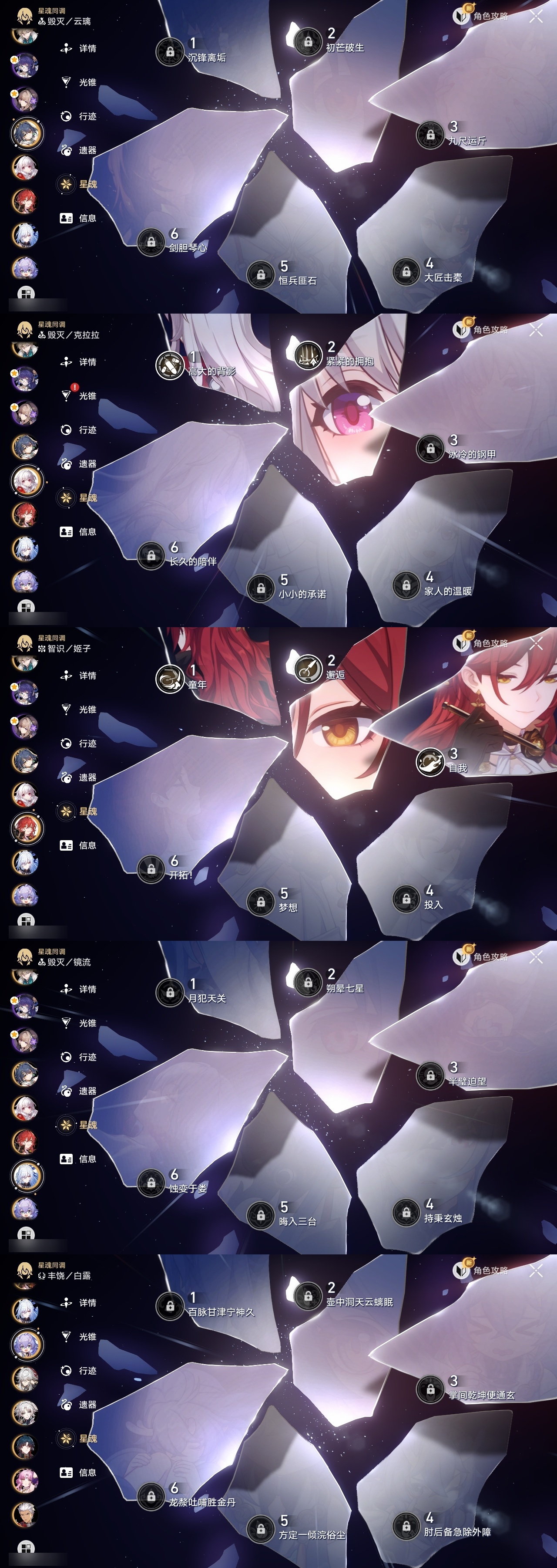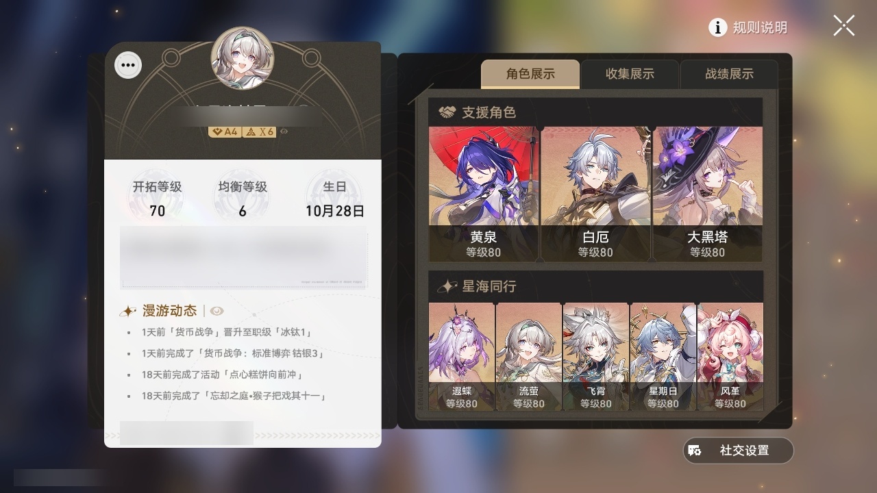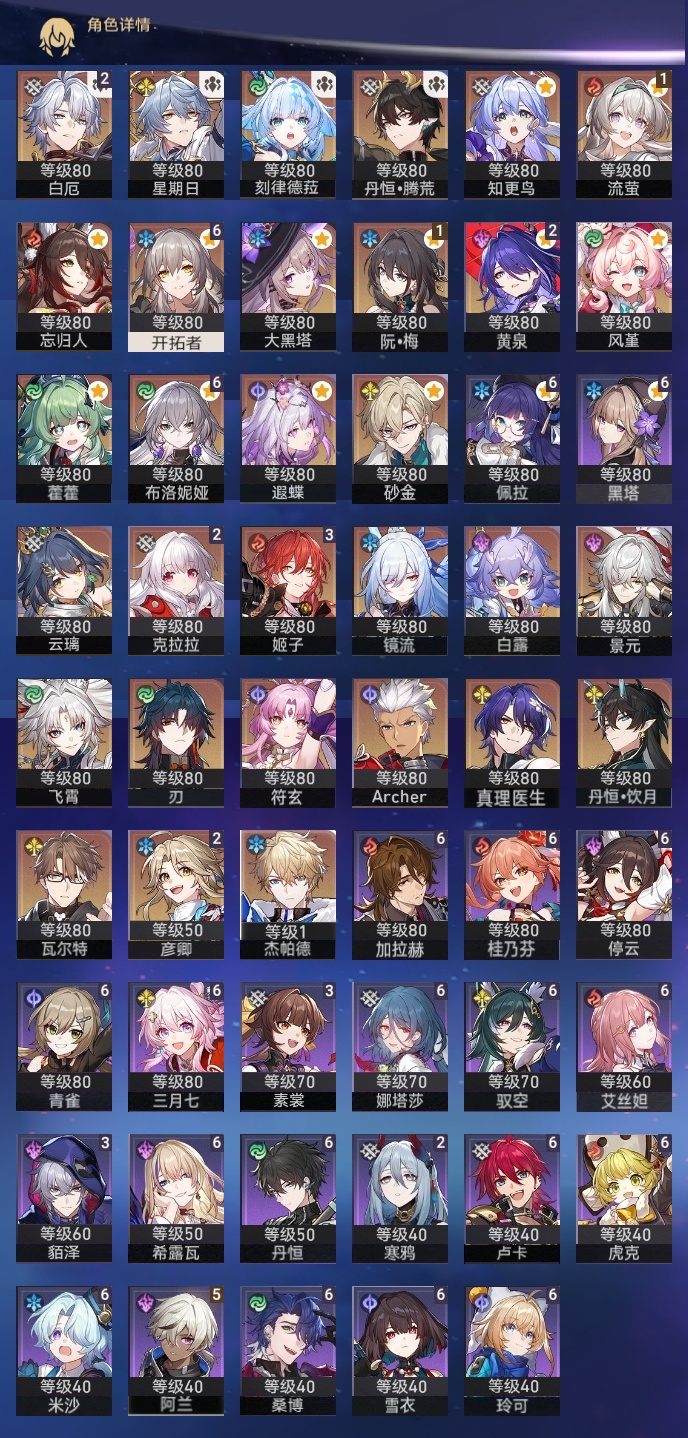 【崩坏·星穹铁道】【lyxq8370】冒险等级:70,女主,五星数量:46,五星角色:布洛妮娅 6命姬子 3命彦卿 2命克拉拉 2命黄泉 2命白厄 2命流萤 1命云璃飞霄景元白露杰帕德瓦尔特星期日大黑塔忘归人刃丹恒·饮月遐蝶符玄镜流藿藿真理医生风堇砂金知更鸟archer刻律德菈丹恒·腾荒__五星光锥:星海巡航 5精记一位星神的陨落 5精记忆永不落幕 5精记忆的质料 2精如泥酣眠 2精制胜的瞬间银河铁道之夜以世界之名但战斗还未结束拂晓之前此身为剑纯粹思维的洗礼行于流逝的岸夜色流光溢彩黎明恰如此燃烧理想燃烧的地狱梦应归于何处__四星角色:娜塔莎 6命虎克 6命黑塔 6命丹恒 6命艾丝妲 6命希露瓦 6命停云 6命桑博 6命三月七 6命青雀 6命佩拉 6命驭空 6命卢卡 6命玲可 6命桂乃芬 6命雪衣 6命米沙 6命加拉赫 6命阿兰 5命貊泽 3命素裳 3命寒鸦 2命
