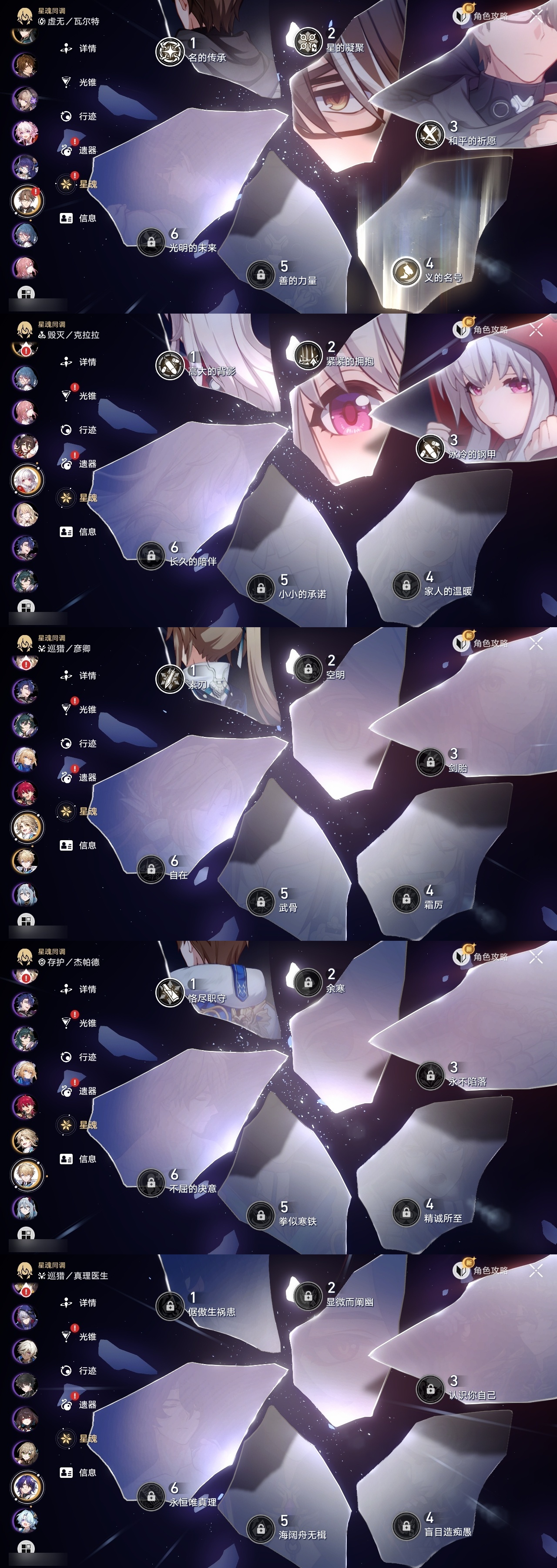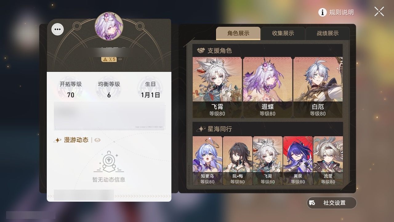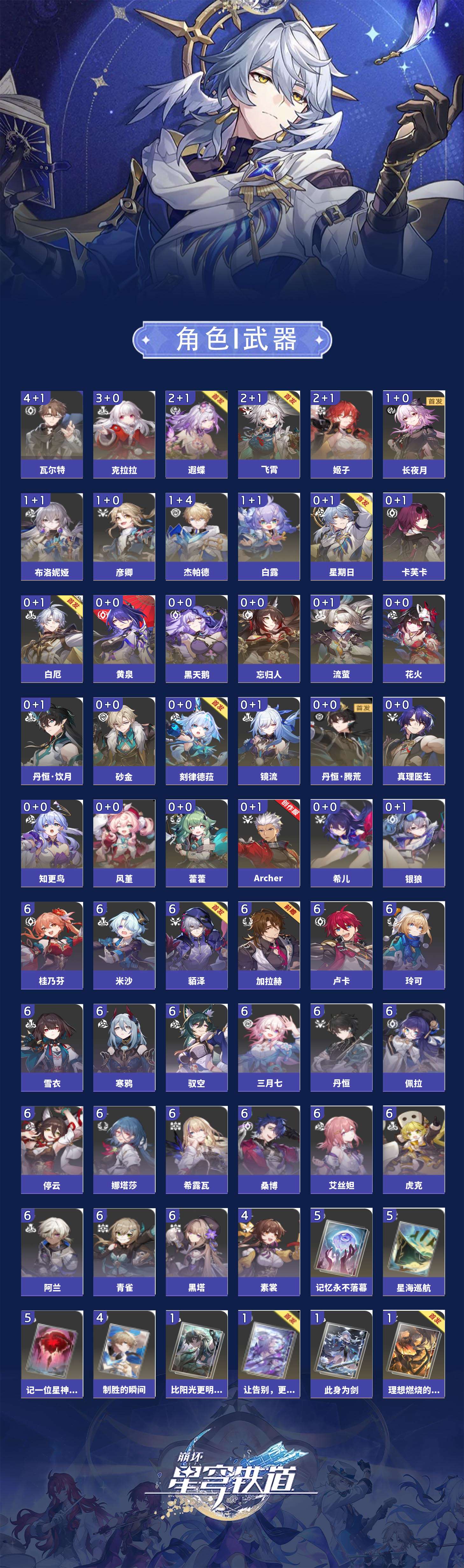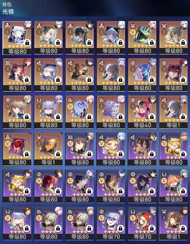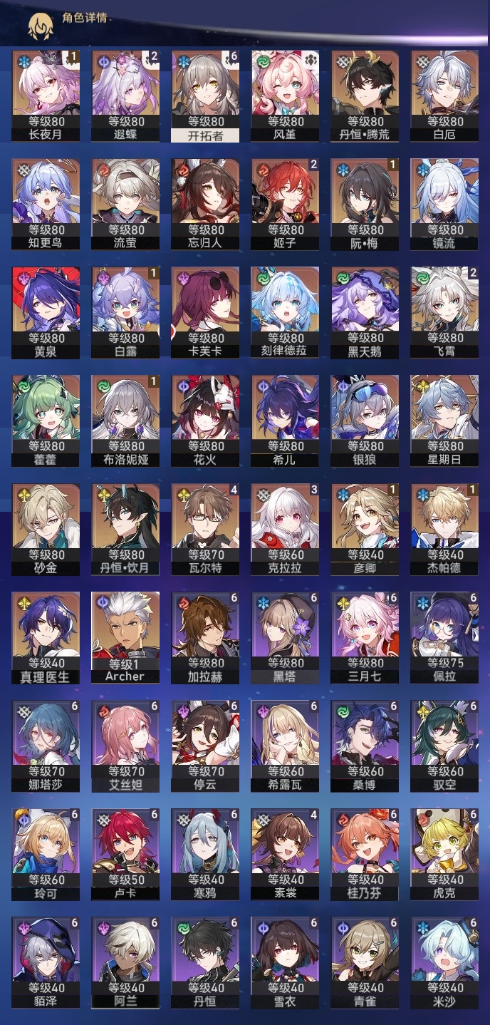 【崩坏·星穹铁道】【lyxq8450】冒险等级:70,女主,五星数量:50,五星角色:瓦尔特 4命克拉拉 3命飞霄 2命姬子 2命遐蝶 2命白露 1命布洛妮娅 1命杰帕德 1命彦卿 1命长夜月 1命银狼希儿星期日忘归人卡芙卡丹恒·饮月镜流藿藿真理医生黑天鹅花火黄泉风堇砂金知更鸟白厄archer刻律德菈丹恒·腾荒流萤__五星光锥:星海巡航 5精记一位星神的陨落 5精记忆永不落幕 5精制胜的瞬间 4精银河铁道之夜以世界之名时节不居但战斗还未结束但战斗还未结束雨一直下我将,巡征追猎回到大地的飞行只需等待比阳光更明亮的让告别,更美一些此身为剑镜中故我黎明恰如此燃烧理想燃烧的地狱梦应归于何处__四星角色:阿兰 6命娜塔莎 6命虎克 6命貊泽 6命黑塔 6命丹恒 6命艾丝妲 6命希露瓦 6命停云 6命桑博 6命三月七 6命青雀 6命佩拉 6命驭空 6命卢卡 6命玲可 6命桂乃芬 6命寒鸦 6命雪衣 6命米沙 6命加拉赫 6命素裳 4命