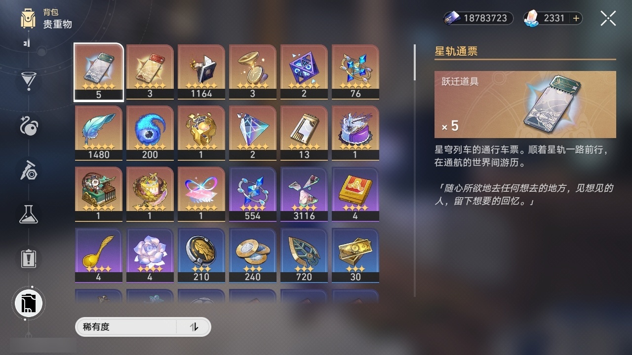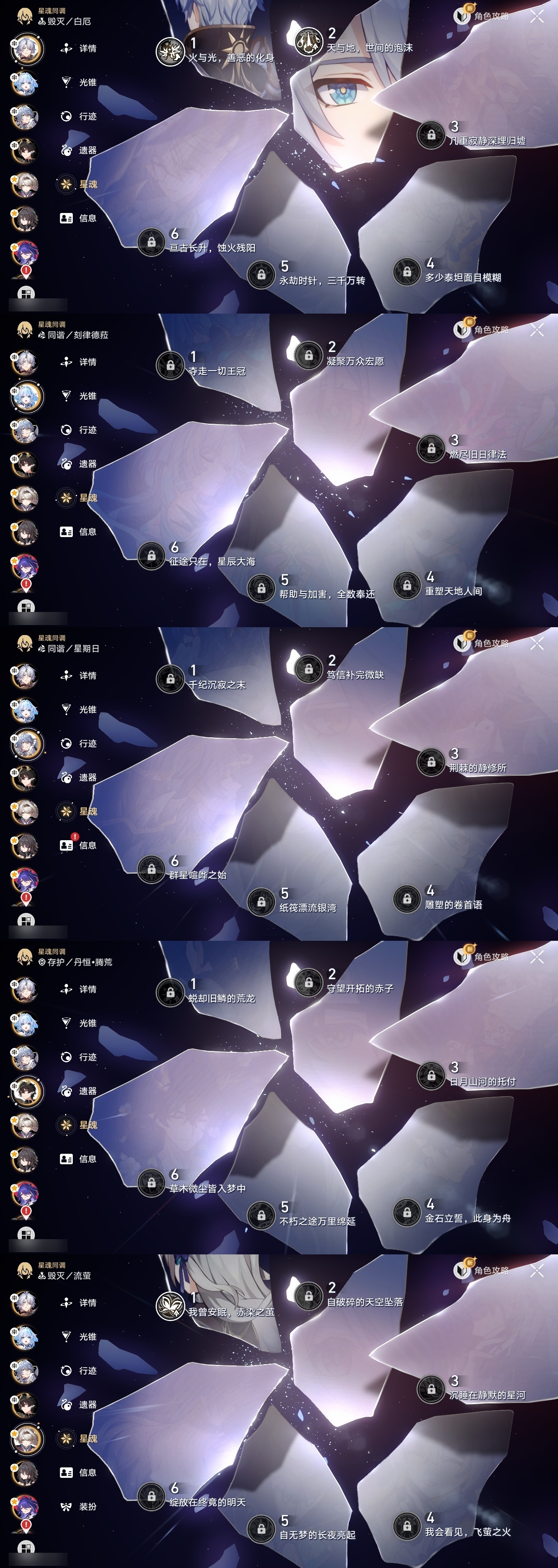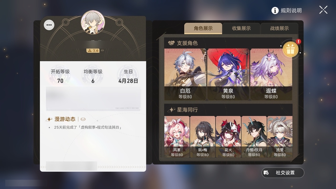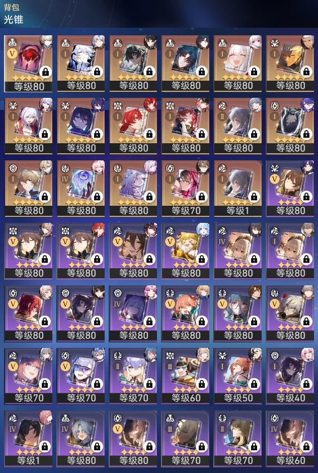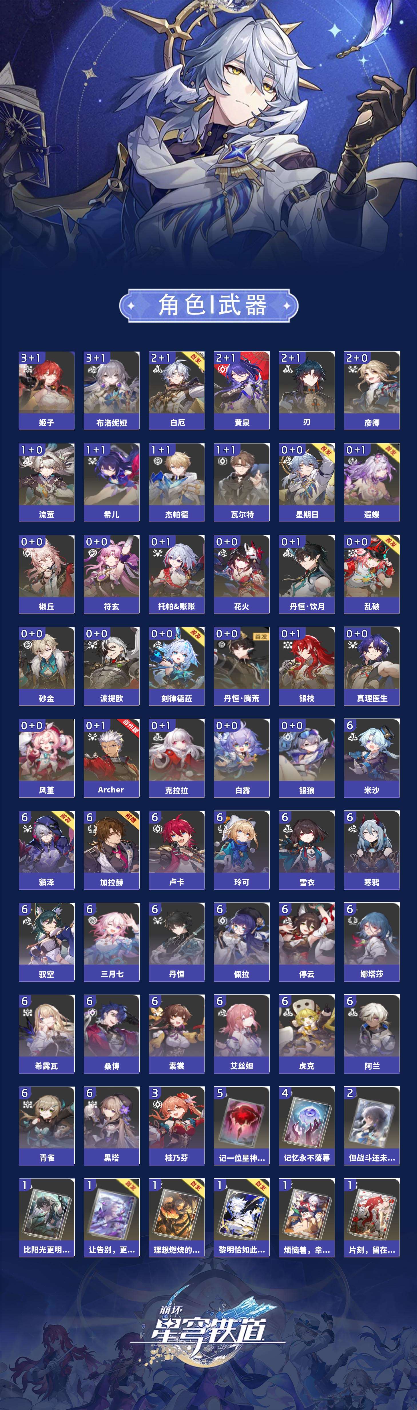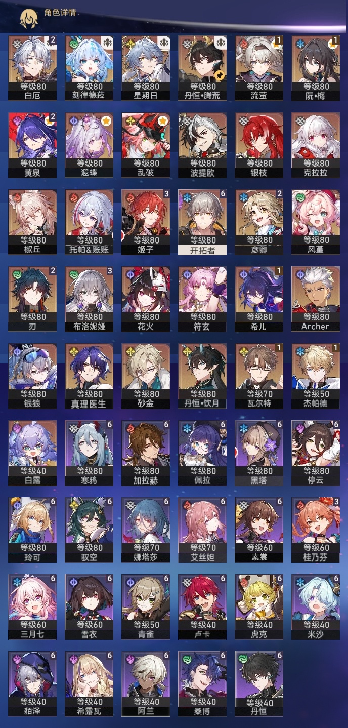 【崩坏·星穹铁道】【lyxq8476】冒险等级:70,男主,五星数量:46,五星角色:布洛妮娅 3命姬子 3命彦卿 2命刃 2命黄泉 2命白厄 2命希儿 1命杰帕德 1命瓦尔特 1命流萤 1命椒丘银狼白露克拉拉乱破星期日丹恒·饮月遐蝶符玄托帕账账银枝真理医生花火风堇砂金archer刻律德菈丹恒·腾荒波提欧__五星光锥:记一位星神的陨落 5精记忆永不落幕 4精但战斗还未结束 2精制胜的瞬间银河铁道之夜以世界之名无可取代的东西但战斗还未结束于夜色中到不了的彼岸比阳光更明亮的让告别,更美一些烦恼着,幸福着片刻,留在眼底行于流逝的岸黎明恰如此燃烧理想燃烧的地狱__四星角色:阿兰 6命娜塔莎 6命虎克 6命貊泽 6命黑塔 6命丹恒 6命艾丝妲 6命希露瓦 6命停云 6命素裳 6命桑博 6命三月七 6命青雀 6命佩拉 6命驭空 6命卢卡 6命玲可 6命寒鸦 6命雪衣 6命米沙 6命加拉赫 6命桂乃芬 3命