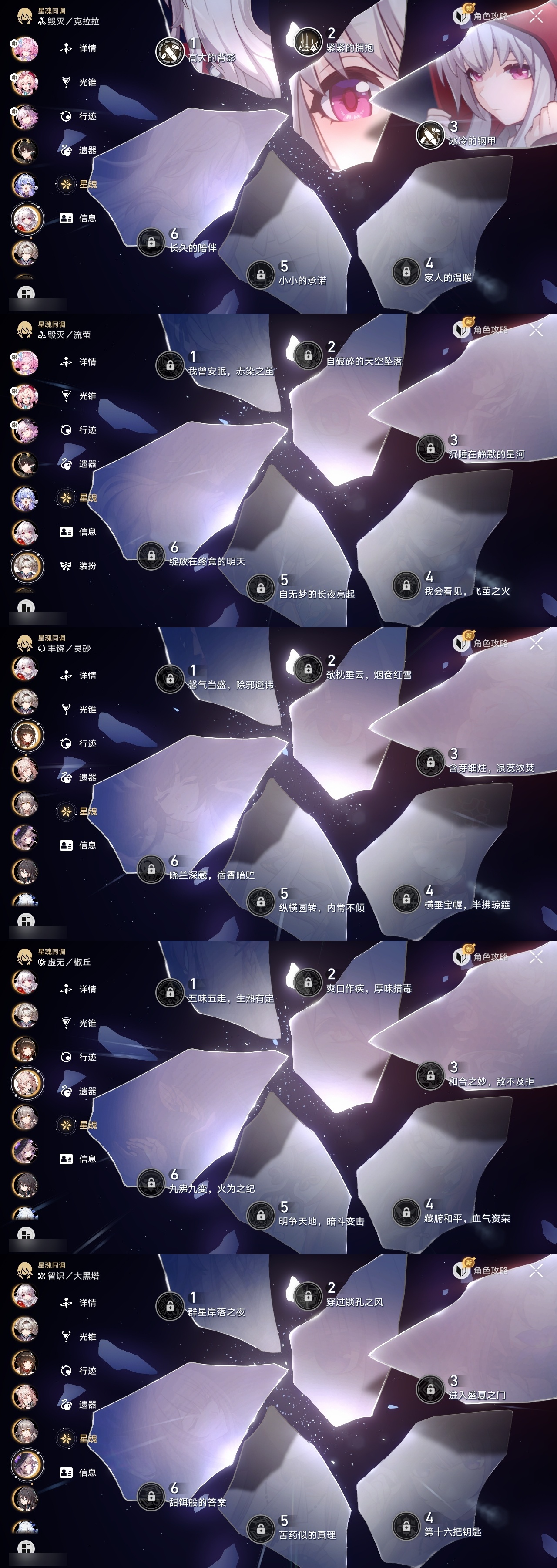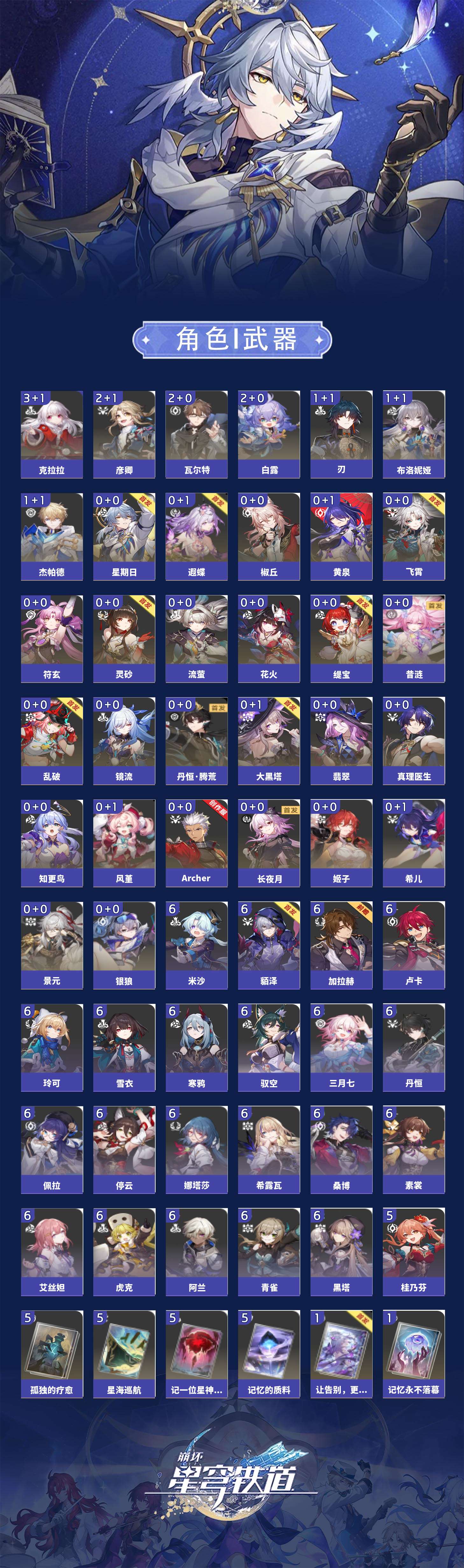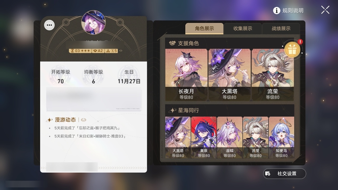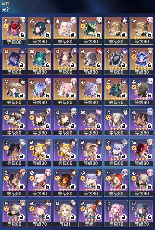 【崩坏·星穹铁道】【lyxq8498】冒险等级:70,女主,五星数量:49,五星角色:克拉拉 3命白露 2命彦卿 2命瓦尔特 2命布洛妮娅 1命杰帕德 1命刃 1命椒丘飞霄银狼景元希儿姬子灵砂乱破星期日大黑塔缇宝遐蝶符玄镜流真理医生花火黄泉风堇知更鸟archer长夜月丹恒·腾荒昔涟流萤翡翠__五星光锥:星海巡航 5精记忆的质料 5精记一位星神的陨落 5精孤独的疗愈 5精不息的演算 3精制胜的瞬间无可取代的东西如泥酣眠如泥酣眠但战斗还未结束于夜色中向着不可追问处到不了的彼岸让告别,更美一些行于流逝的岸愿虹光永驻天空记忆永不落幕__四星角色:阿兰 6命娜塔莎 6命虎克 6命貊泽 6命黑塔 6命丹恒 6命艾丝妲 6命希露瓦 6命停云 6命素裳 6命桑博 6命三月七 6命青雀 6命佩拉 6命驭空 6命卢卡 6命玲可 6命寒鸦 6命雪衣 6命米沙 6命加拉赫 6命桂乃芬 5命