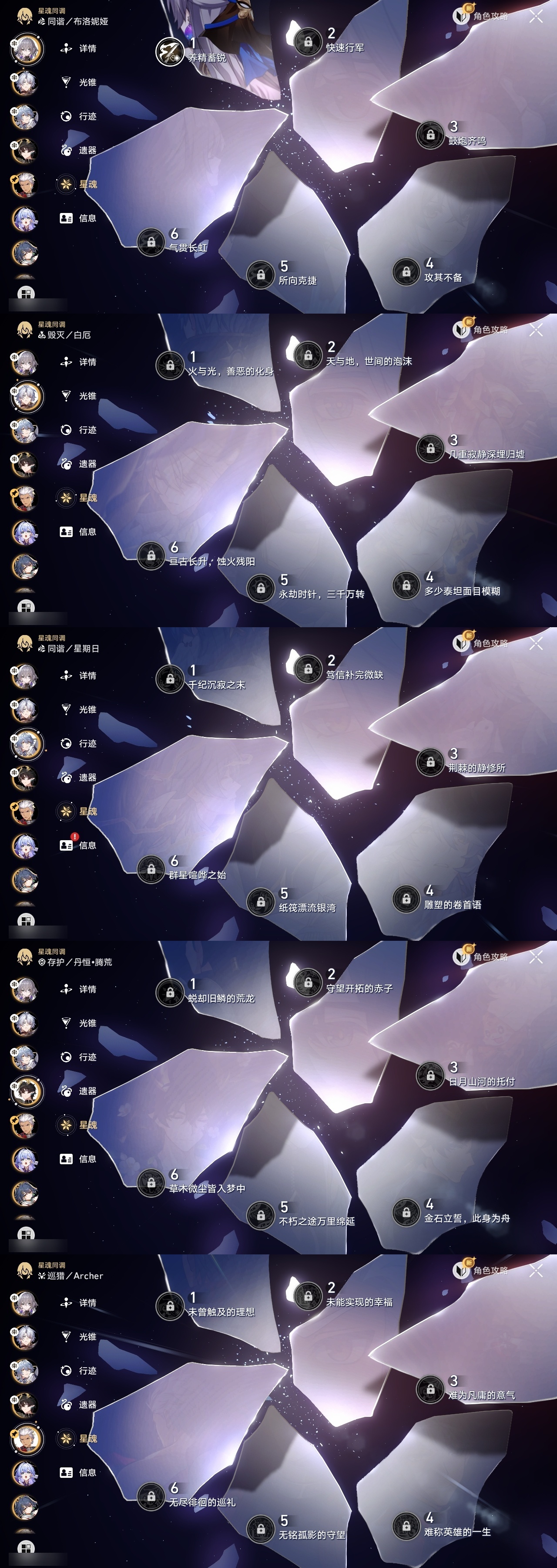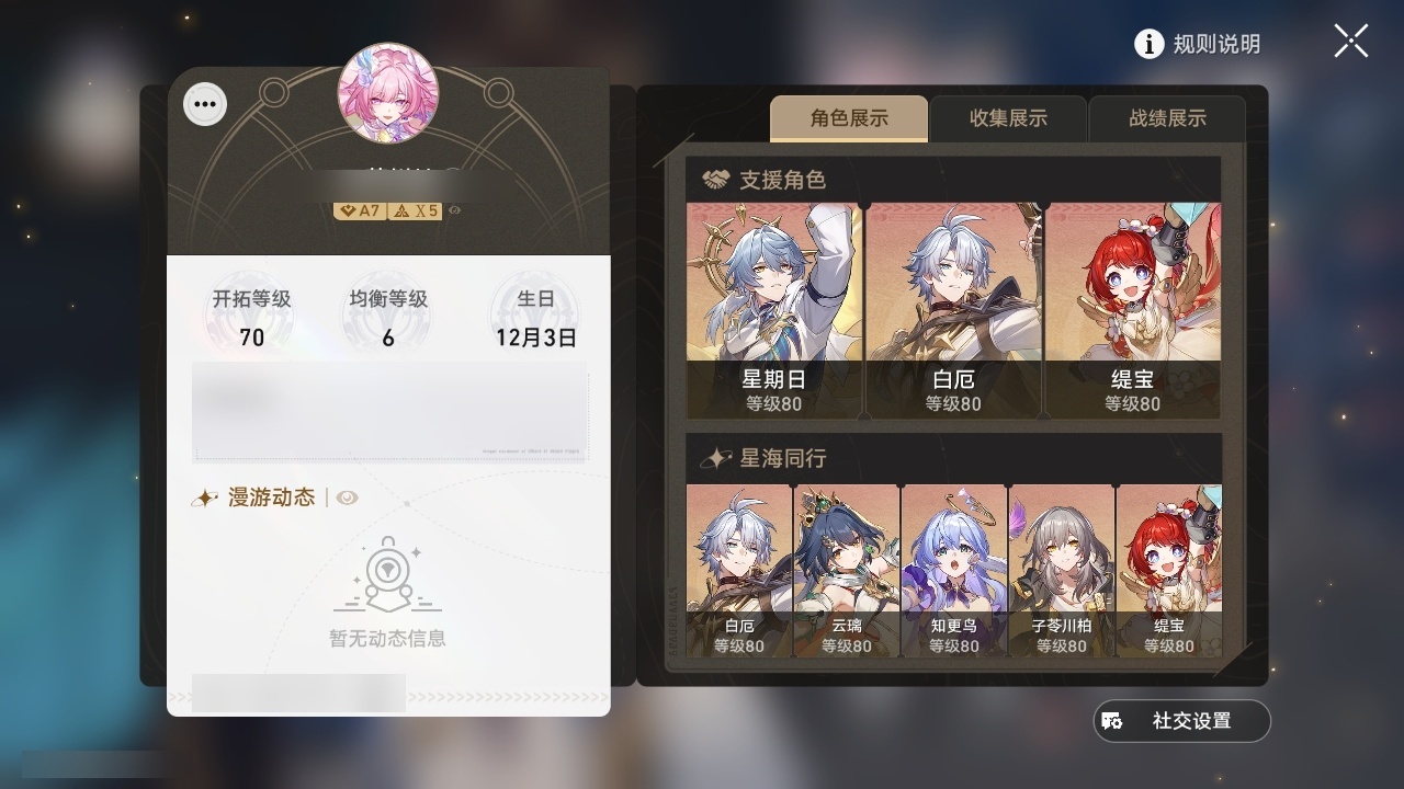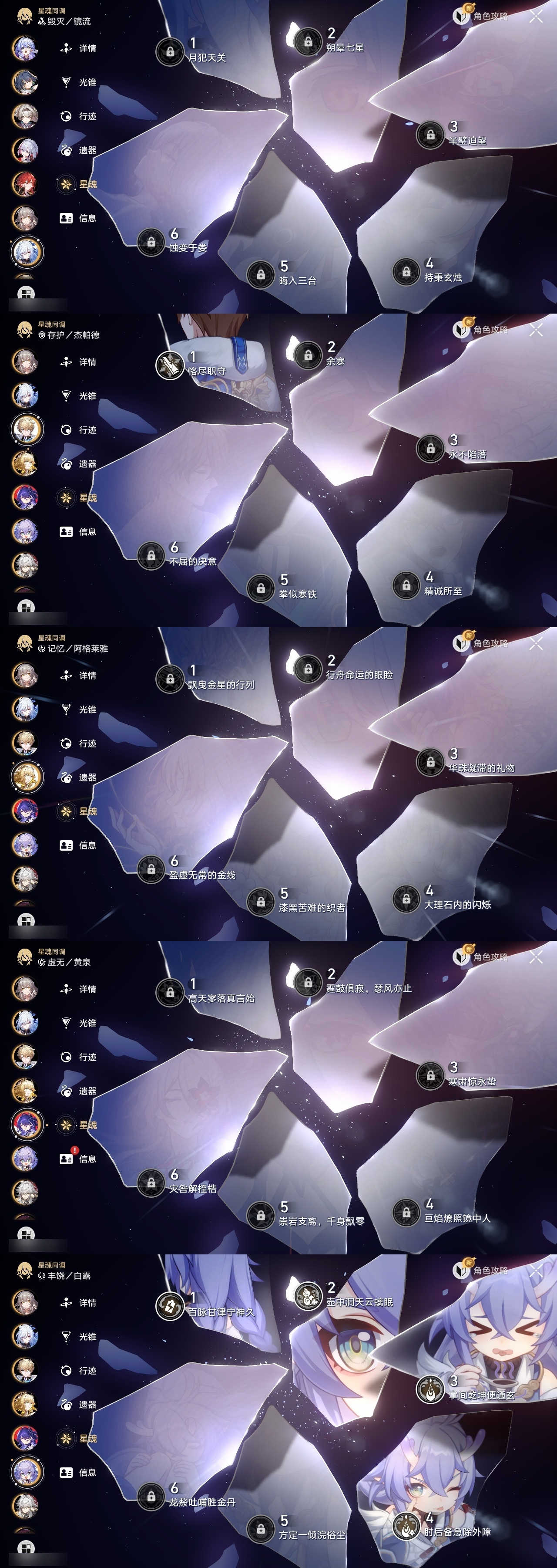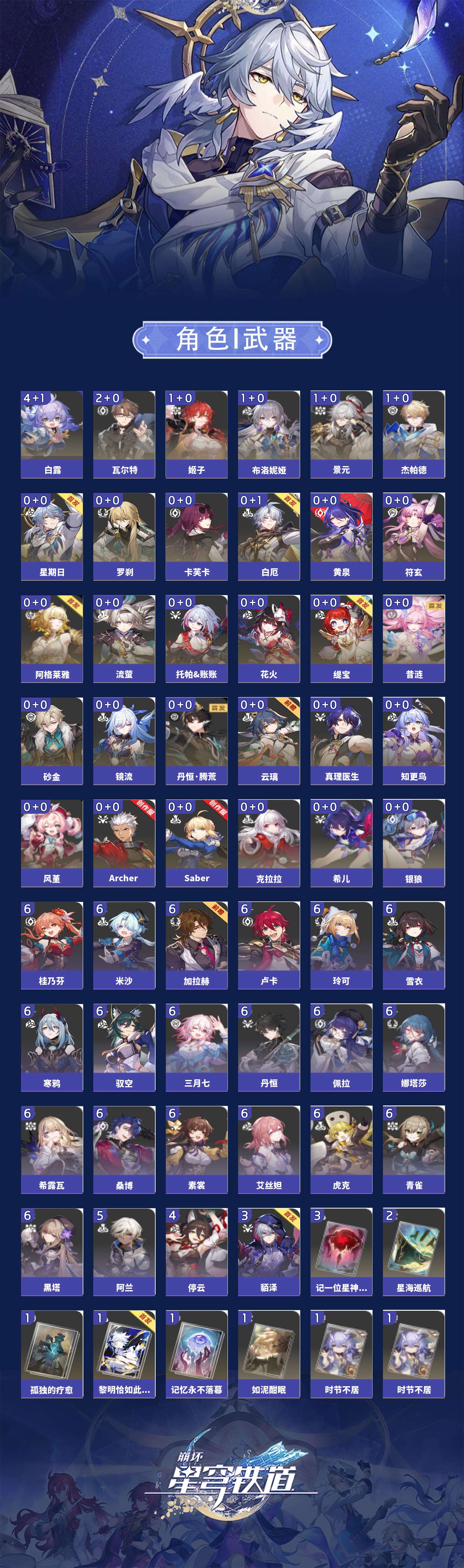 【崩坏·星穹铁道】【lyxq8479】冒险等级:70,女主,五星数量:40,五星角色:白露 4命瓦尔特 2命景元 1命布洛妮娅 1命姬子 1命杰帕德 1命云璃银狼希儿克拉拉星期日罗刹阿格莱雅缇宝卡芙卡符玄镜流托帕账账真理医生花火黄泉风堇砂金知更鸟白厄saberarcher丹恒·腾荒昔涟流萤__五星光锥:记一位星神的陨落 3精不息的演算 3精星海巡航 2精时节不居时节不居时节不居如泥酣眠孤独的疗愈记忆永不落幕黎明恰如此燃烧__四星角色:娜塔莎 6命虎克 6命黑塔 6命丹恒 6命艾丝妲 6命希露瓦 6命素裳 6命桑博 6命三月七 6命青雀 6命佩拉 6命驭空 6命卢卡 6命玲可 6命桂乃芬 6命寒鸦 6命雪衣 6命米沙 6命加拉赫 6命阿兰 5命停云 4命貊泽 3命