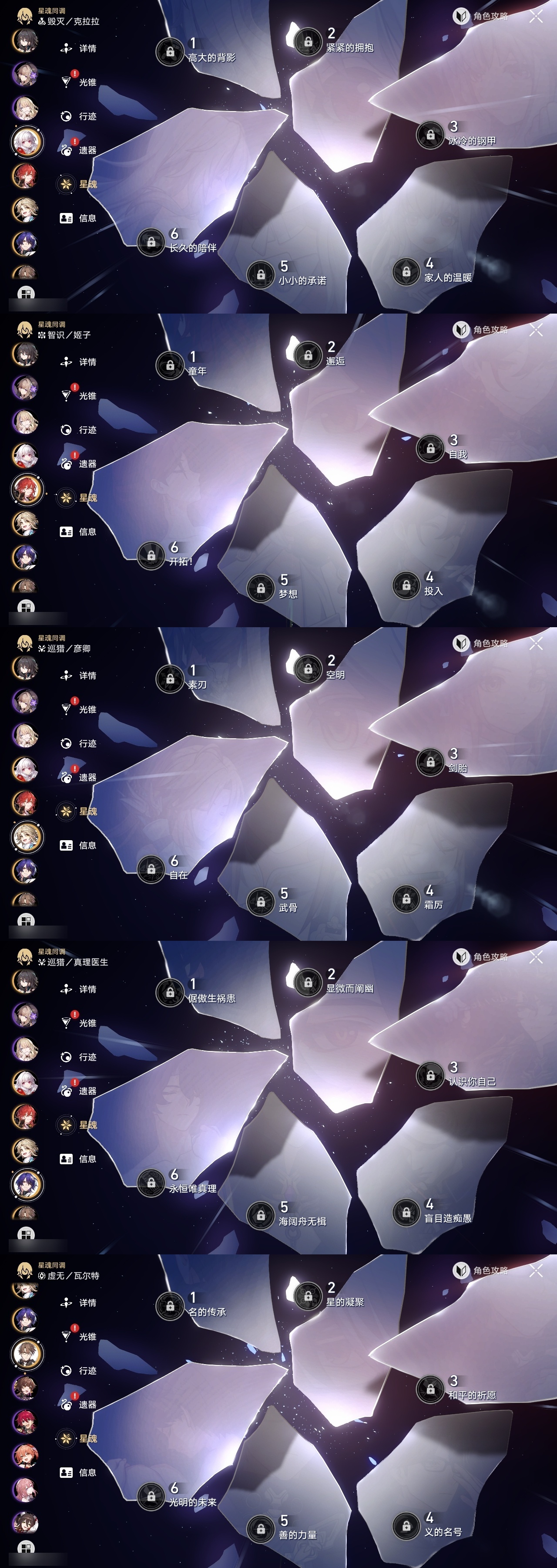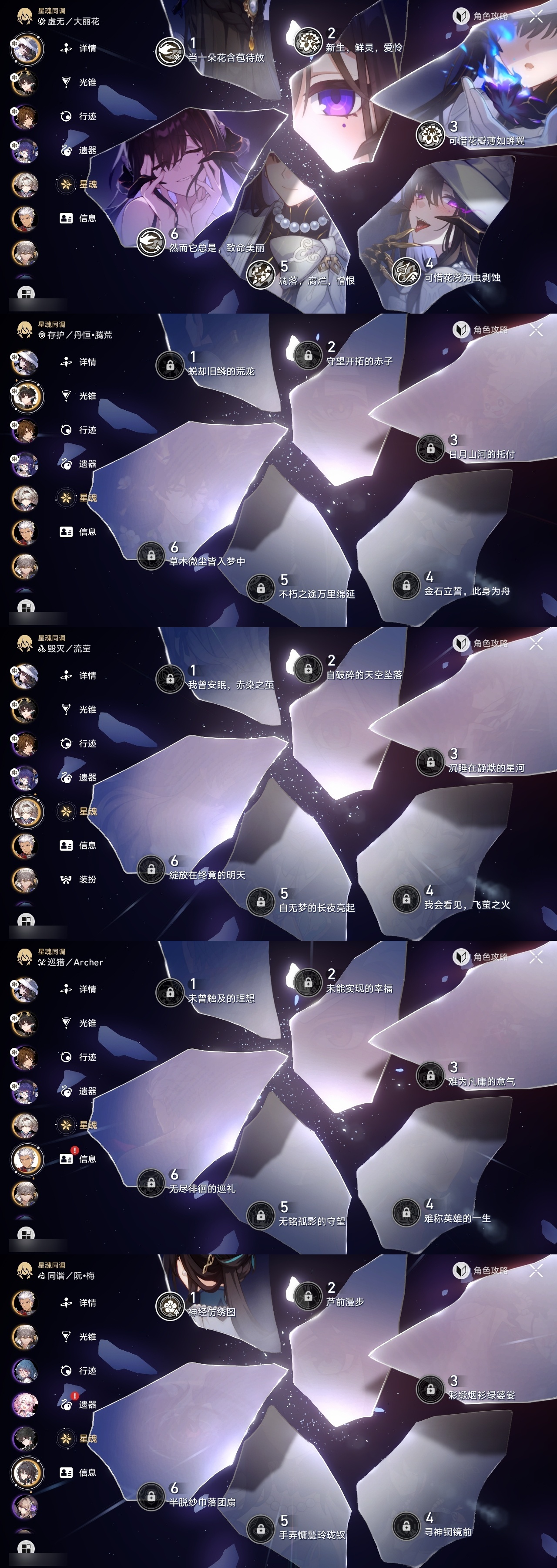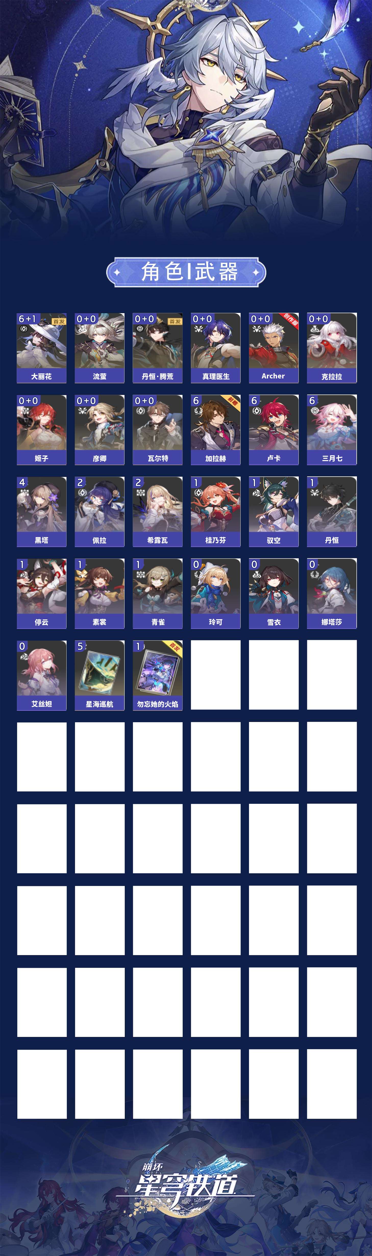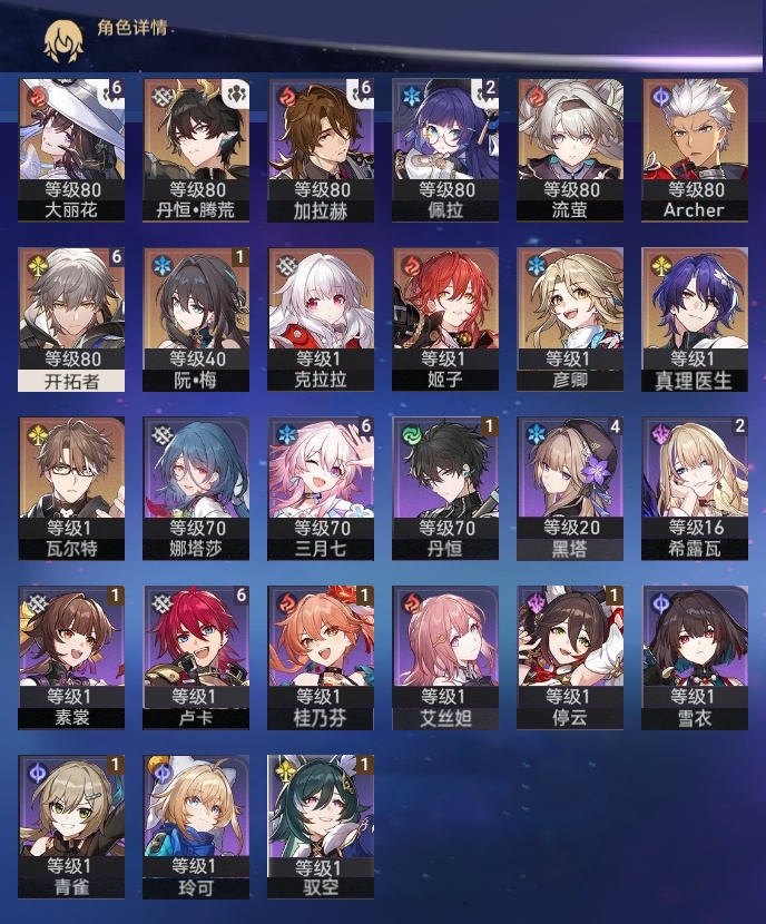 【崩坏·星穹铁道】【lyxq8445】冒险等级:62,男主,五星数量:11,五星角色:大丽花 6命姬子彦卿瓦尔特克拉拉真理医生archer丹恒·腾荒流萤__五星光锥:星海巡航 5精勿忘她的火焰__四星角色:三月七 6命卢卡 6命加拉赫 6命黑塔 4命希露瓦 2命佩拉 2命丹恒 1命停云 1命素裳 1命青雀 1命驭空 1命桂乃芬 1命娜塔莎艾丝妲玲可雪衣