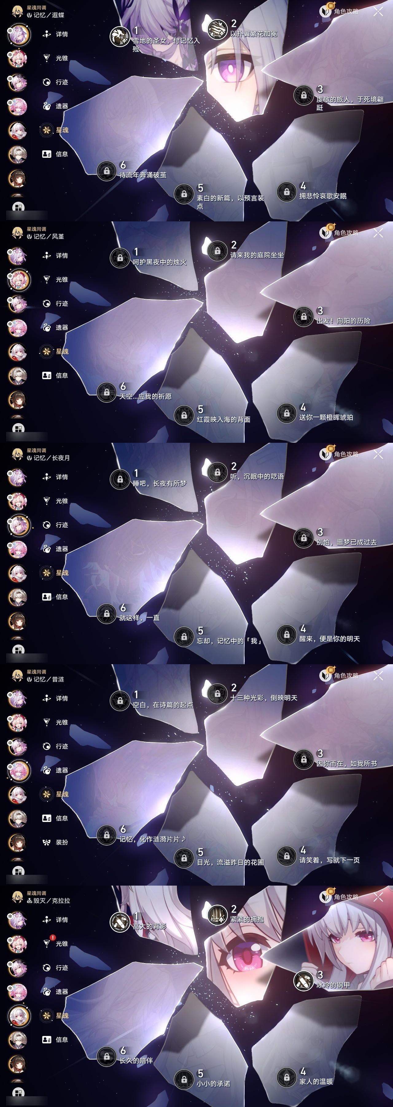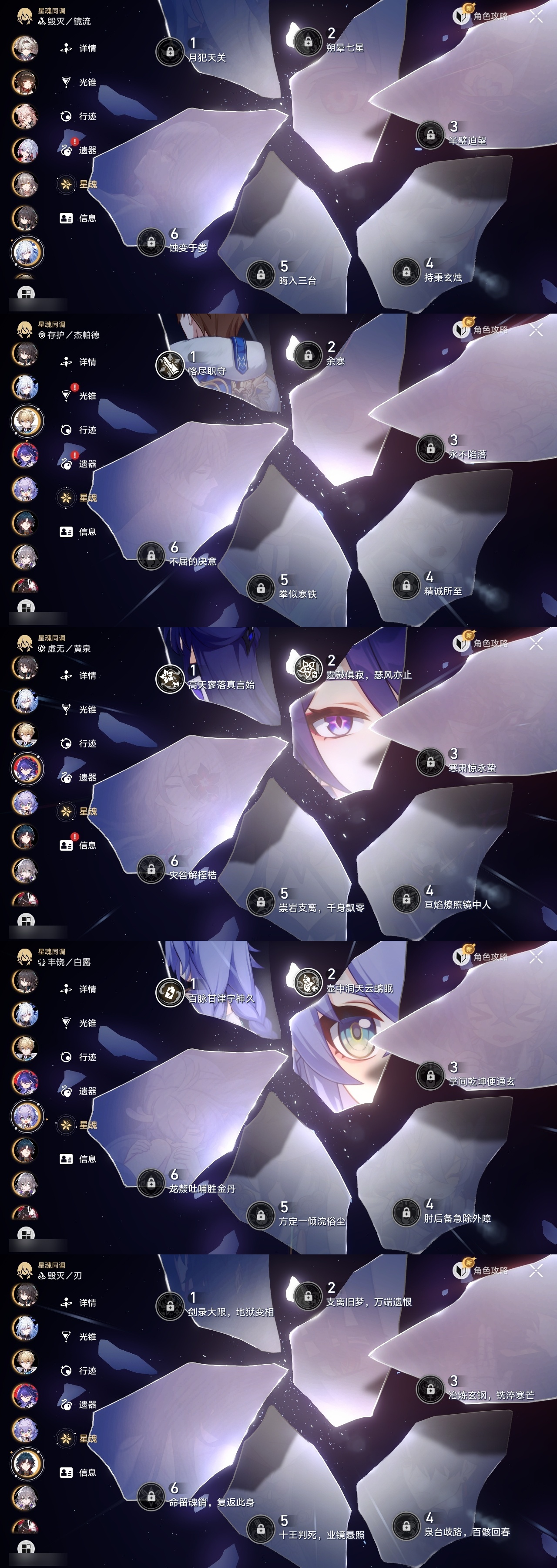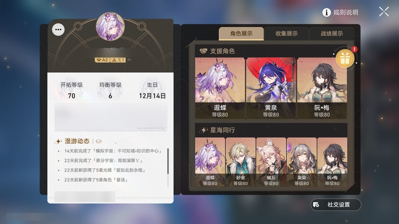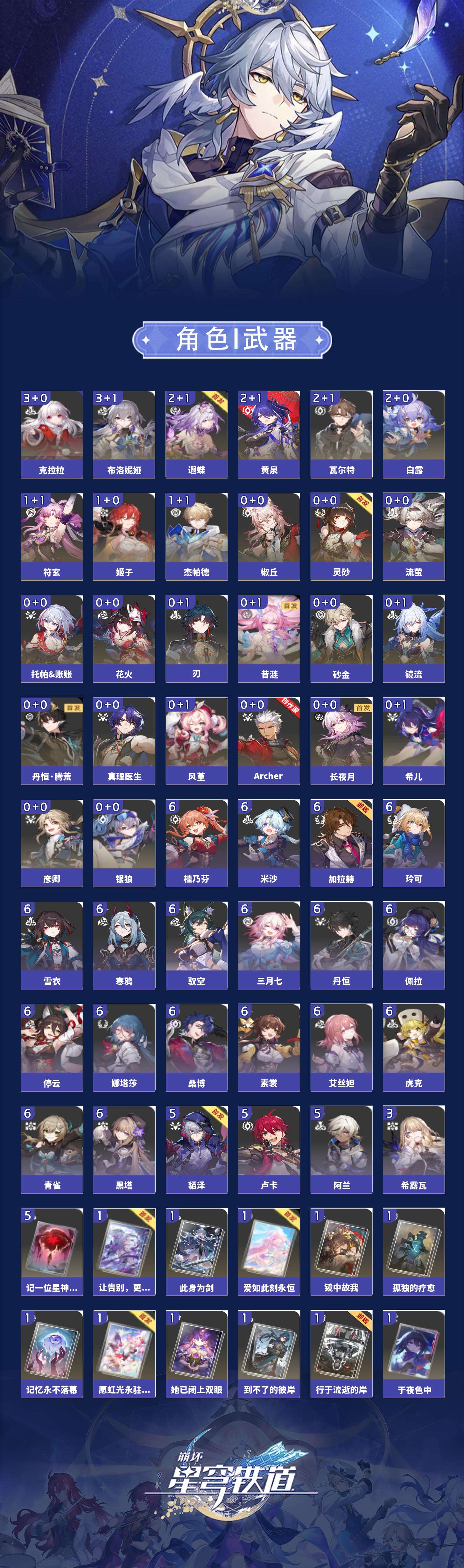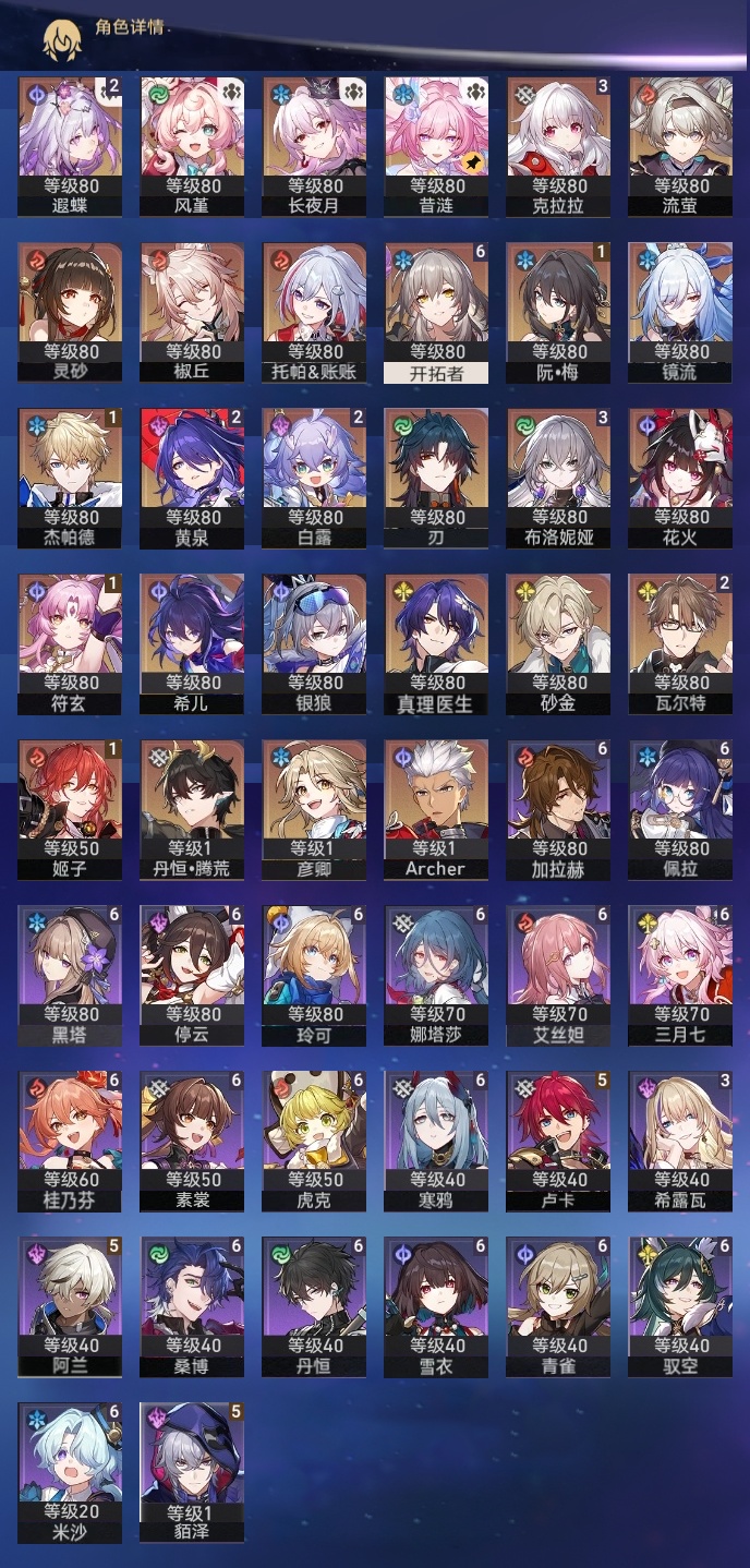 【崩坏·星穹铁道】【lyxq8451】冒险等级:70,女主,五星数量:44,五星角色:布洛妮娅 3命克拉拉 3命白露 2命瓦尔特 2命遐蝶 2命黄泉 2命姬子 1命杰帕德 1命符玄 1命椒丘银狼希儿灵砂彦卿刃镜流托帕账账真理医生花火风堇砂金archer长夜月丹恒·腾荒昔涟流萤__五星光锥:记一位星神的陨落 5精星海巡航制胜的瞬间以世界之名但战斗还未结束但战斗还未结束但战斗还未结束于夜色中到不了的彼岸孤独的疗愈她已闭上双眼让告别,更美一些此身为剑镜中故我行于流逝的岸愿虹光永驻天空记忆永不落幕爱如此刻永恒__四星角色:娜塔莎 6命虎克 6命黑塔 6命丹恒 6命艾丝妲 6命停云 6命素裳 6命桑博 6命三月七 6命青雀 6命佩拉 6命驭空 6命玲可 6命桂乃芬 6命寒鸦 6命雪衣 6命米沙 6命加拉赫 6命阿兰 5命貊泽 5命卢卡 5命希露瓦 3命