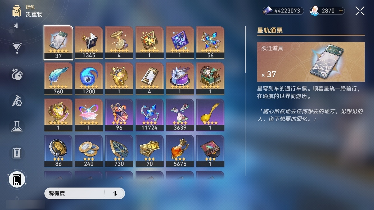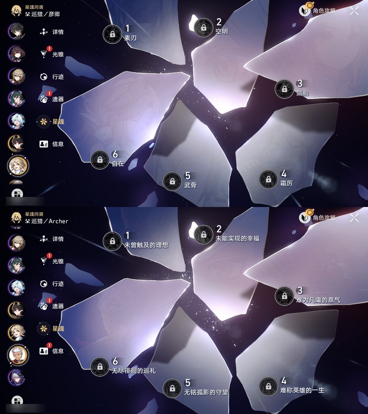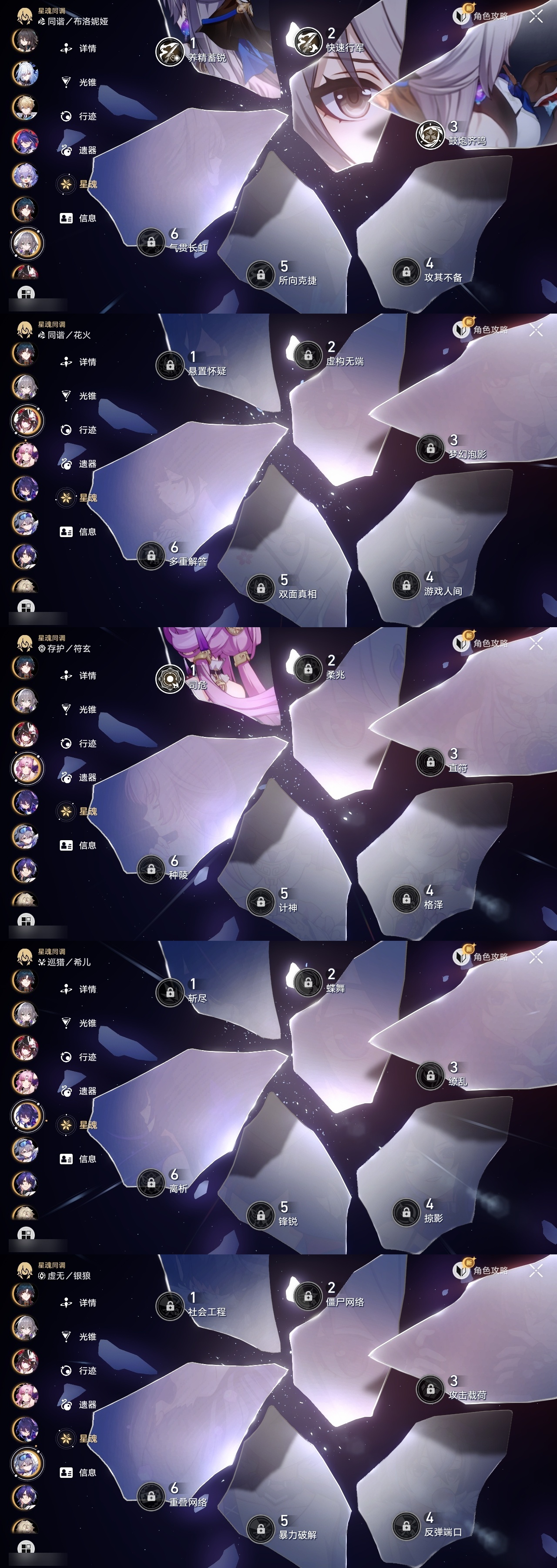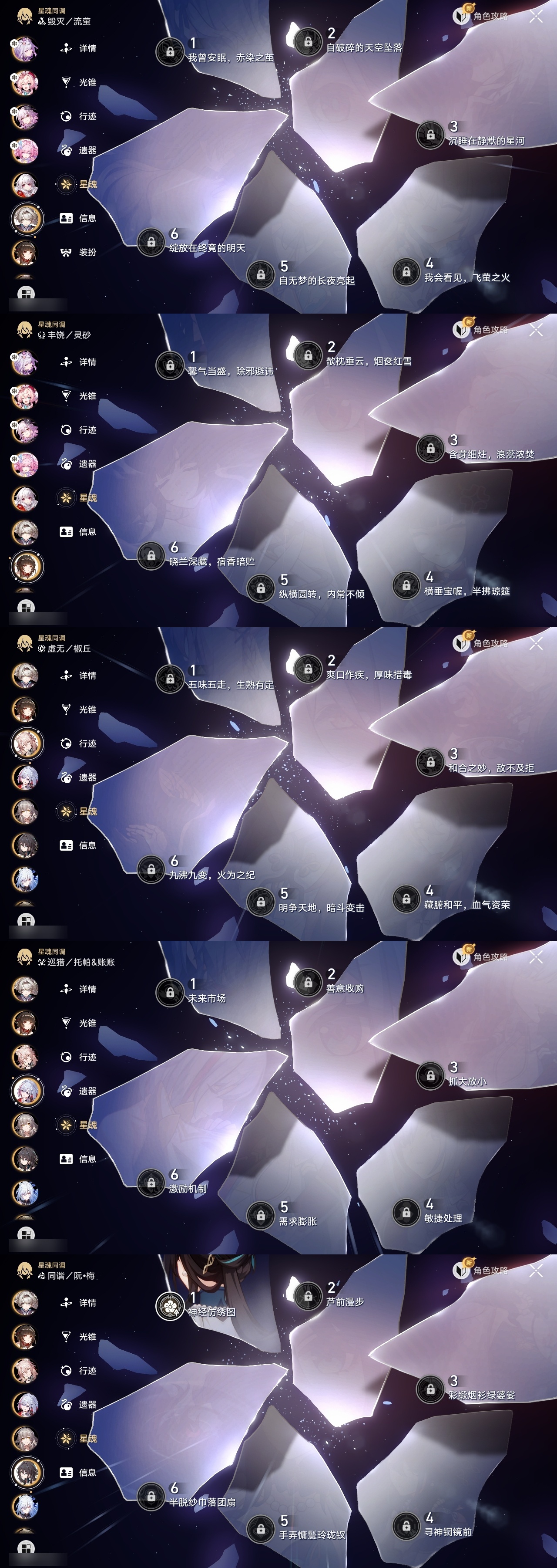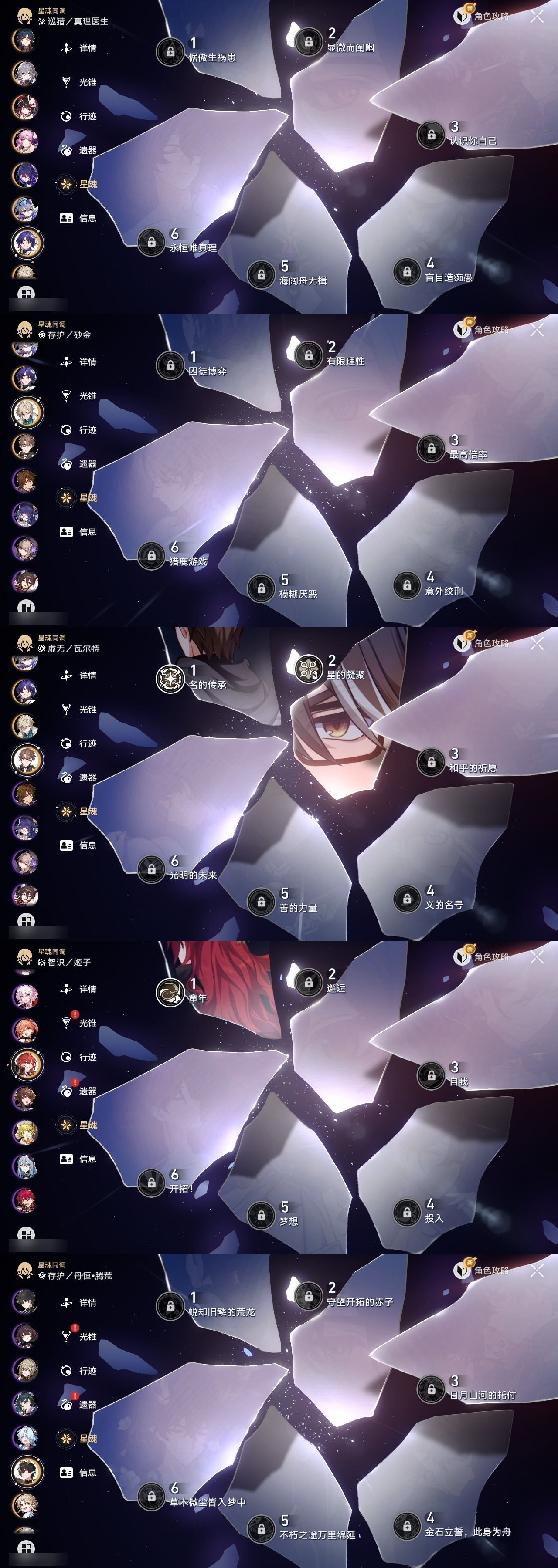 【崩坏·星穹铁道】【lyxq8451】冒险等级:70,女主,五星数量:44,五星角色:布洛妮娅 3命克拉拉 3命白露 2命瓦尔特 2命遐蝶 2命黄泉 2命姬子 1命杰帕德 1命符玄 1命椒丘银狼希儿灵砂彦卿刃镜流托帕账账真理医生花火风堇砂金archer长夜月丹恒·腾荒昔涟流萤__五星光锥:记一位星神的陨落 5精星海巡航制胜的瞬间以世界之名但战斗还未结束但战斗还未结束但战斗还未结束于夜色中到不了的彼岸孤独的疗愈她已闭上双眼让告别,更美一些此身为剑镜中故我行于流逝的岸愿虹光永驻天空记忆永不落幕爱如此刻永恒__四星角色:娜塔莎 6命虎克 6命黑塔 6命丹恒 6命艾丝妲 6命停云 6命素裳 6命桑博 6命三月七 6命青雀 6命佩拉 6命驭空 6命玲可 6命桂乃芬 6命寒鸦 6命雪衣 6命米沙 6命加拉赫 6命阿兰 5命貊泽 5命卢卡 5命希露瓦 3命