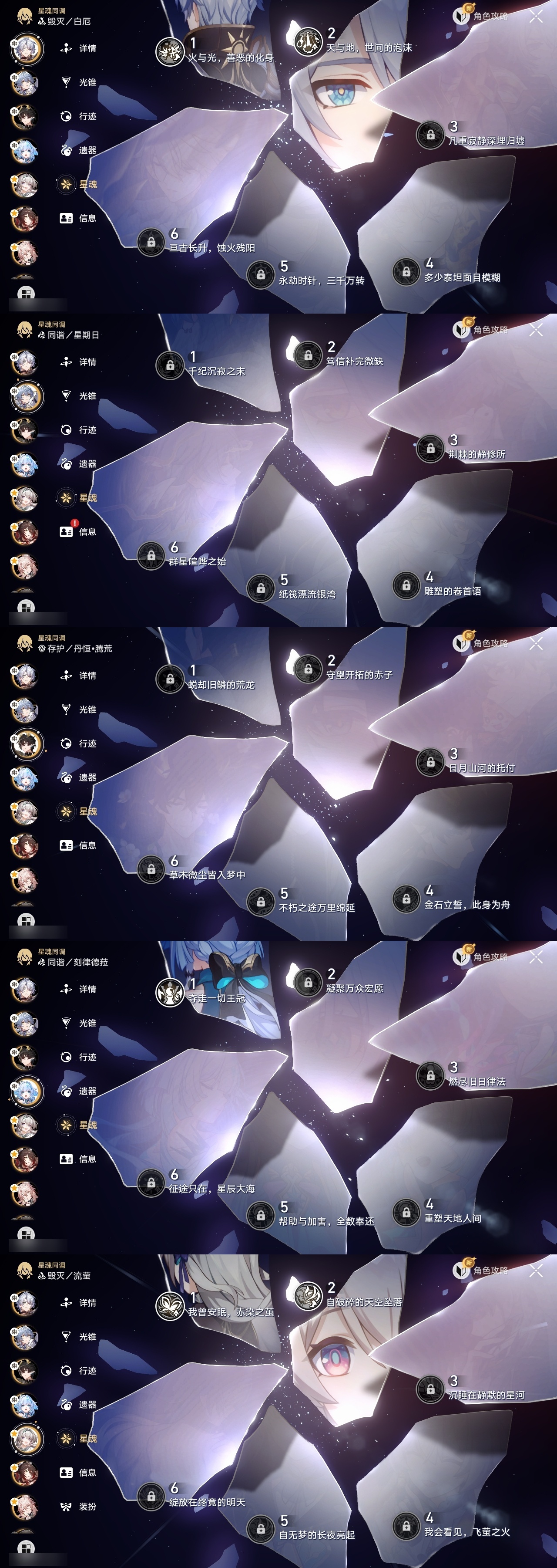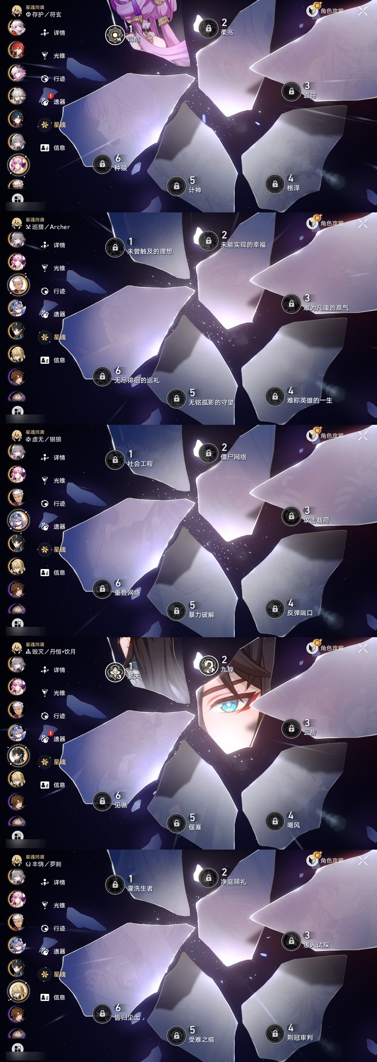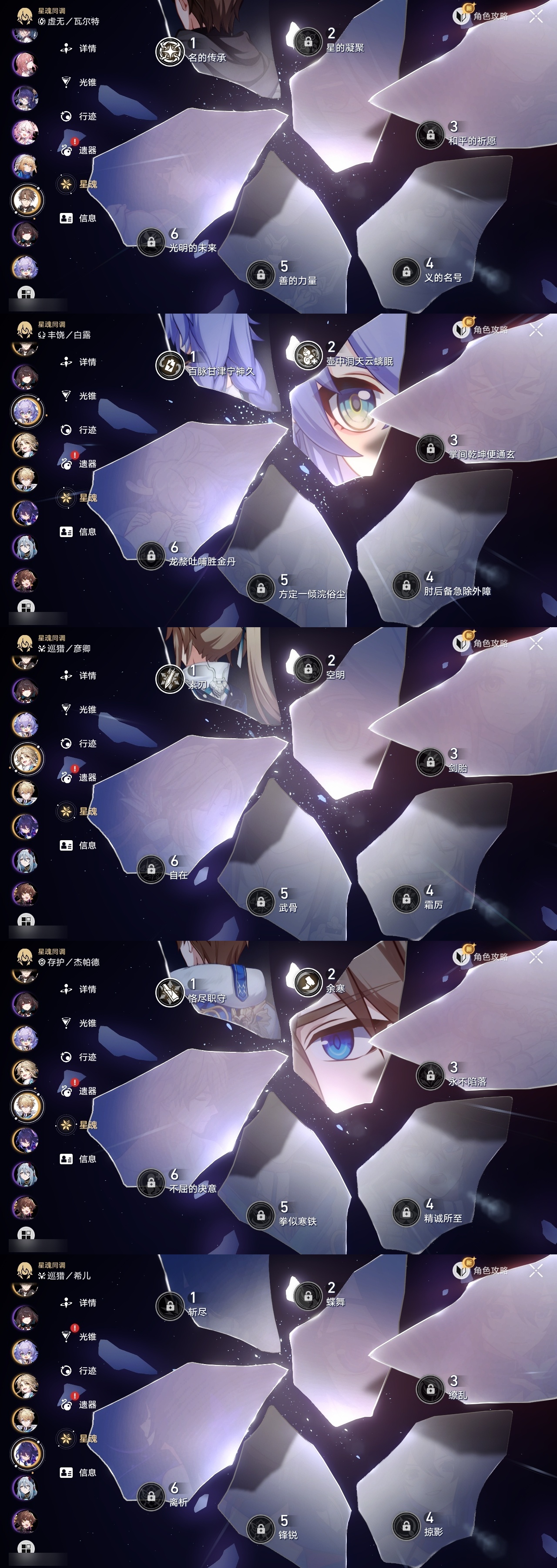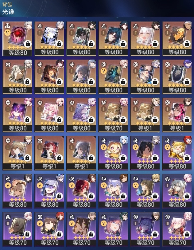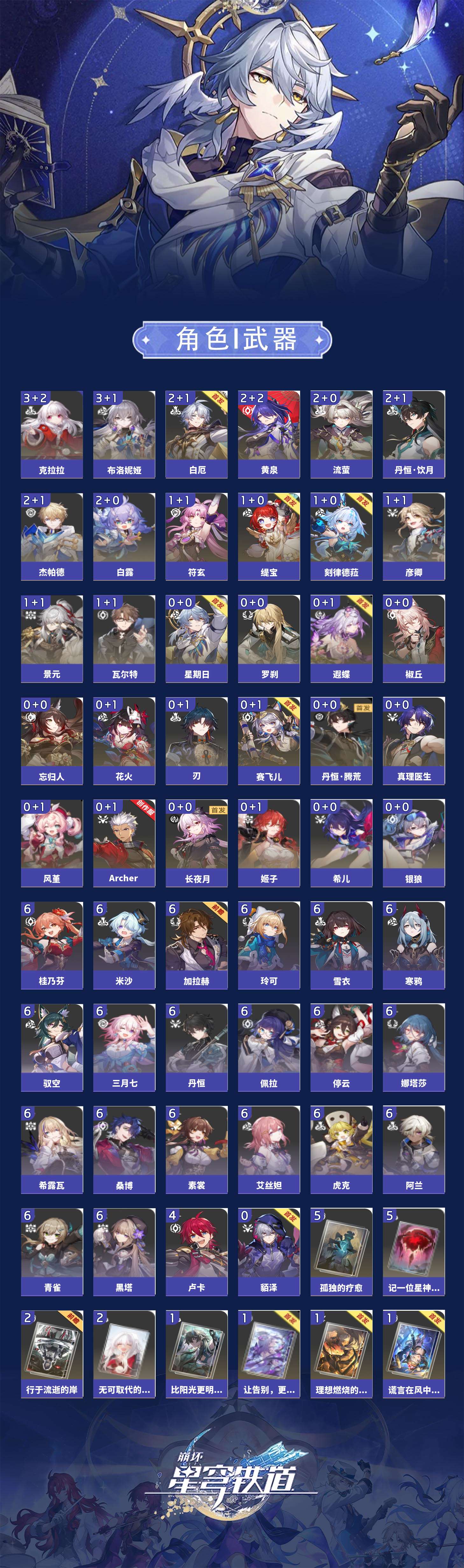 【崩坏·星穹铁道】【lyxq8485】冒险等级:70,男主,五星数量:51,五星角色:布洛妮娅 3命克拉拉 3命白露 2命杰帕德 2命丹恒·饮月 2命黄泉 2命白厄 2命流萤 2命景元 1命彦卿 1命瓦尔特 1命缇宝 1命符玄 1命刻律德菈 1命椒丘银狼希儿姬子星期日忘归人罗刹刃遐蝶真理医生花火风堇赛飞儿archer长夜月丹恒·腾荒__五星光锥:记一位星神的陨落 5精孤独的疗愈 5精无可取代的东西 2精行于流逝的岸 2精制胜的瞬间银河铁道之夜以世界之名如泥酣眠如泥酣眠但战斗还未结束但战斗还未结束拂晓之前到不了的彼岸比阳光更明亮的她已闭上双眼让告别,更美一些游戏尘寰愿虹光永驻天空谎言在风中飘扬黎明恰如此燃烧理想燃烧的地狱__四星角色:阿兰 6命娜塔莎 6命虎克 6命黑塔 6命丹恒 6命艾丝妲 6命希露瓦 6命停云 6命素裳 6命桑博 6命三月七 6命青雀 6命佩拉 6命驭空 6命玲可 6命桂乃芬 6命寒鸦 6命雪衣 6命米沙 6命加拉赫 6命卢卡 4命貊泽