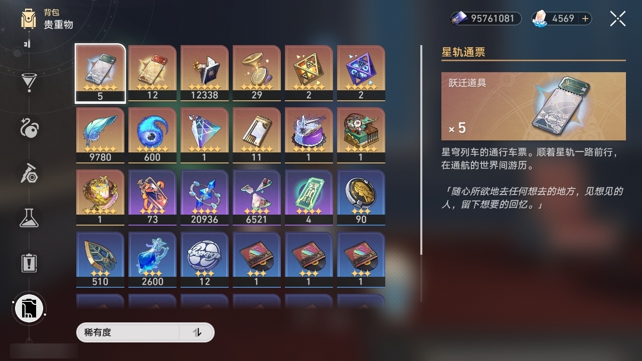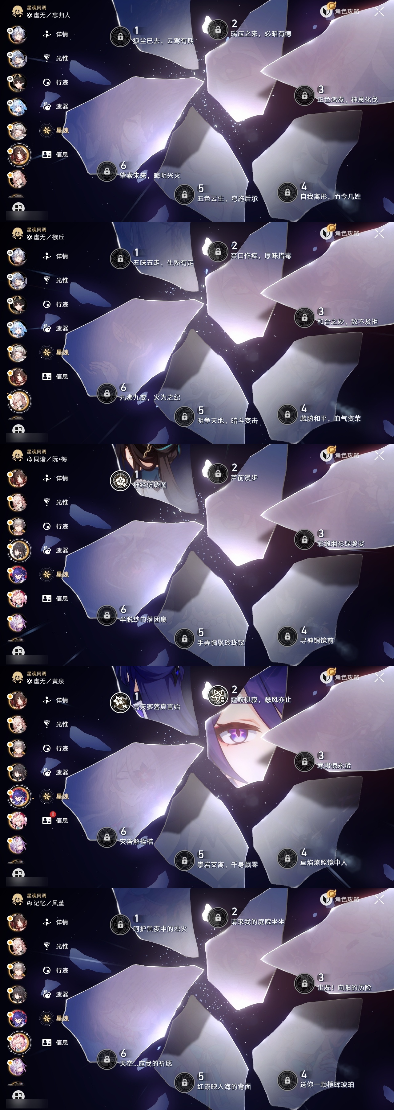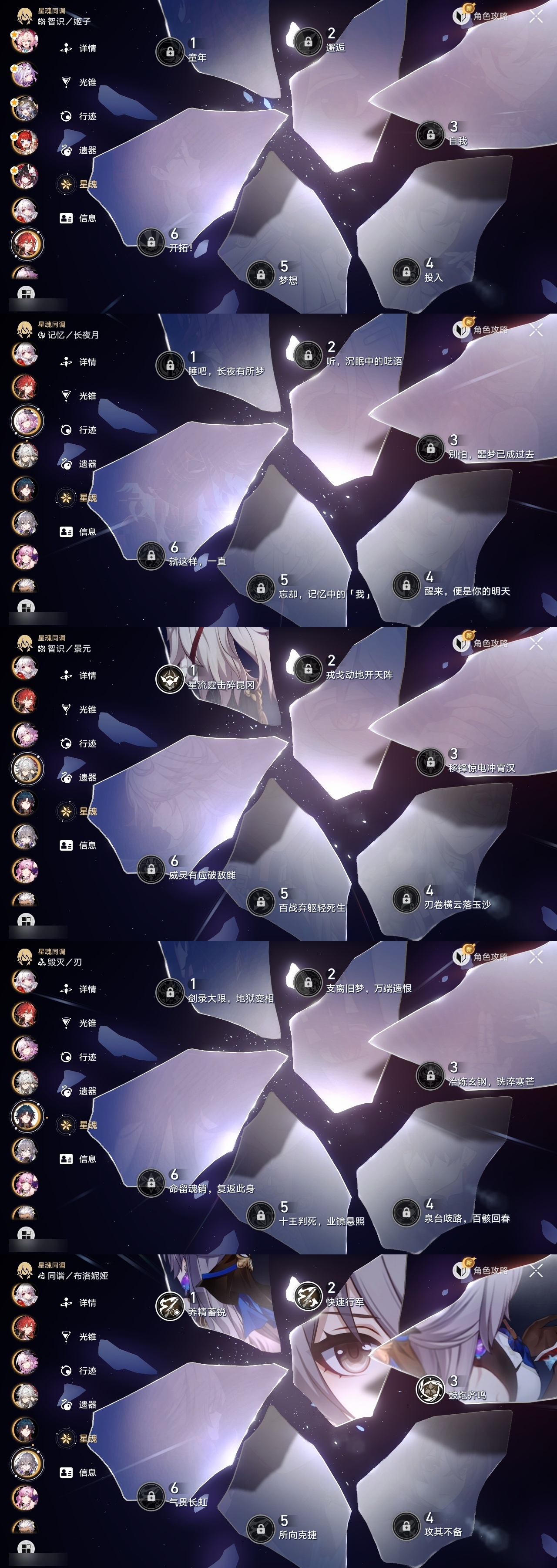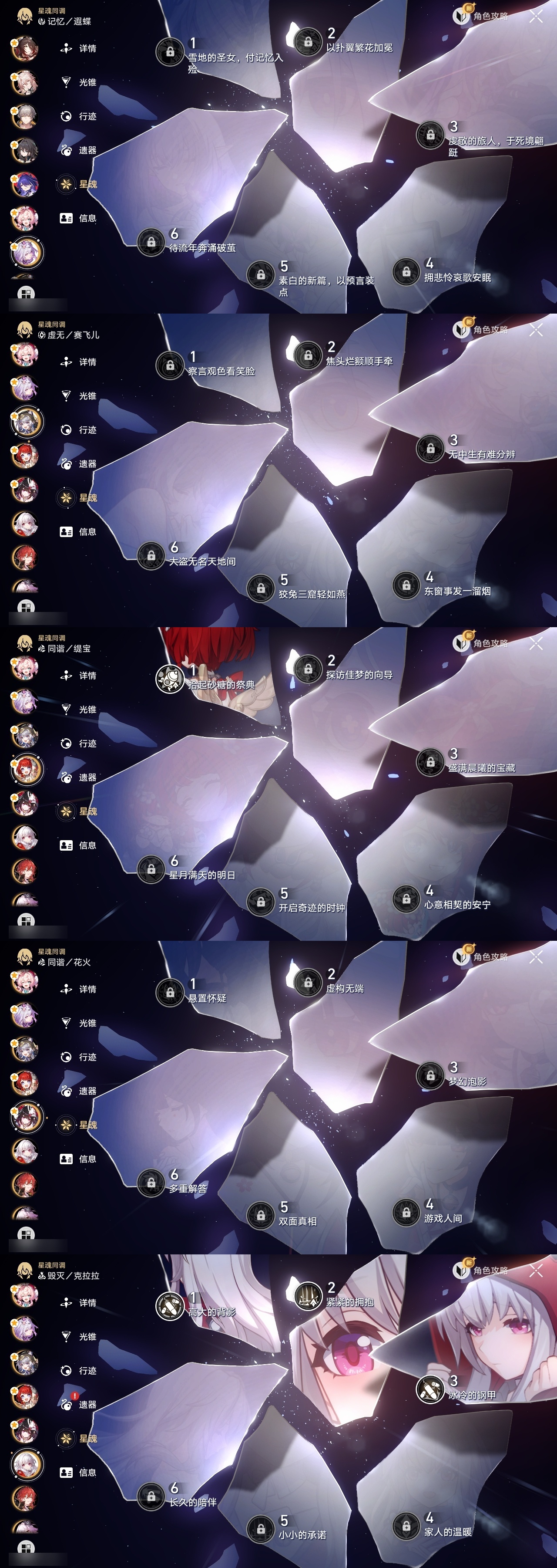 【崩坏·星穹铁道】【lyxq8485】冒险等级:70,男主,五星数量:51,五星角色:布洛妮娅 3命克拉拉 3命白露 2命杰帕德 2命丹恒·饮月 2命黄泉 2命白厄 2命流萤 2命景元 1命彦卿 1命瓦尔特 1命缇宝 1命符玄 1命刻律德菈 1命椒丘银狼希儿姬子星期日忘归人罗刹刃遐蝶真理医生花火风堇赛飞儿archer长夜月丹恒·腾荒__五星光锥:记一位星神的陨落 5精孤独的疗愈 5精无可取代的东西 2精行于流逝的岸 2精制胜的瞬间银河铁道之夜以世界之名如泥酣眠如泥酣眠但战斗还未结束但战斗还未结束拂晓之前到不了的彼岸比阳光更明亮的她已闭上双眼让告别,更美一些游戏尘寰愿虹光永驻天空谎言在风中飘扬黎明恰如此燃烧理想燃烧的地狱__四星角色:阿兰 6命娜塔莎 6命虎克 6命黑塔 6命丹恒 6命艾丝妲 6命希露瓦 6命停云 6命素裳 6命桑博 6命三月七 6命青雀 6命佩拉 6命驭空 6命玲可 6命桂乃芬 6命寒鸦 6命雪衣 6命米沙 6命加拉赫 6命卢卡 4命貊泽