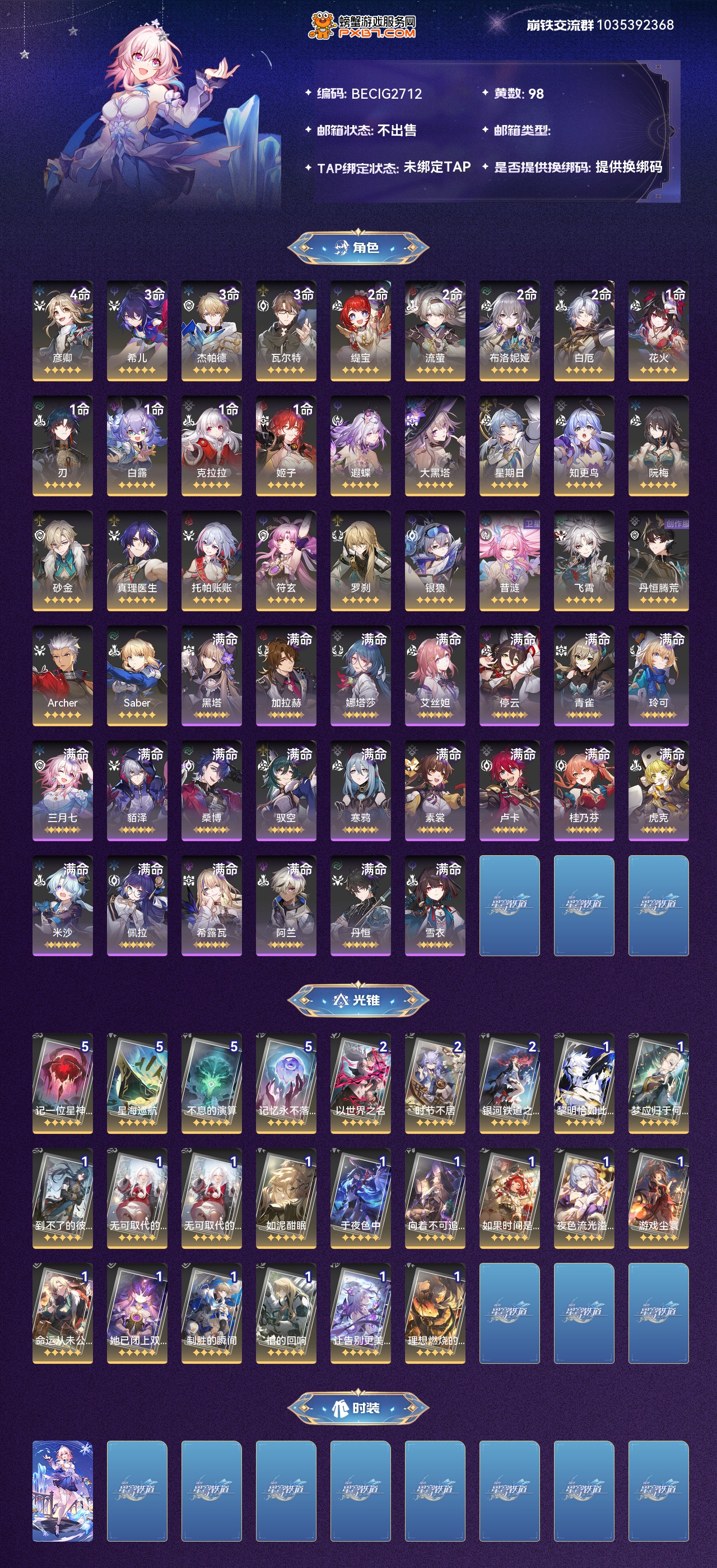 【崩坏·星穹铁道】【lyxq8437】冒险等级:70,女主,五星数量:52,绑定情况:邮箱__五星角色:彦卿 4命|希儿 3命|杰帕德 3命|瓦尔特 3命|布洛妮娅 2命|缇宝 2命|白厄 2命|流萤 2命|花火 1命|刃 1命|白露 1命|克拉拉 1命|姬子 1命|砂金|真理医生|阮·梅|托帕账账|符玄|罗刹|银狼|大黑塔|昔涟|知更鸟|飞霄|遐蝶|丹恒·腾荒|archer|星期日|saber__五星光锥:记一位星神的陨落 5精|星海巡航 5精|不息的演算 5精|记忆永不落幕 5精|以世界之名 2精|时节不居 2精|银河铁道之夜 2精|黎明恰如此燃烧|梦应归于何处|到不了的彼岸|无可取代的东西|如泥酣眠|于夜色中|向着不可追问处|如果时间是一朵花|夜色流光溢彩|游戏尘寰|命运从未公平|她已闭上双眼|制胜的瞬间|棺的回响|让告别,更美一些|理想燃烧的地狱,【邮箱不出售】1