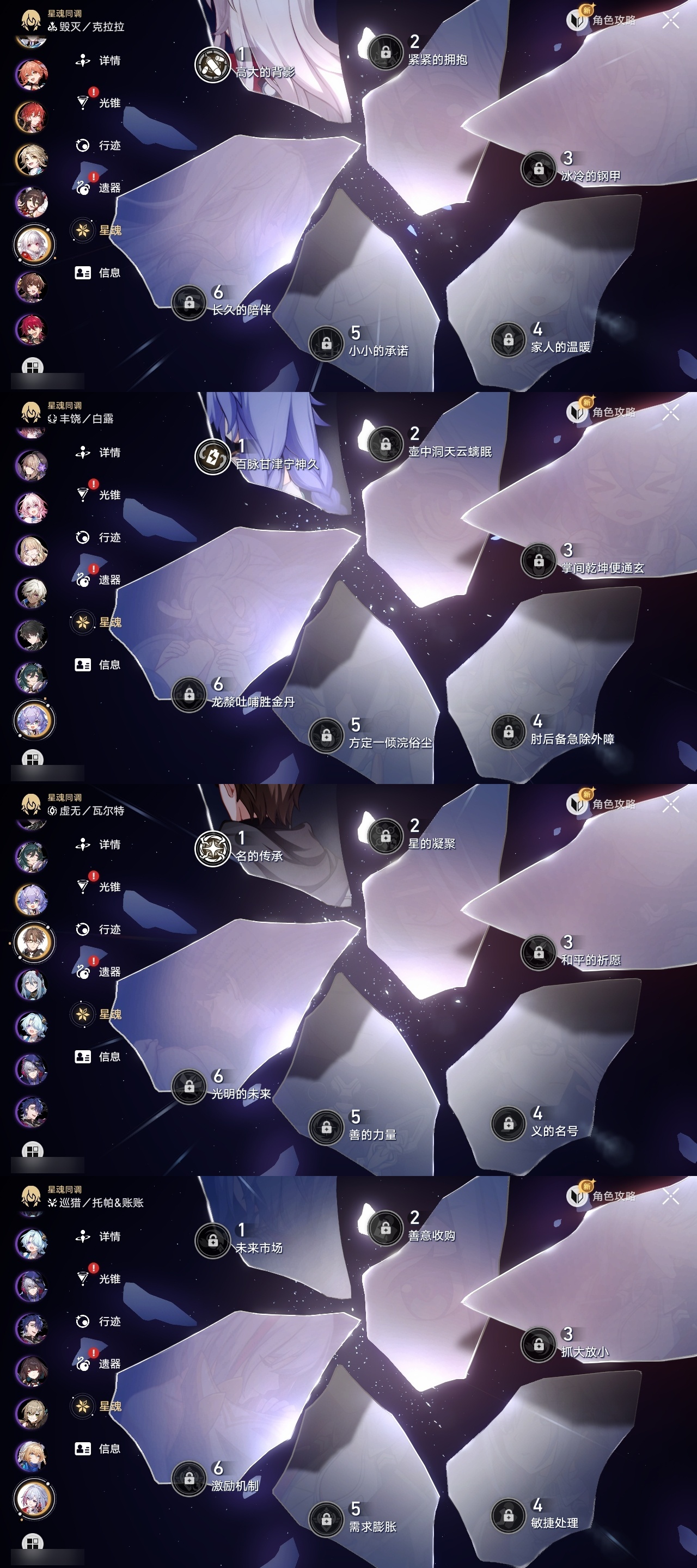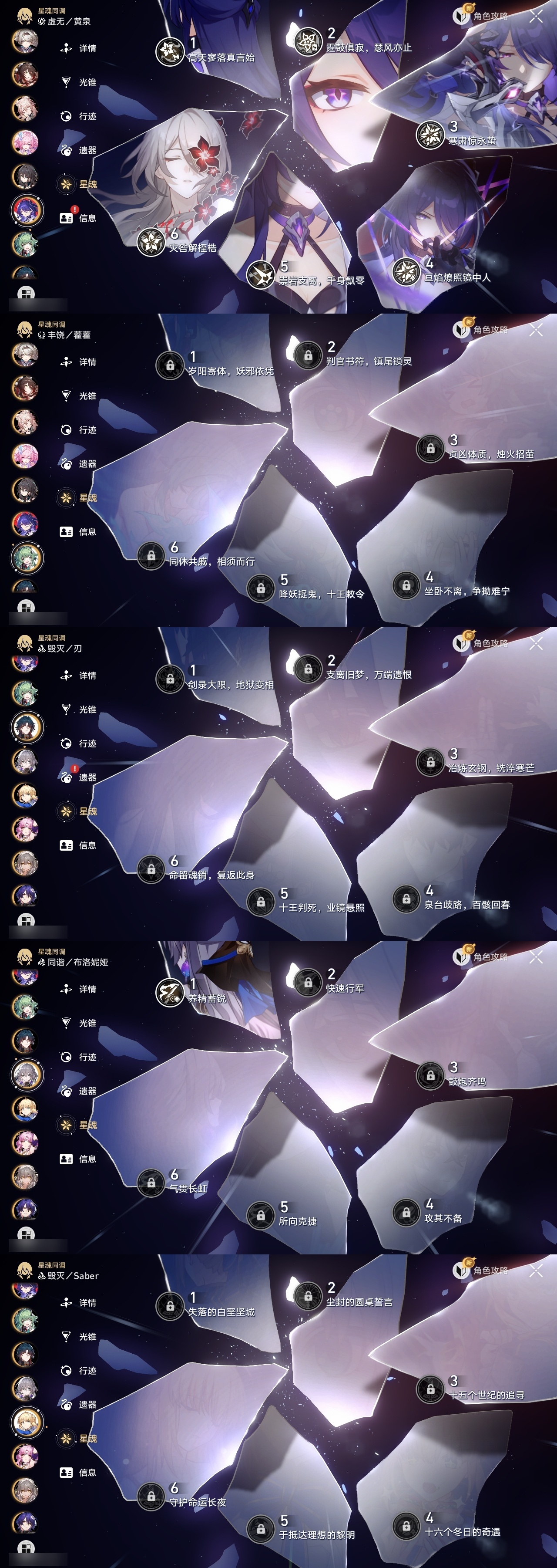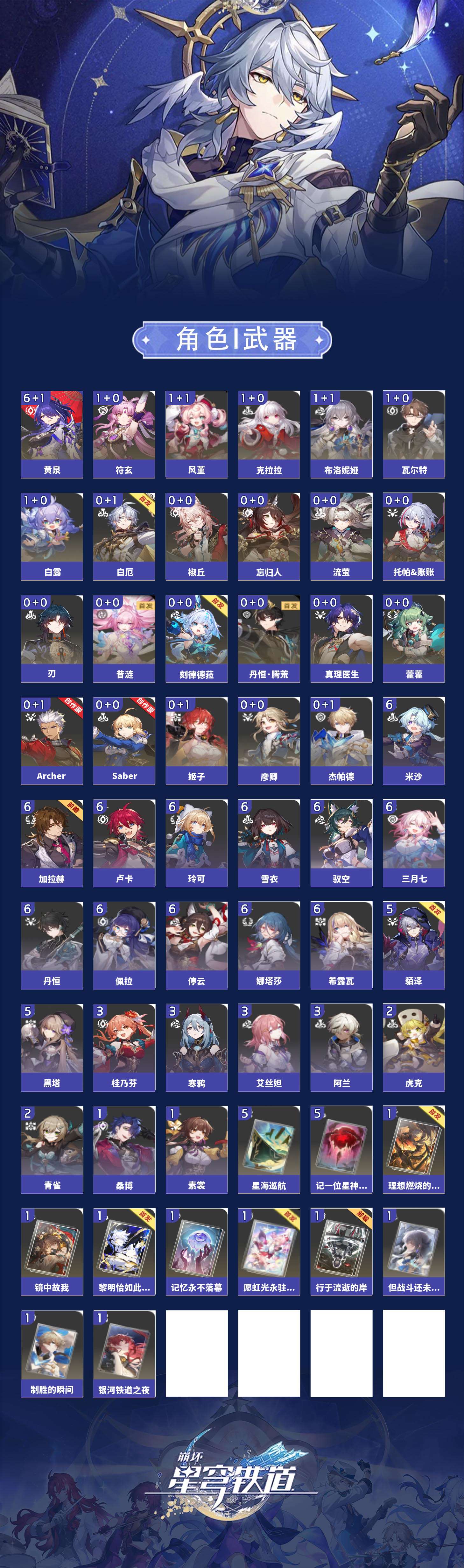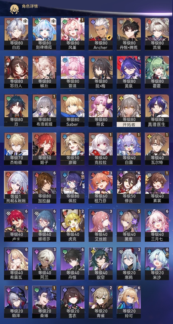 【崩坏·星穹铁道】【lyxq8535】冒险等级:70,女主,五星数量:34,五星角色:黄泉 6命白露 1命布洛妮娅 1命瓦尔特 1命克拉拉 1命符玄 1命风堇 1命椒丘姬子杰帕德彦卿忘归人刃托帕账账藿藿真理医生白厄saberarcher刻律德菈丹恒·腾荒昔涟流萤__五星光锥:星海巡航 5精记一位星神的陨落 5精制胜的瞬间银河铁道之夜但战斗还未结束镜中故我行于流逝的岸愿虹光永驻天空记忆永不落幕黎明恰如此燃烧理想燃烧的地狱__四星角色:娜塔莎 6命丹恒 6命希露瓦 6命停云 6命三月七 6命佩拉 6命驭空 6命卢卡 6命玲可 6命雪衣 6命米沙 6命加拉赫 6命貊泽 5命黑塔 5命阿兰 3命艾丝妲 3命桂乃芬 3命寒鸦 3命虎克 2命青雀 2命素裳 1命桑博 1命
