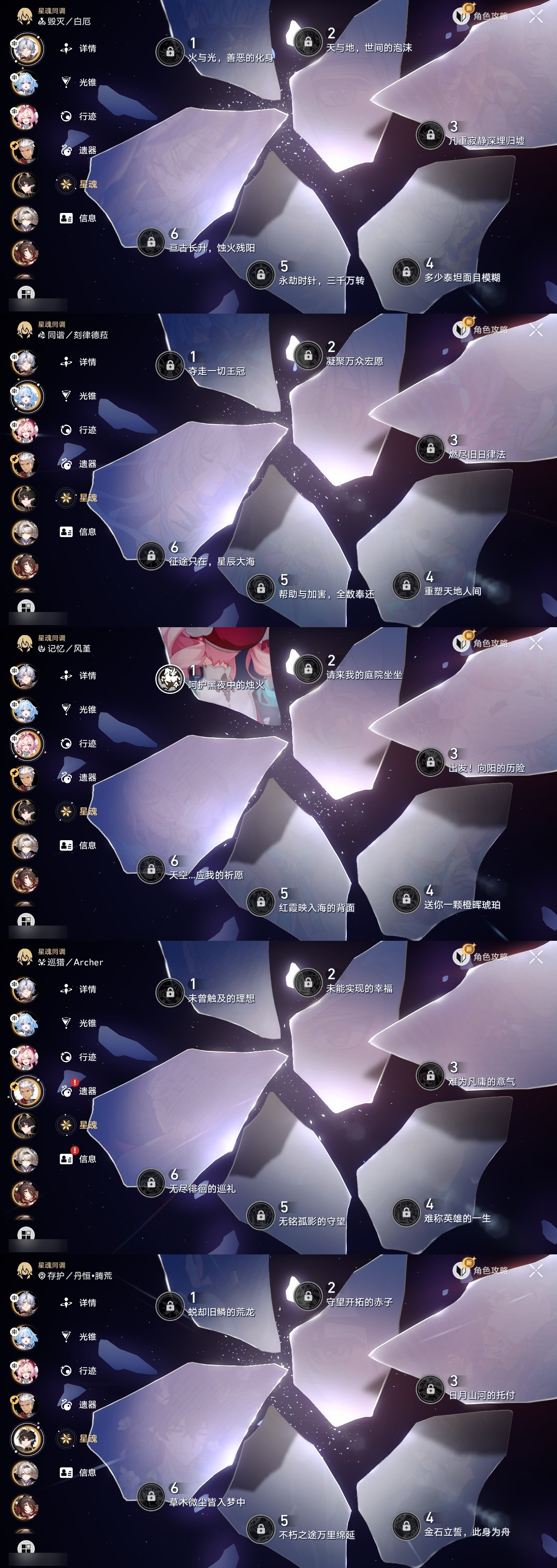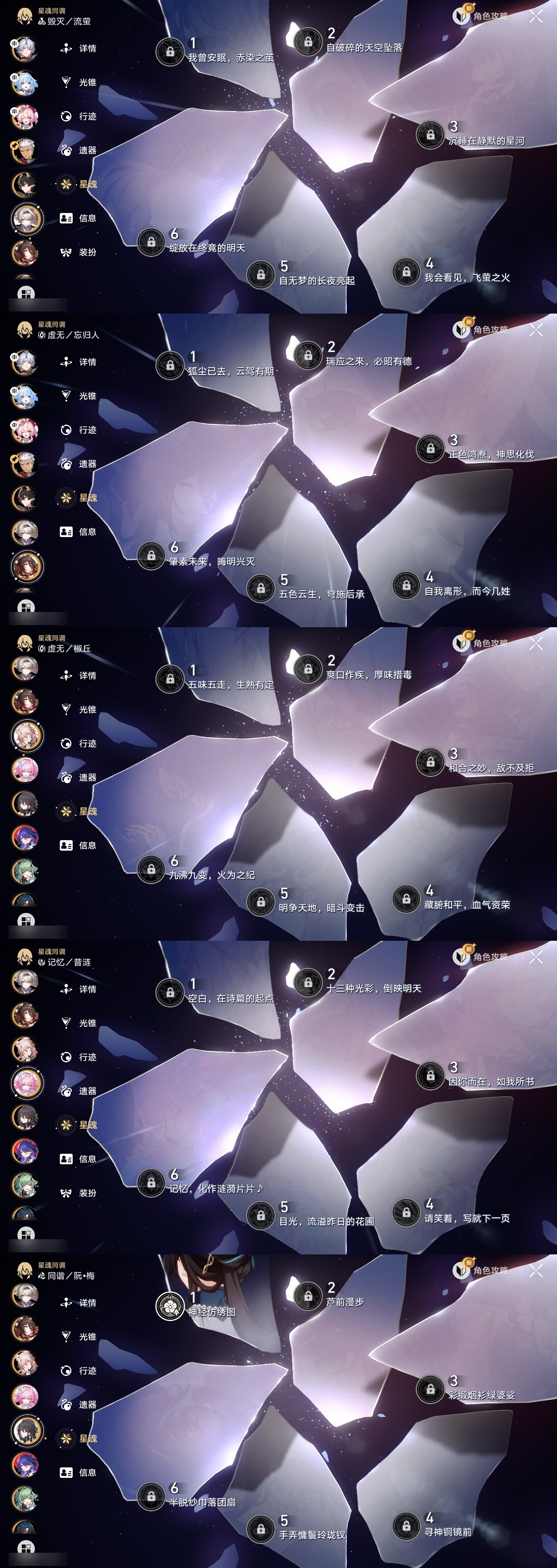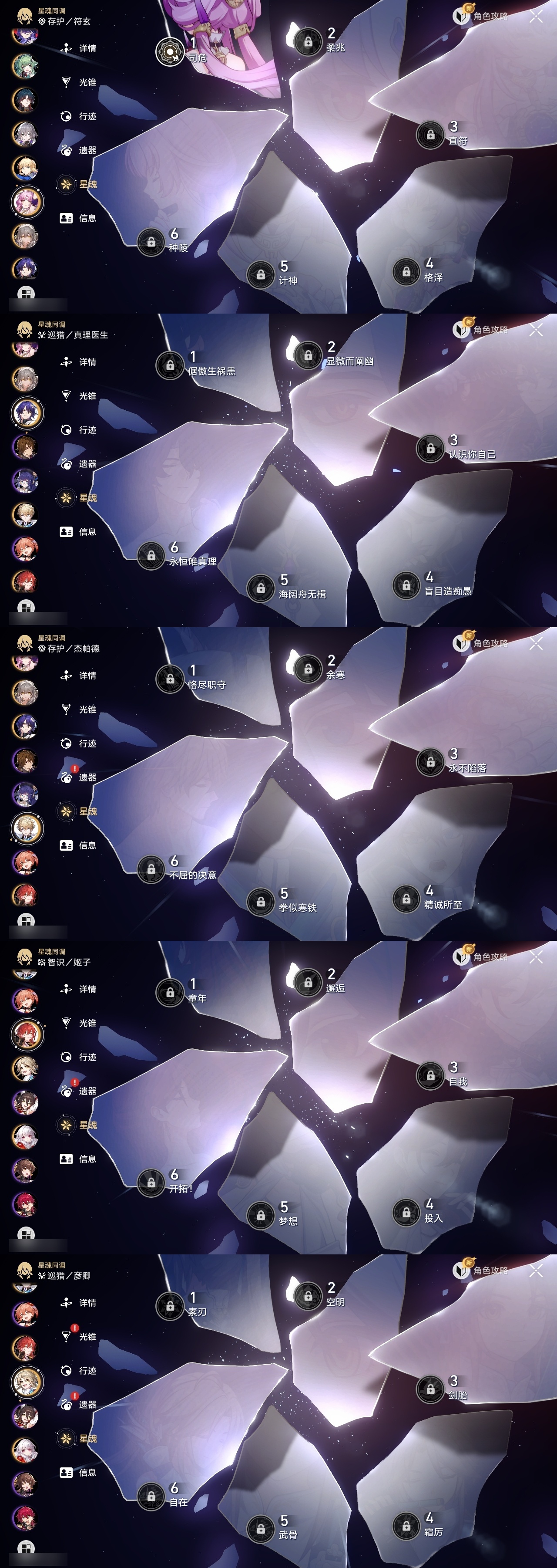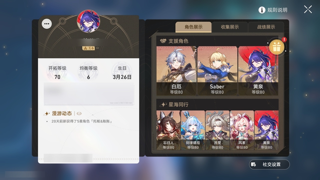 【崩坏·星穹铁道】【lyxq8535】冒险等级:70,女主,五星数量:34,五星角色:黄泉 6命白露 1命布洛妮娅 1命瓦尔特 1命克拉拉 1命符玄 1命风堇 1命椒丘姬子杰帕德彦卿忘归人刃托帕账账藿藿真理医生白厄saberarcher刻律德菈丹恒·腾荒昔涟流萤__五星光锥:星海巡航 5精记一位星神的陨落 5精制胜的瞬间银河铁道之夜但战斗还未结束镜中故我行于流逝的岸愿虹光永驻天空记忆永不落幕黎明恰如此燃烧理想燃烧的地狱__四星角色:娜塔莎 6命丹恒 6命希露瓦 6命停云 6命三月七 6命佩拉 6命驭空 6命卢卡 6命玲可 6命雪衣 6命米沙 6命加拉赫 6命貊泽 5命黑塔 5命阿兰 3命艾丝妲 3命桂乃芬 3命寒鸦 3命虎克 2命青雀 2命素裳 1命桑博 1命