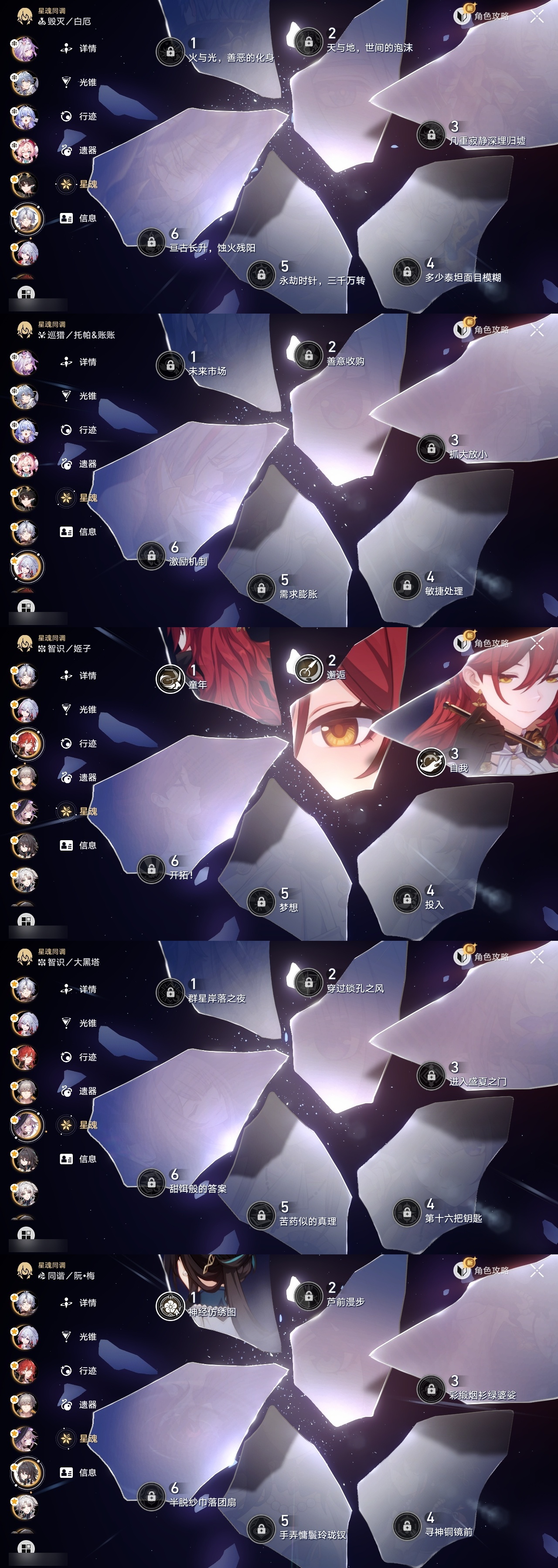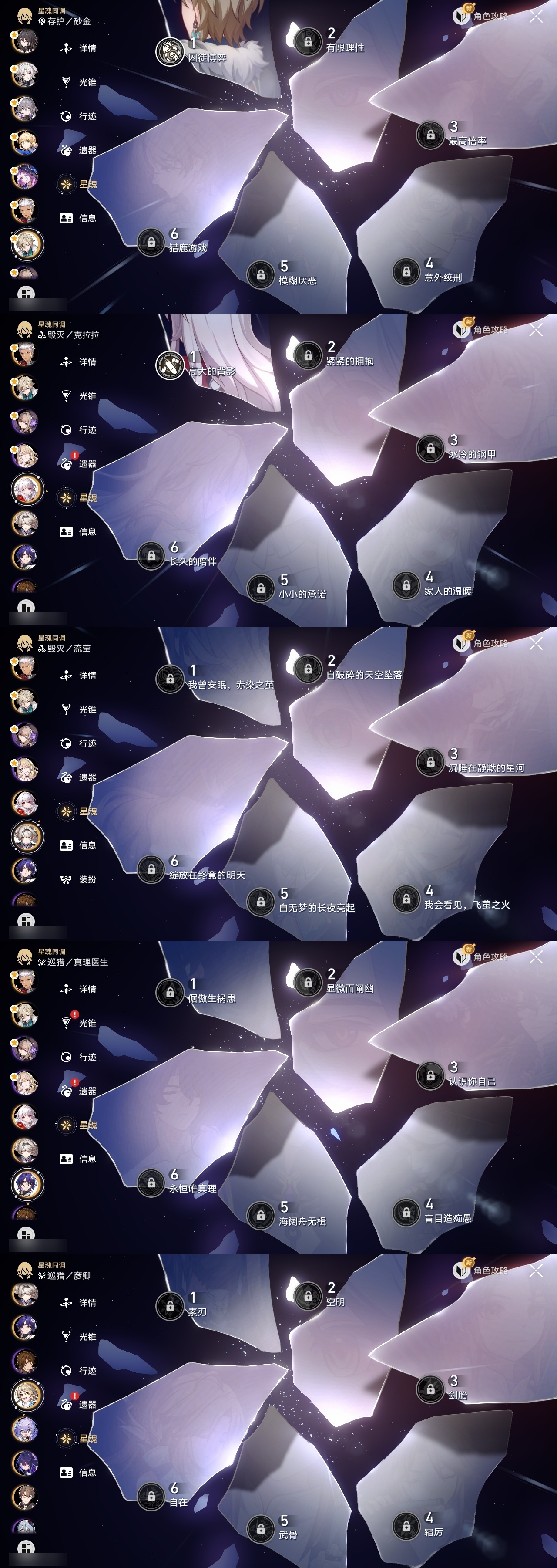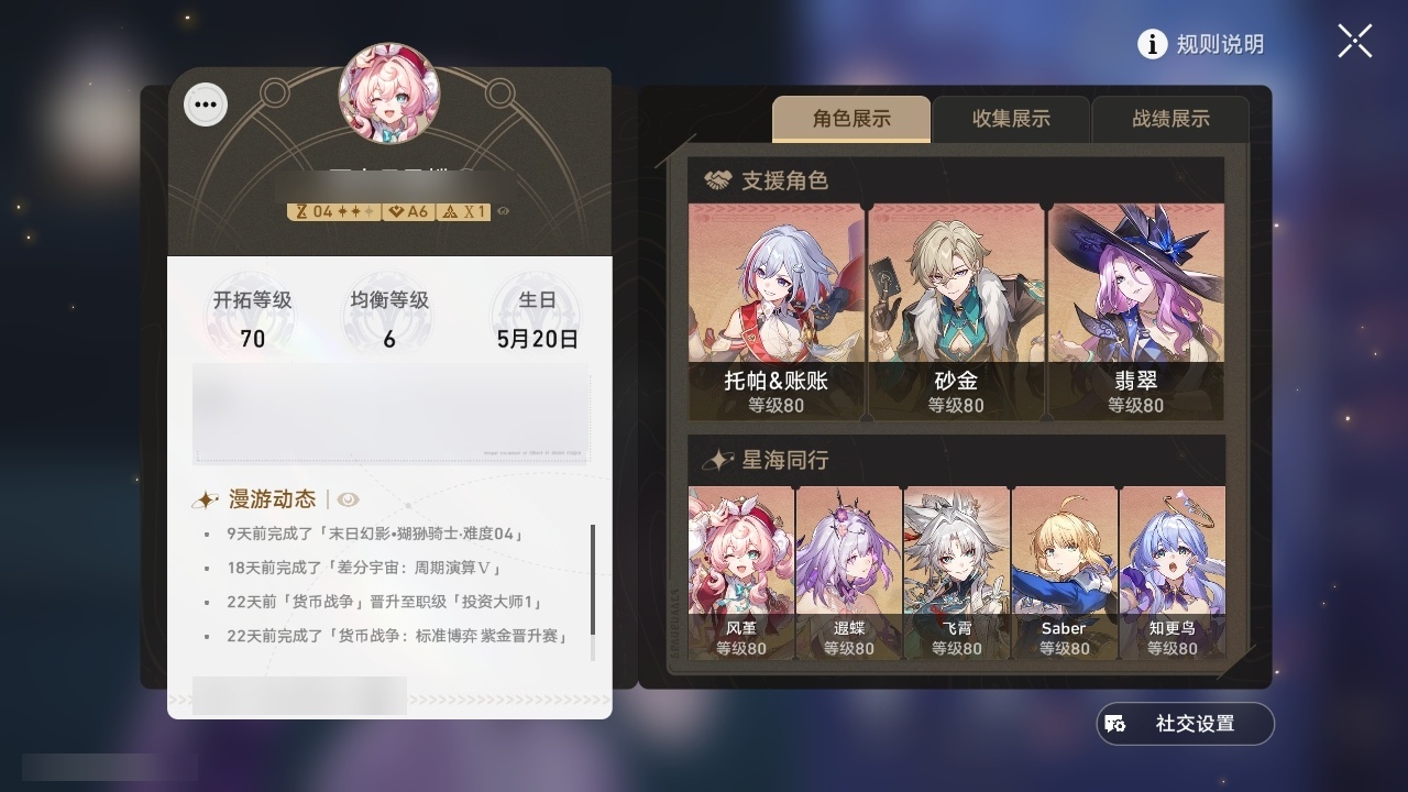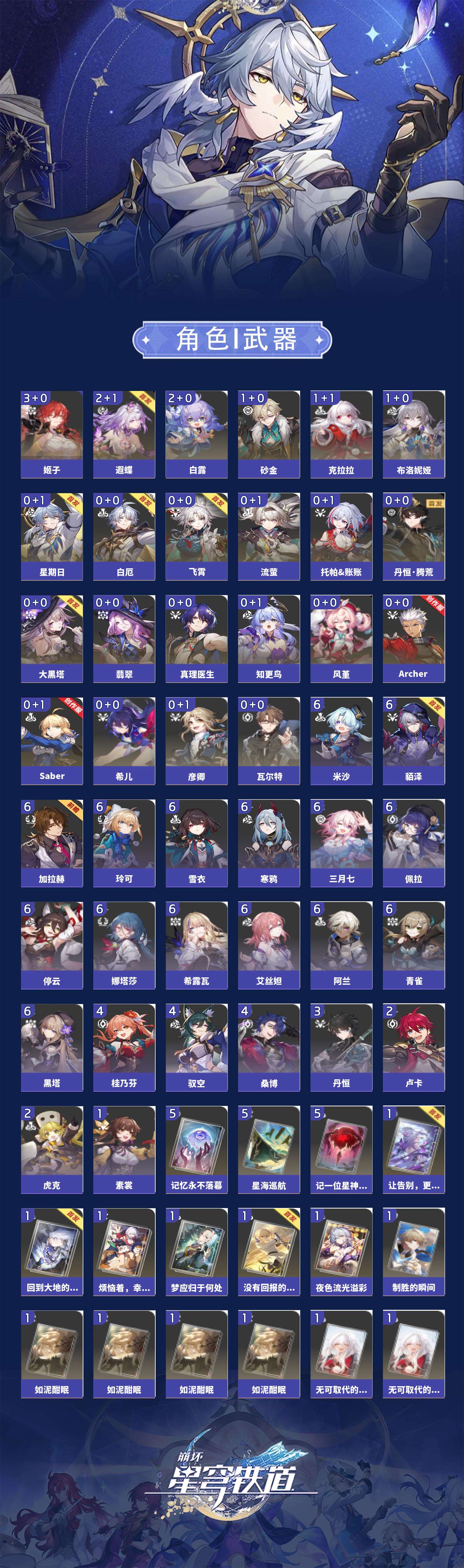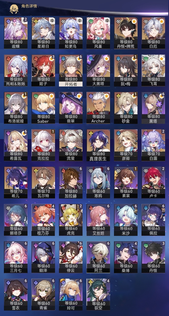 【崩坏·星穹铁道】【lyxq8527】冒险等级:70,男主,五星数量:39,五星角色:姬子 3命白露 2命遐蝶 2命布洛妮娅 1命克拉拉 1命砂金 1命飞霄希儿彦卿瓦尔特星期日大黑塔托帕账账真理医生风堇知更鸟白厄saberarcher丹恒·腾荒流萤翡翠__五星光锥:星海巡航 5精记一位星神的陨落 5精记忆永不落幕 5精不息的演算 3精制胜的瞬间无可取代的东西无可取代的东西如泥酣眠如泥酣眠如泥酣眠如泥酣眠回到大地的飞行让告别,更美一些烦恼着,幸福着夜色流光溢彩没有回报的加冕梦应归于何处__四星角色:阿兰 6命娜塔莎 6命貊泽 6命黑塔 6命艾丝妲 6命希露瓦 6命停云 6命三月七 6命青雀 6命佩拉 6命玲可 6命寒鸦 6命雪衣 6命米沙 6命加拉赫 6命桑博 4命驭空 4命桂乃芬 4命丹恒 3命虎克 2命卢卡 2命素裳 1命