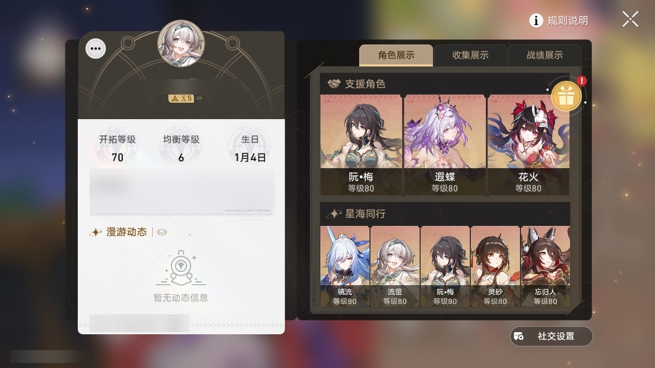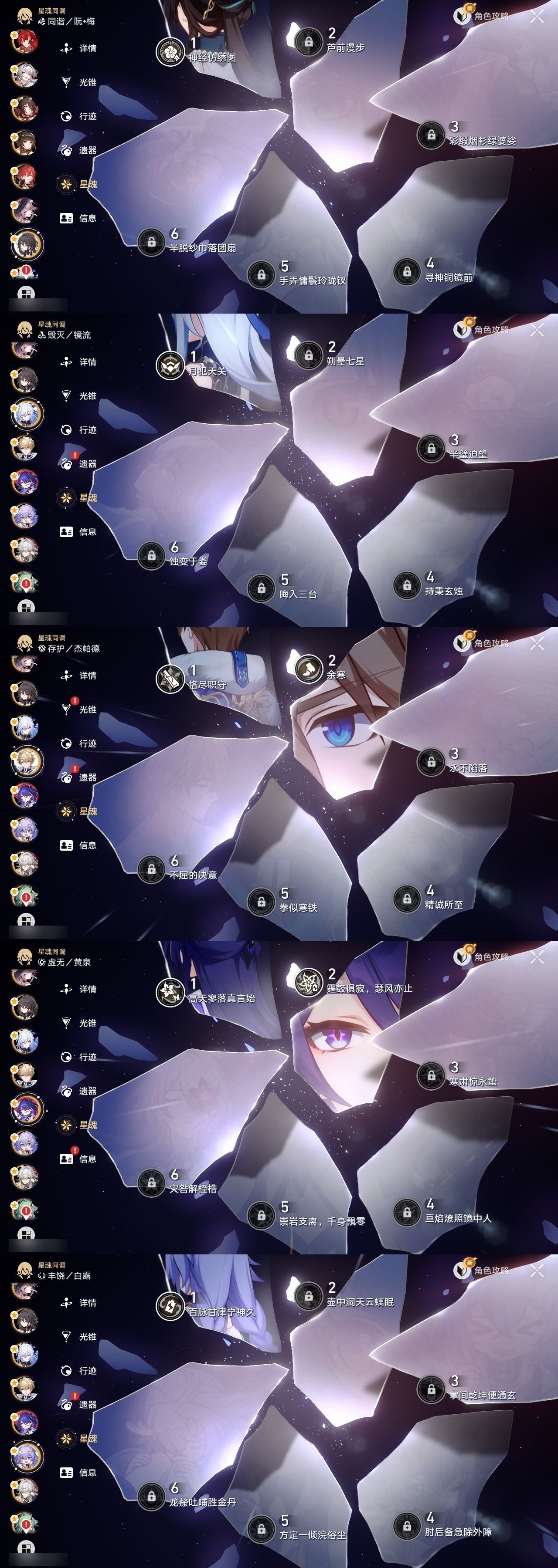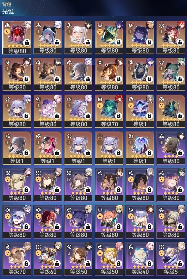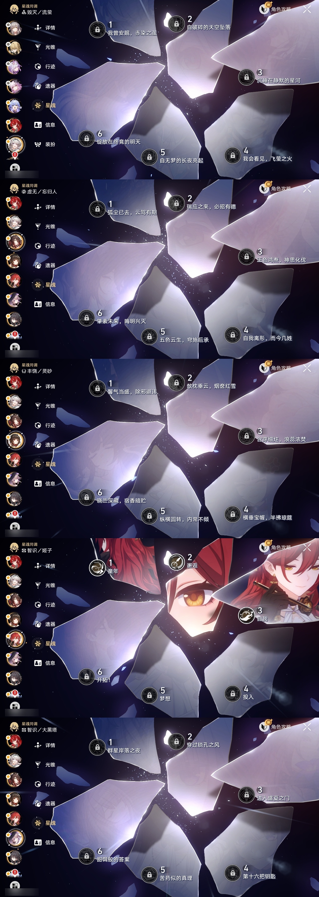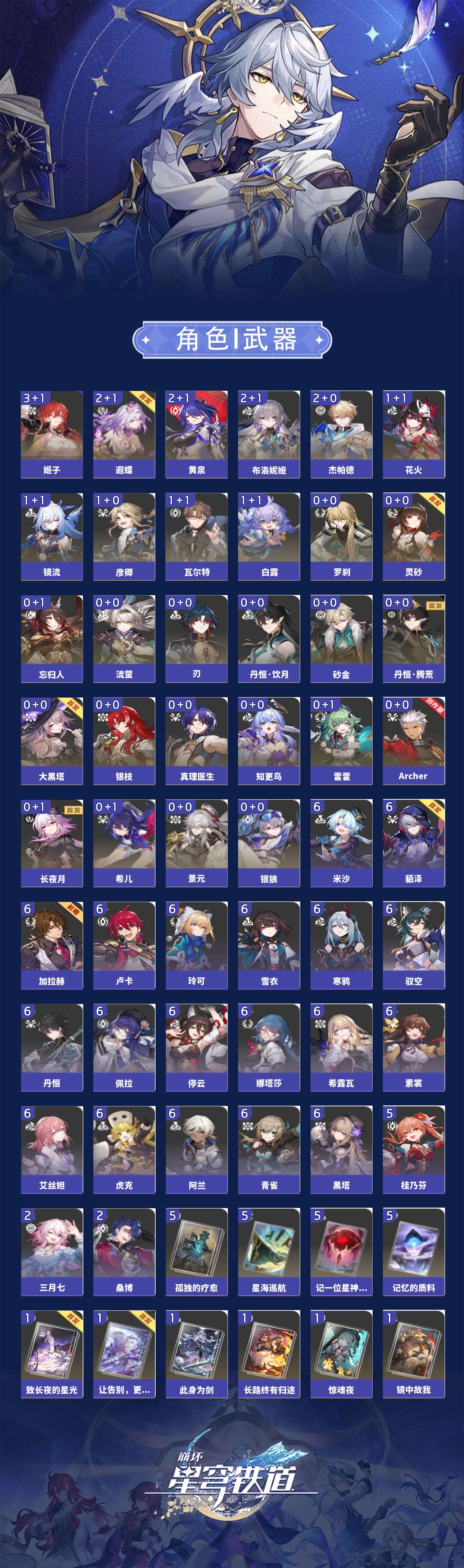 【崩坏·星穹铁道】【lyxq8504】冒险等级:70,女主,五星数量:51,五星角色:姬子 3命布洛妮娅 2命杰帕德 2命遐蝶 2命黄泉 2命白露 1命彦卿 1命瓦尔特 1命镜流 1命花火 1命银狼景元希儿灵砂大黑塔忘归人罗刹刃丹恒·饮月藿藿银枝真理医生砂金知更鸟archer长夜月丹恒·腾荒流萤__五星光锥:星海巡航 5精记忆的质料 5精记一位星神的陨落 5精不息的演算 5精孤独的疗愈 5精银河铁道之夜以世界之名无可取代的东西时节不居时节不居时节不居但战斗还未结束但战斗还未结束于夜色中长路终有归途让告别,更美一些此身为剑惊魂夜镜中故我游戏尘寰行于流逝的岸记忆永不落幕致长夜的星光__四星角色:阿兰 6命娜塔莎 6命虎克 6命貊泽 6命黑塔 6命丹恒 6命艾丝妲 6命希露瓦 6命停云 6命素裳 6命青雀 6命佩拉 6命驭空 6命卢卡 6命玲可 6命寒鸦 6命雪衣 6命米沙 6命加拉赫 6命桂乃芬 5命桑博 2命三月七 2命