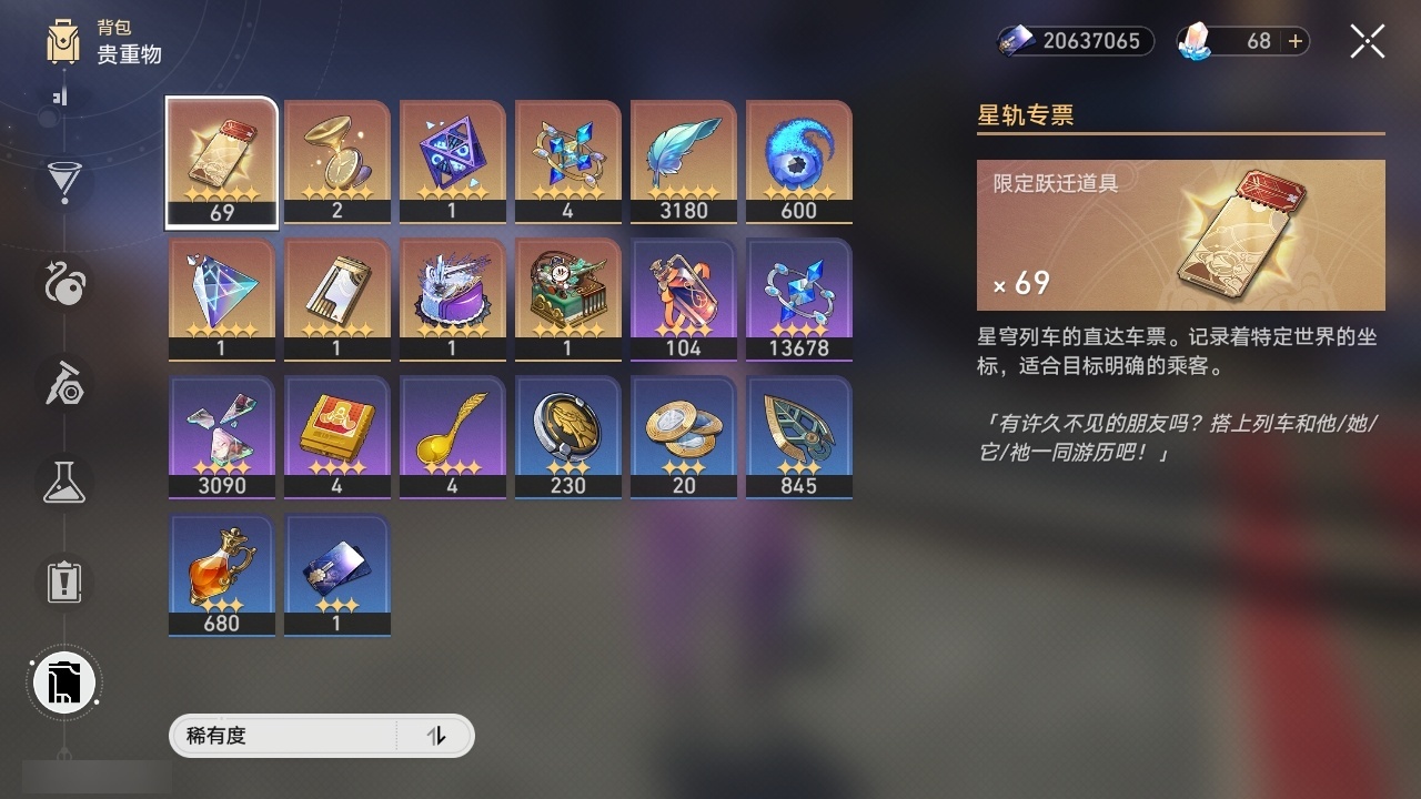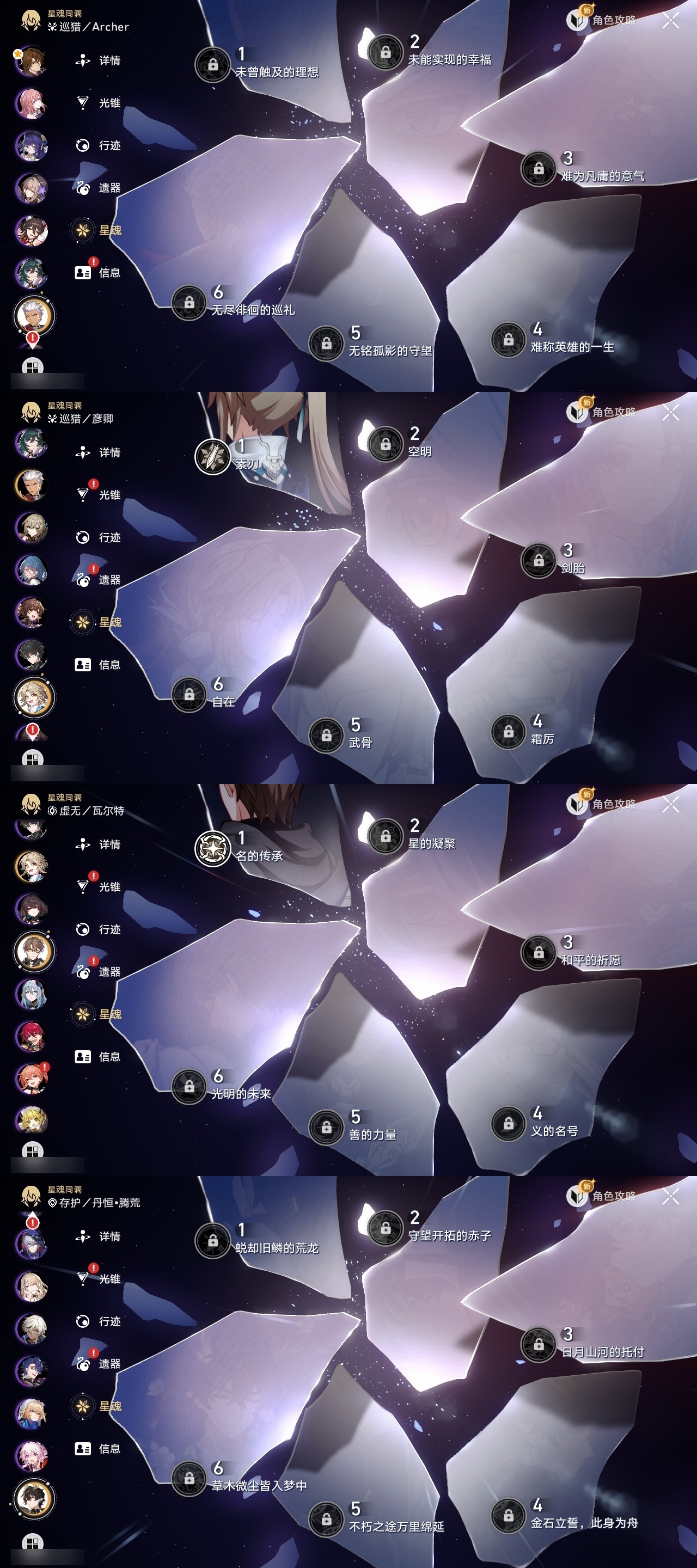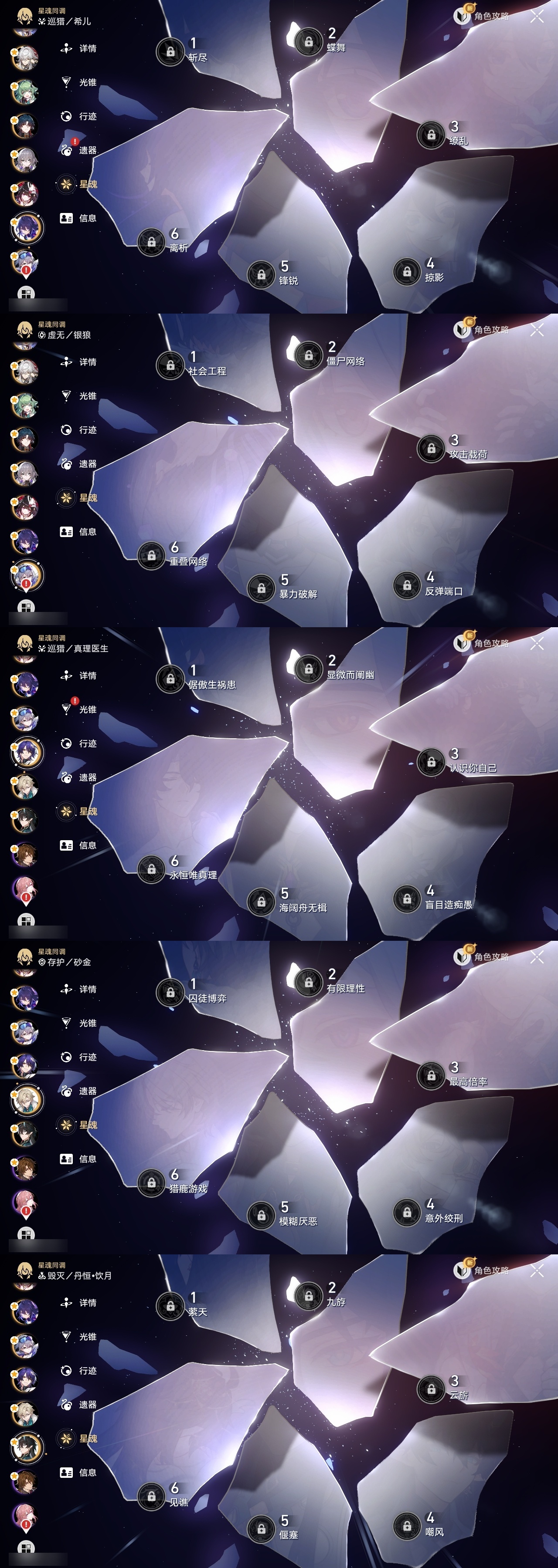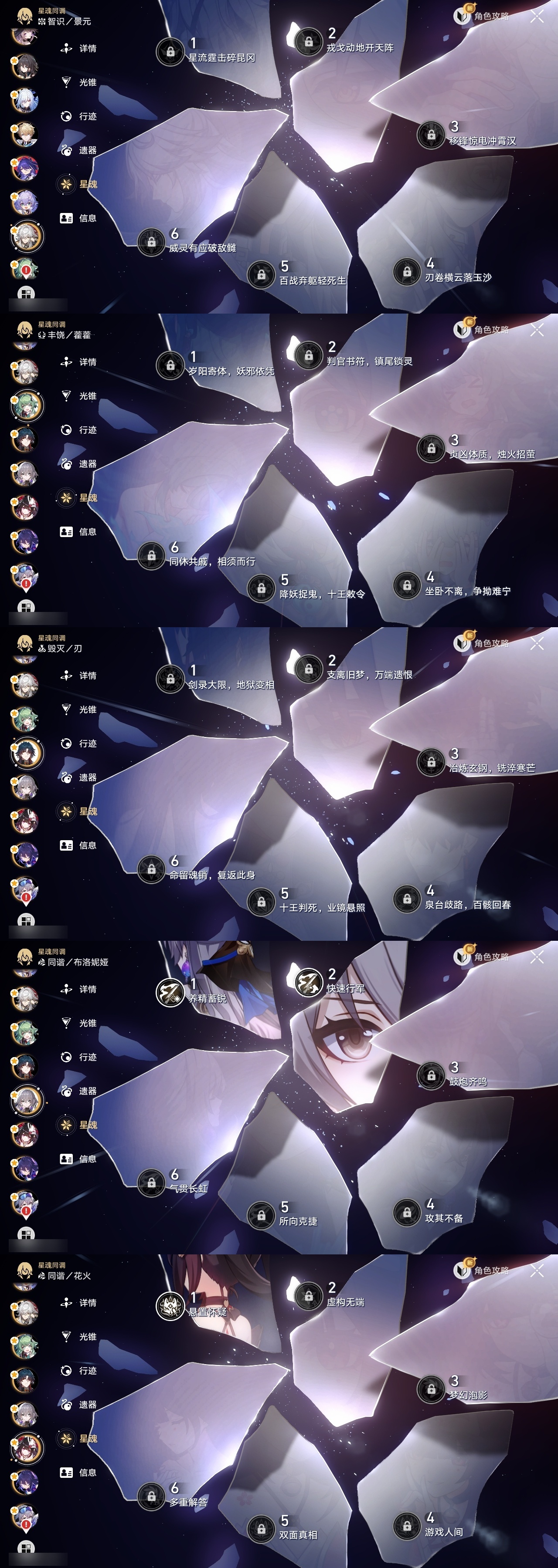【崩坏·星穹铁道】【lyxq8504】冒险等级:70,女主,五星数量:51,五星角色:姬子 3命布洛妮娅 2命杰帕德 2命遐蝶 2命黄泉 2命白露 1命彦卿 1命瓦尔特 1命镜流 1命花火 1命银狼景元希儿灵砂大黑塔忘归人罗刹刃丹恒·饮月藿藿银枝真理医生砂金知更鸟archer长夜月丹恒·腾荒流萤__五星光锥:星海巡航 5精记忆的质料 5精记一位星神的陨落 5精不息的演算 5精孤独的疗愈 5精银河铁道之夜以世界之名无可取代的东西时节不居时节不居时节不居但战斗还未结束但战斗还未结束于夜色中长路终有归途让告别,更美一些此身为剑惊魂夜镜中故我游戏尘寰行于流逝的岸记忆永不落幕致长夜的星光__四星角色:阿兰 6命娜塔莎 6命虎克 6命貊泽 6命黑塔 6命丹恒 6命艾丝妲 6命希露瓦 6命停云 6命素裳 6命青雀 6命佩拉 6命驭空 6命卢卡 6命玲可 6命寒鸦 6命雪衣 6命米沙 6命加拉赫 6命桂乃芬 5命桑博 2命三月七 2命