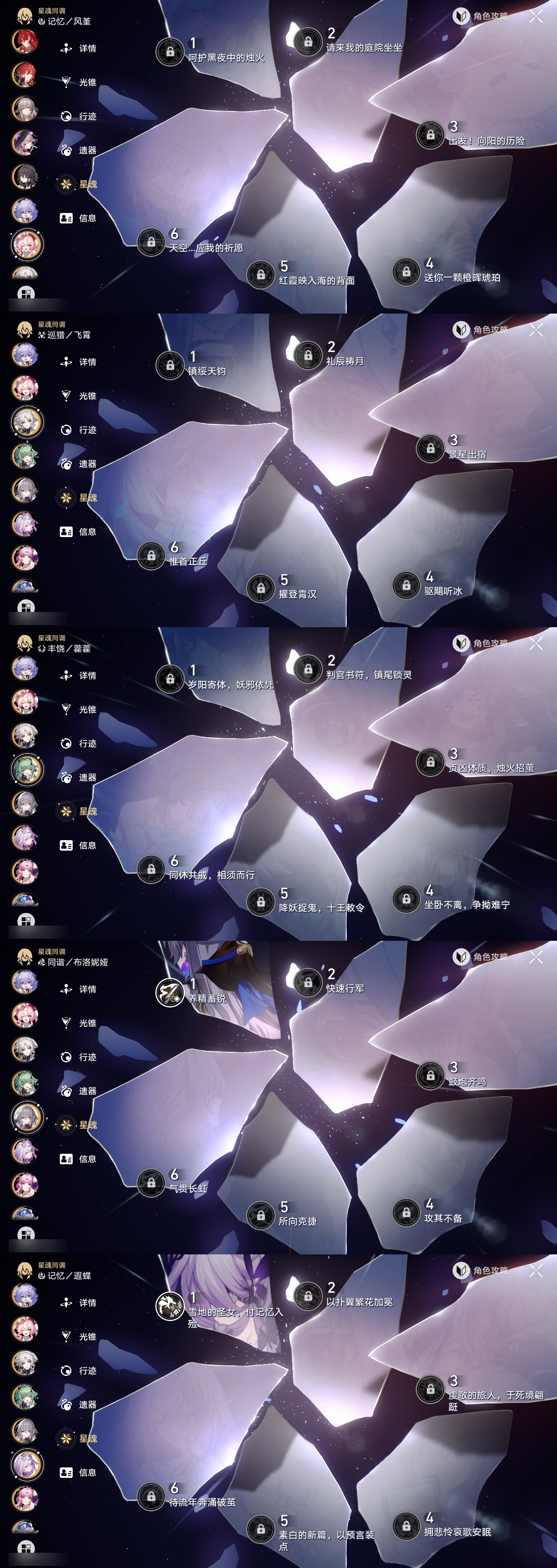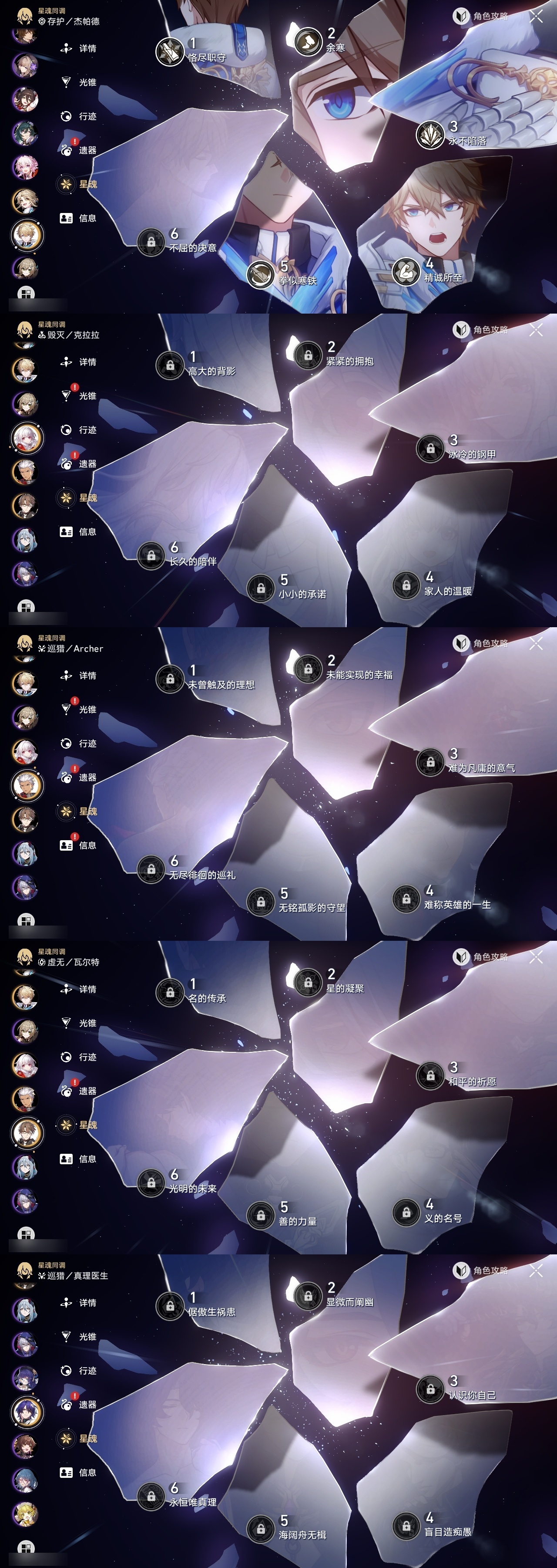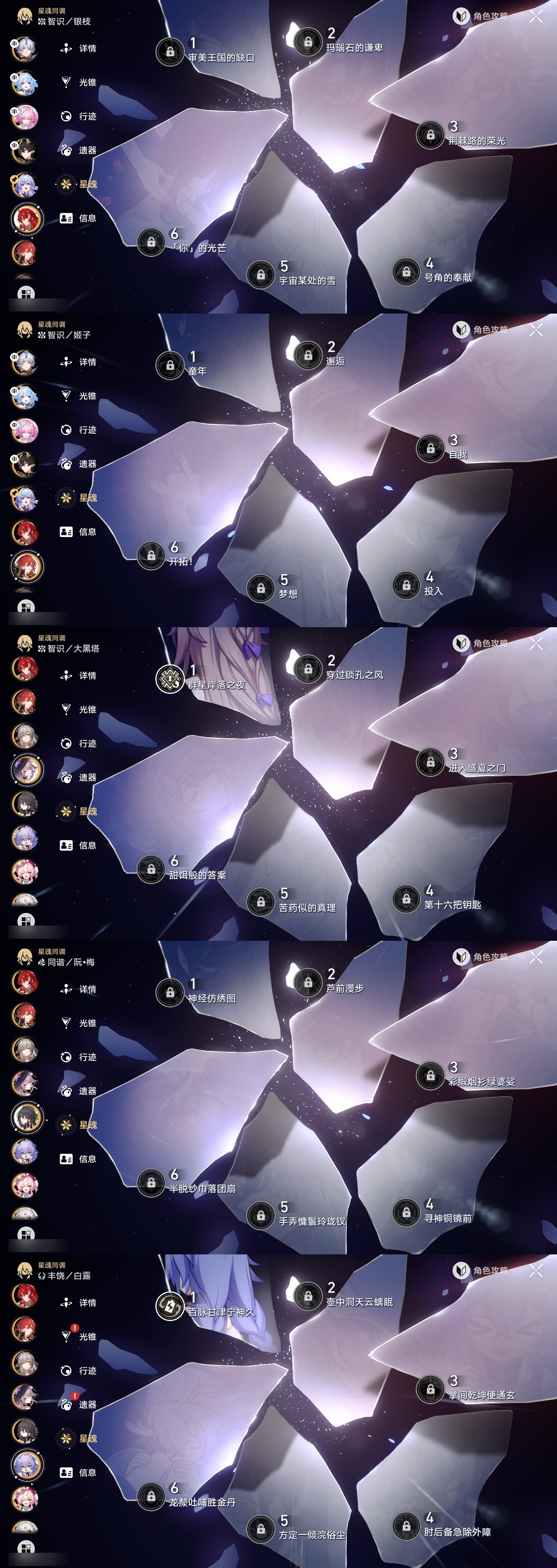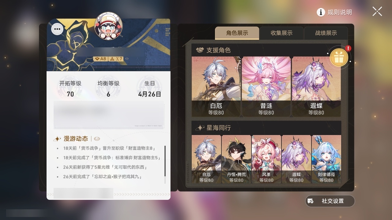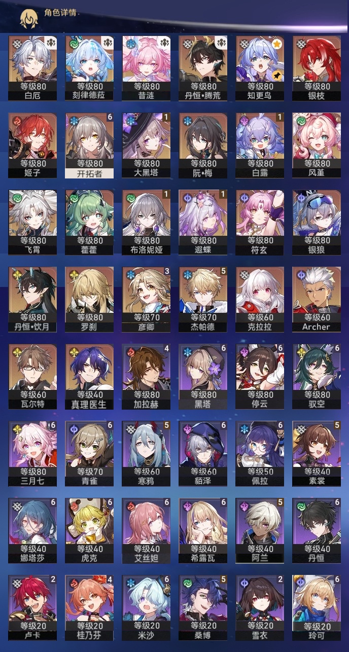 【崩坏·星穹铁道】【lyxq8578】冒险等级:70,女主,五星数量:34,五星角色:杰帕德 5命彦卿 3命白露 1命布洛妮娅 1命大黑塔 1命遐蝶 1命飞霄银狼姬子瓦尔特克拉拉罗刹丹恒·饮月符玄藿藿银枝真理医生风堇知更鸟白厄archer刻律德菈丹恒·腾荒昔涟__五星光锥:星海巡航银河铁道之夜银河铁道之夜无可取代的东西时节不居比阳光更明亮的让告别,更美一些烦恼着,幸福着片刻,留在眼底记忆永不落幕__四星角色:娜塔莎 6命虎克 6命貊泽 6命黑塔 6命丹恒 6命艾丝妲 6命希露瓦 6命停云 6命三月七 6命青雀 6命佩拉 6命驭空 6命玲可 6命米沙 6命阿兰 5命素裳 5命桑博 5命寒鸦 5命桂乃芬 4命加拉赫 4命卢卡 2命雪衣 2命