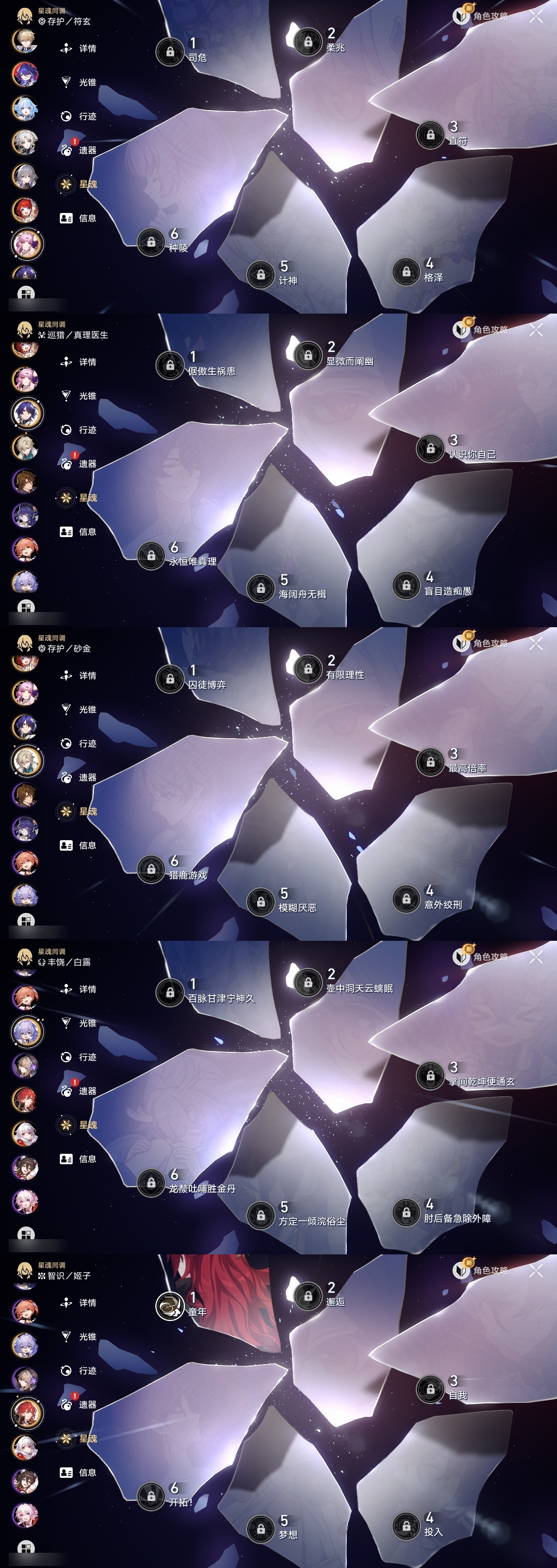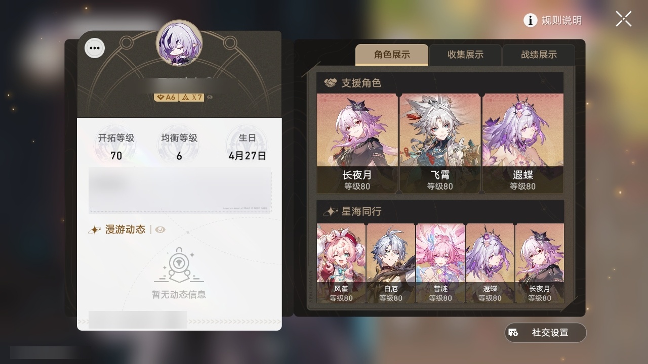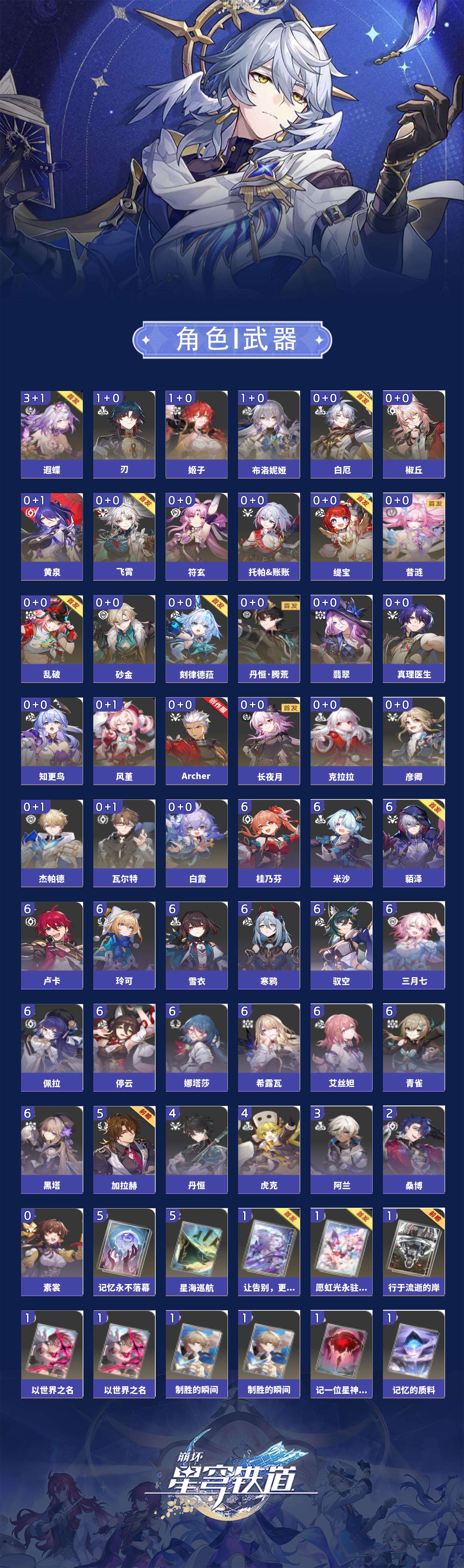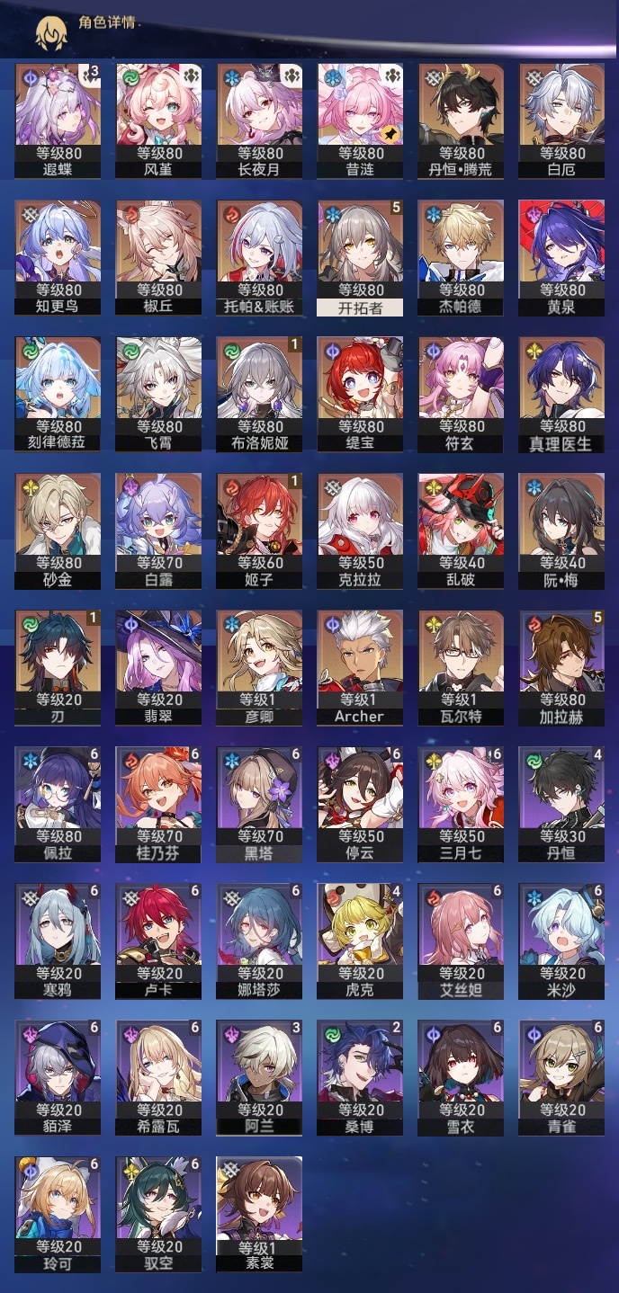 【崩坏·星穹铁道】【lyxq8571】冒险等级:70,女主,五星数量:39,五星角色:遐蝶 3命布洛妮娅 1命姬子 1命刃 1命椒丘飞霄白露杰帕德彦卿瓦尔特克拉拉乱破缇宝符玄托帕账账真理医生黄泉风堇砂金知更鸟白厄archer刻律德菈长夜月丹恒·腾荒昔涟翡翠__五星光锥:星海巡航 5精记忆永不落幕 5精记忆的质料记一位星神的陨落制胜的瞬间制胜的瞬间以世界之名以世界之名不息的演算让告别,更美一些行于流逝的岸愿虹光永驻天空__四星角色:娜塔莎 6命貊泽 6命黑塔 6命艾丝妲 6命希露瓦 6命停云 6命三月七 6命青雀 6命佩拉 6命驭空 6命卢卡 6命玲可 6命桂乃芬 6命寒鸦 6命雪衣 6命米沙 6命加拉赫 5命虎克 4命丹恒 4命阿兰 3命桑博 2命素裳