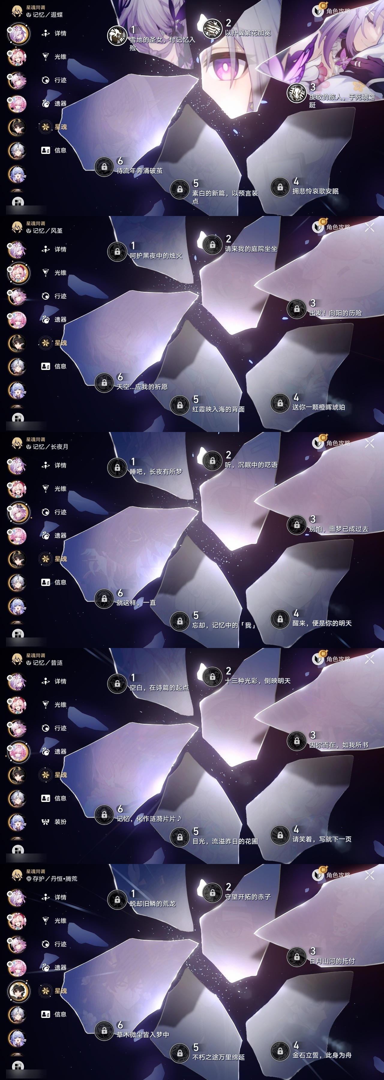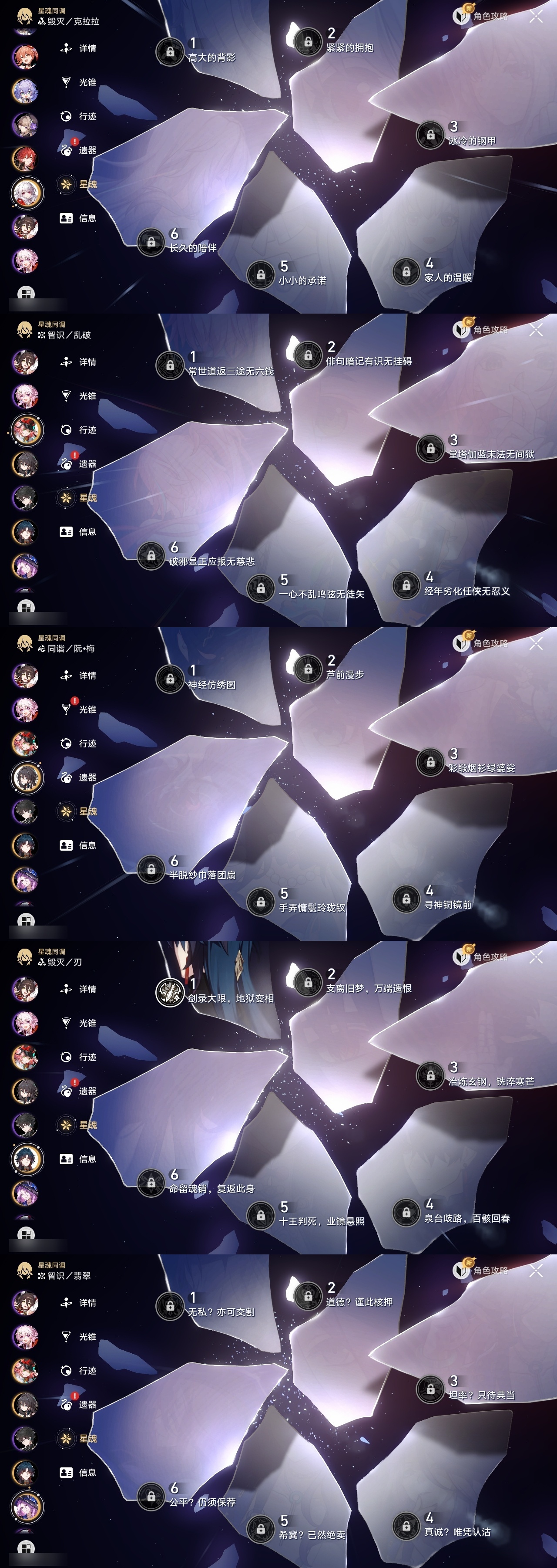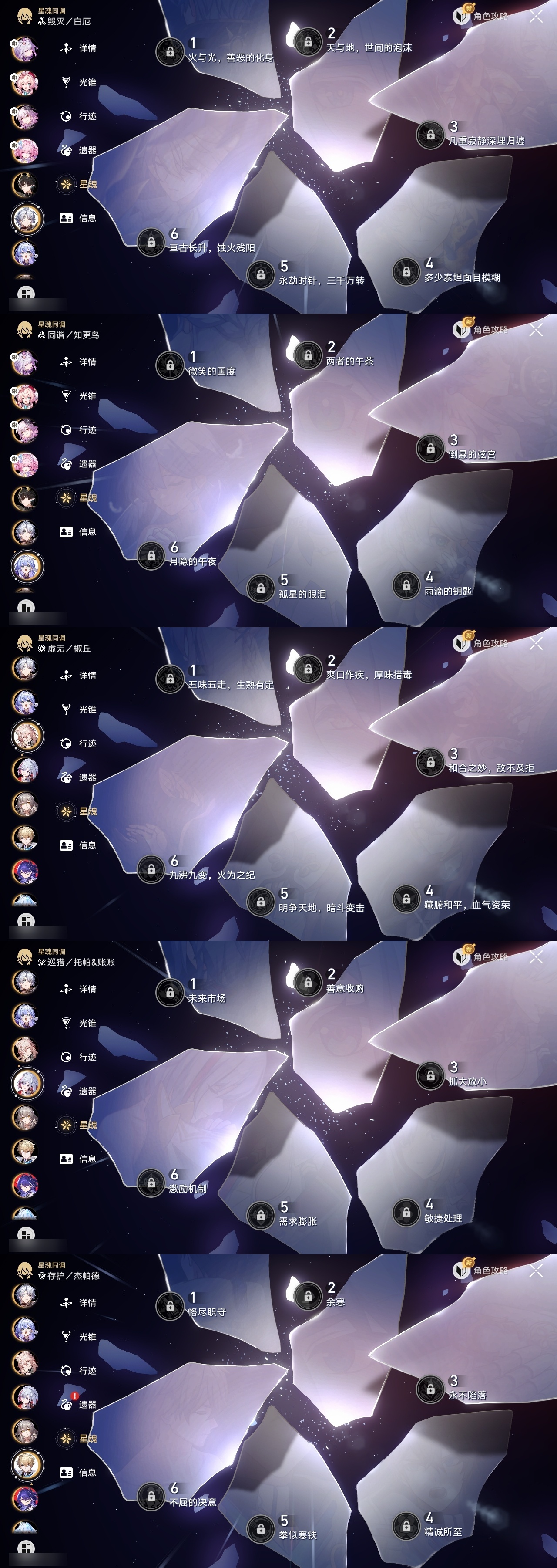 【崩坏·星穹铁道】【lyxq8571】冒险等级:70,女主,五星数量:39,五星角色:遐蝶 3命布洛妮娅 1命姬子 1命刃 1命椒丘飞霄白露杰帕德彦卿瓦尔特克拉拉乱破缇宝符玄托帕账账真理医生黄泉风堇砂金知更鸟白厄archer刻律德菈长夜月丹恒·腾荒昔涟翡翠__五星光锥:星海巡航 5精记忆永不落幕 5精记忆的质料记一位星神的陨落制胜的瞬间制胜的瞬间以世界之名以世界之名不息的演算让告别,更美一些行于流逝的岸愿虹光永驻天空__四星角色:娜塔莎 6命貊泽 6命黑塔 6命艾丝妲 6命希露瓦 6命停云 6命三月七 6命青雀 6命佩拉 6命驭空 6命卢卡 6命玲可 6命桂乃芬 6命寒鸦 6命雪衣 6命米沙 6命加拉赫 5命虎克 4命丹恒 4命阿兰 3命桑博 2命素裳