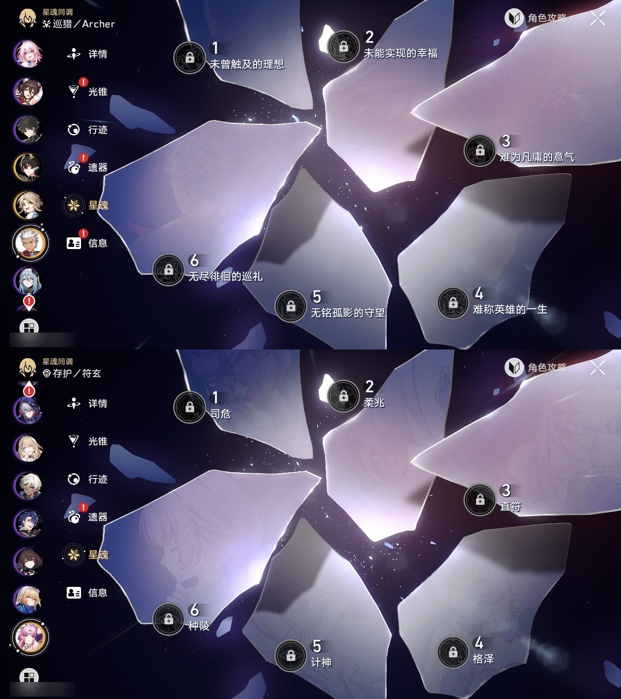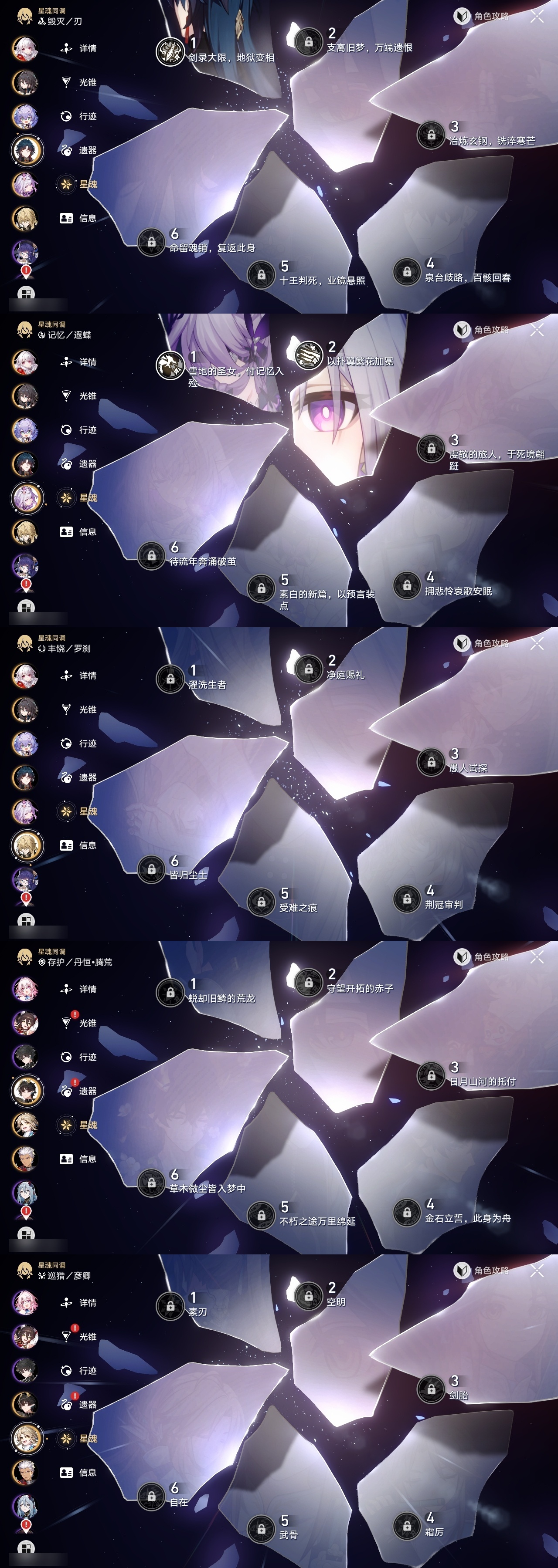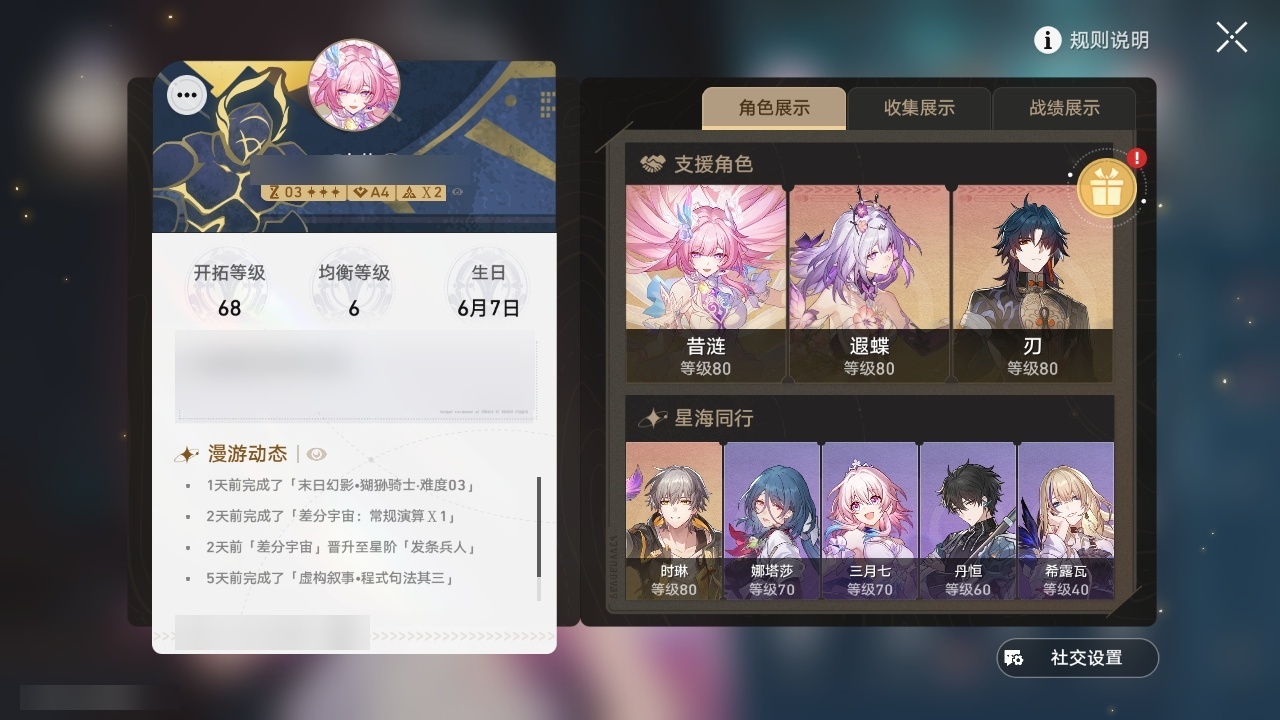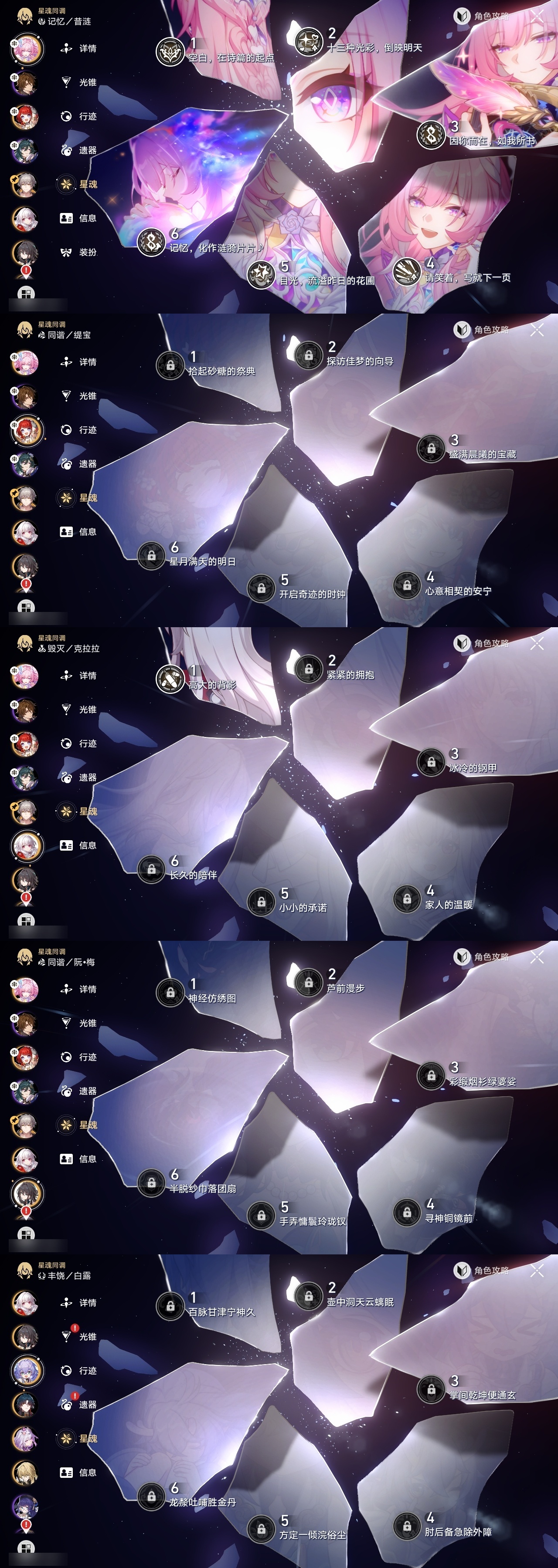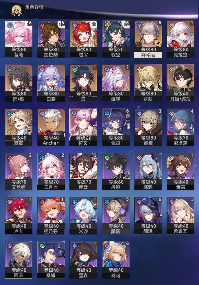 【崩坏·星穹铁道】【lyxq8555】冒险等级:68,男主,五星数量:18,五星角色:昔涟 6命遐蝶 2命克拉拉 1命刃 1命白露彦卿罗刹缇宝符玄archer丹恒·腾荒__五星光锥:记忆永不落幕 3精记一位星神的陨落无可取代的东西时节不居如果时间是一朵花让告别,更美一些爱如此刻永恒__四星角色:貊泽 6命佩拉 6命玲可 6命加拉赫 6命黑塔 5命驭空 5命娜塔莎 4命希露瓦 3命停云 3命青雀 3命艾丝妲 2命三月七 2命素裳 1命卢卡 1命桂乃芬 1命雪衣 1命米沙 1命阿兰丹恒桑博寒鸦
