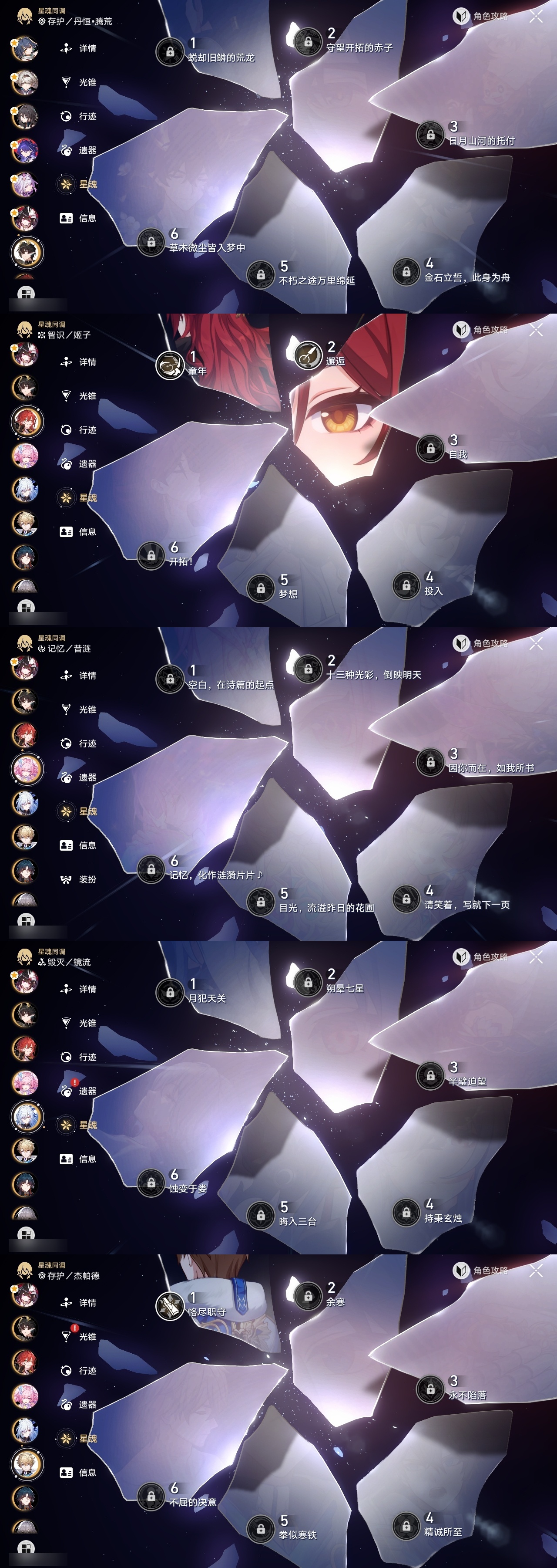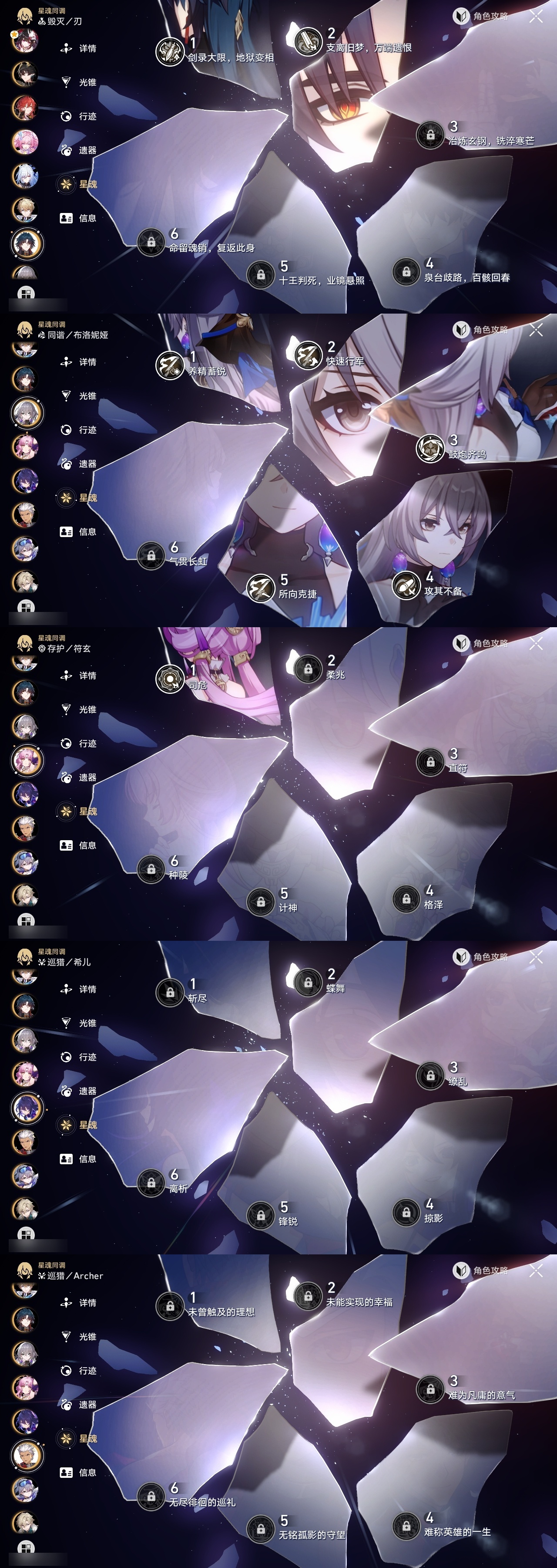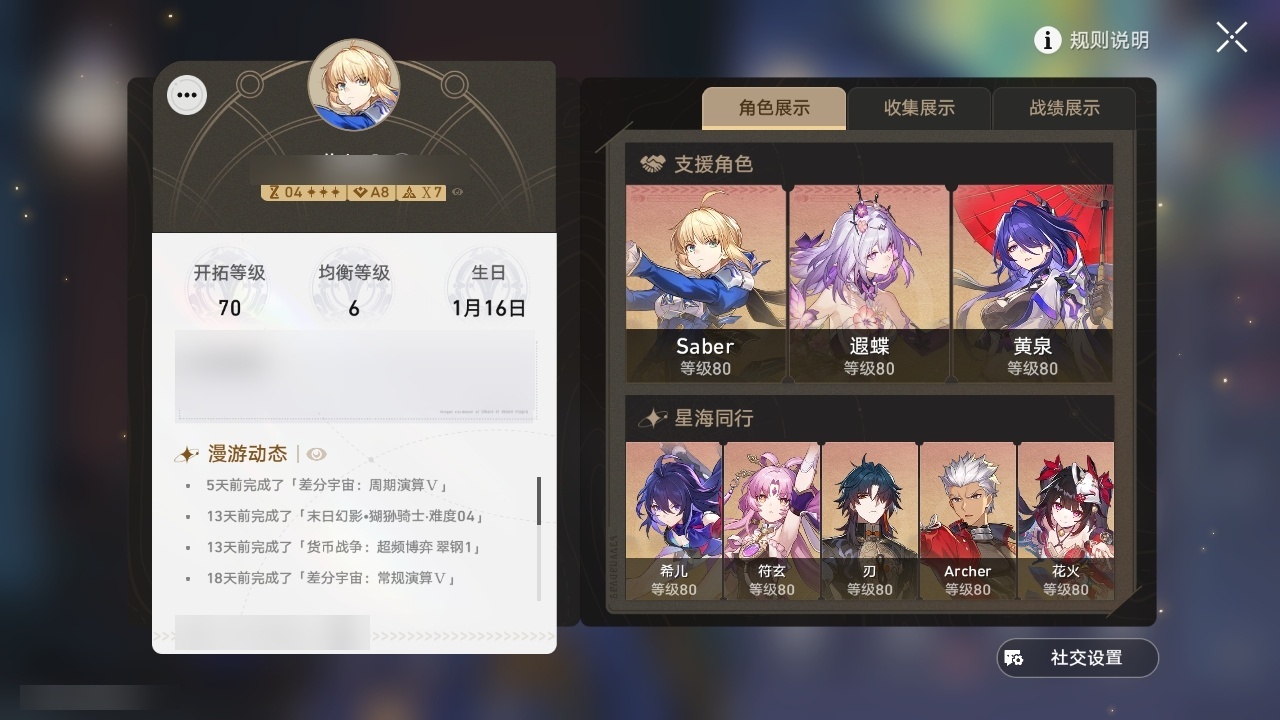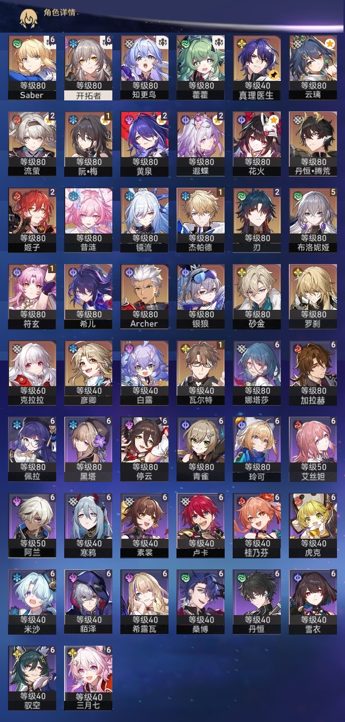 【崩坏·星穹铁道】【lyxq8585】冒险等级:70,女主,五星数量:45,五星角色:saber 6命布洛妮娅 5命姬子 2命刃 2命遐蝶 2命黄泉 2命流萤 2命杰帕德 1命瓦尔特 1命符玄 1命云璃银狼希儿白露彦卿克拉拉罗刹镜流藿藿真理医生花火砂金知更鸟archer丹恒·腾荒昔涟__五星光锥:记一位星神的陨落 5精不息的演算 5精记忆永不落幕 5精记忆的质料 3精落日时起舞星海巡航银河铁道之夜时节不居如泥酣眠如泥酣眠但战斗还未结束但战斗还未结束于夜色中她已闭上双眼让告别,更美一些此身为剑行于流逝的岸理想燃烧的地狱没有回报的加冕__四星角色:阿兰 6命娜塔莎 6命虎克 6命貊泽 6命黑塔 6命丹恒 6命艾丝妲 6命希露瓦 6命停云 6命素裳 6命桑博 6命三月七 6命青雀 6命佩拉 6命驭空 6命卢卡 6命玲可 6命桂乃芬 6命寒鸦 6命雪衣 6命米沙 6命加拉赫 6命