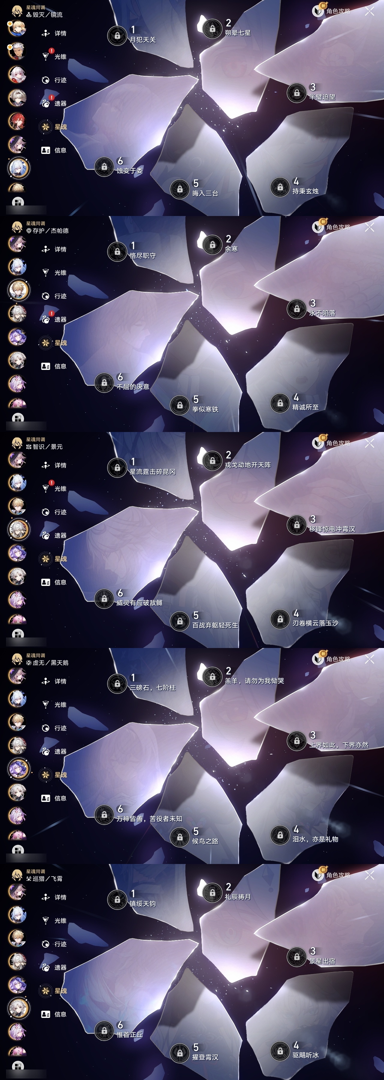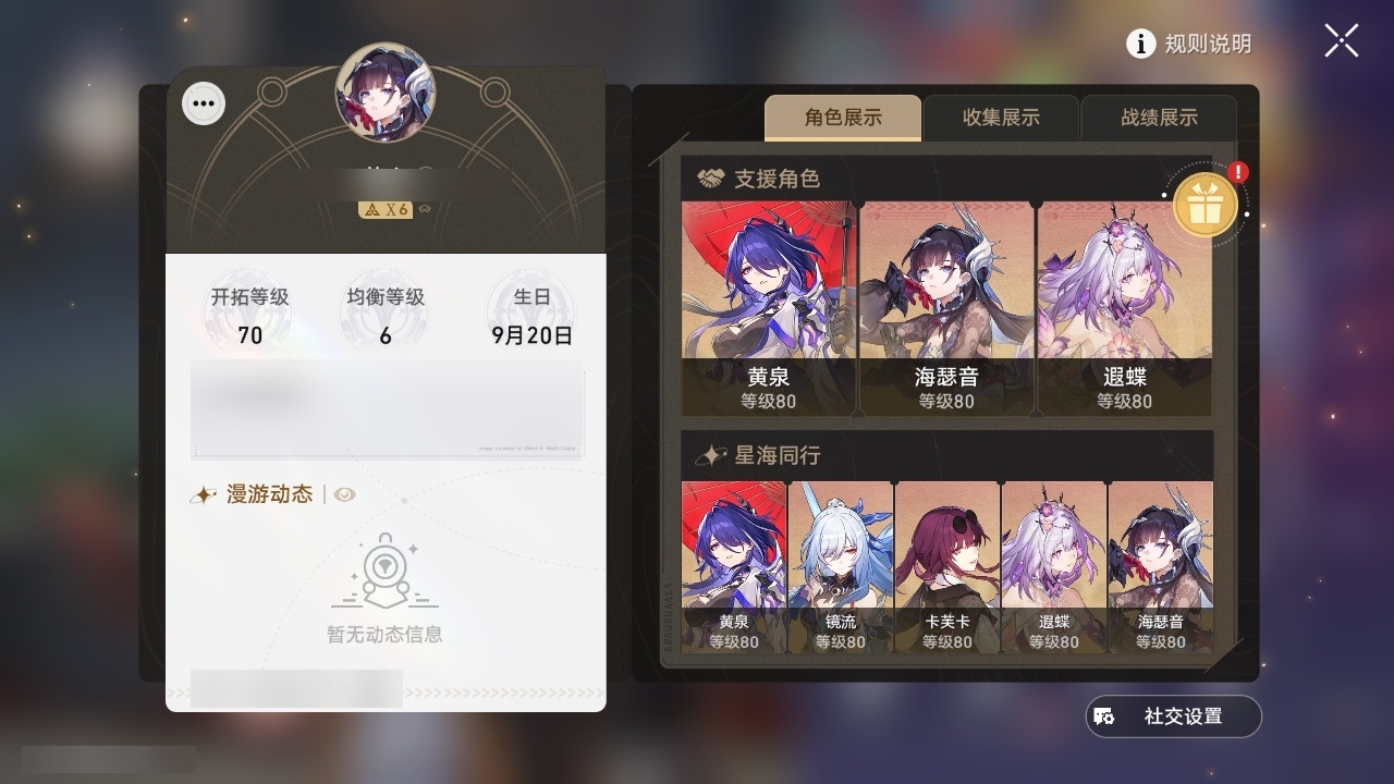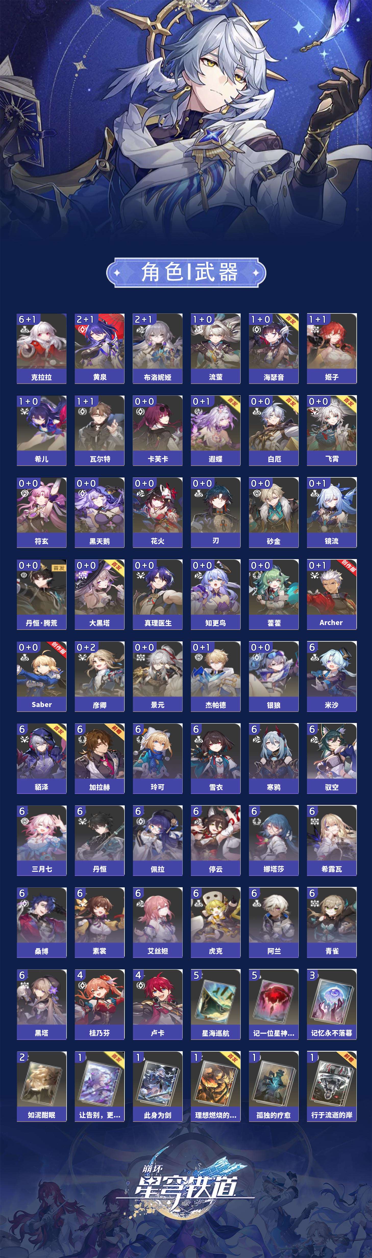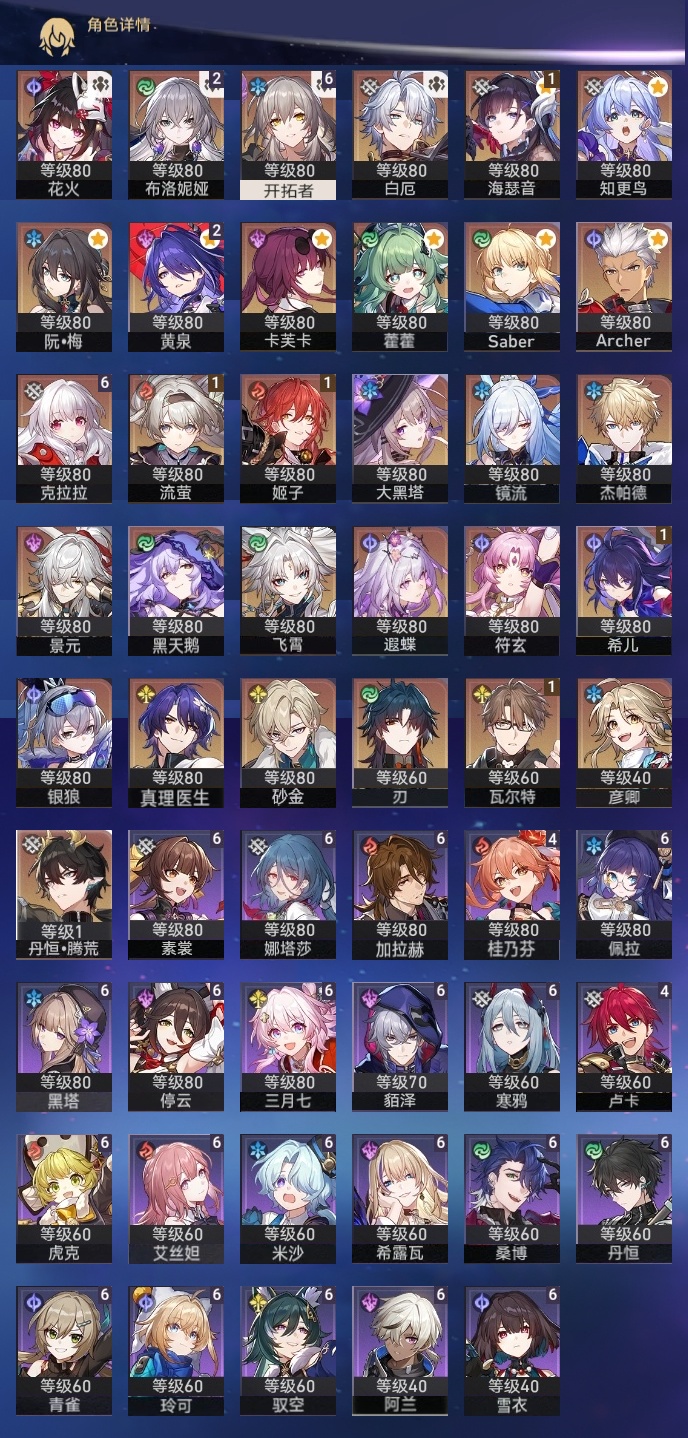 【崩坏·星穹铁道】【lyxq8631】冒险等级:70,女主,五星数量:43,五星角色:克拉拉 6命布洛妮娅 2命黄泉 2命希儿 1命姬子 1命瓦尔特 1命海瑟音 1命流萤 1命飞霄银狼景元杰帕德彦卿大黑塔刃卡芙卡遐蝶符玄镜流藿藿真理医生黑天鹅花火砂金知更鸟白厄saberarcher丹恒·腾荒__五星光锥:星海巡航 5精记一位星神的陨落 5精记忆永不落幕 3精如泥酣眠 2精制胜的瞬间银河铁道之夜以世界之名无可取代的东西但战斗还未结束孤独的疗愈让告别,更美一些此身为剑行于流逝的岸理想燃烧的地狱__四星角色:阿兰 6命娜塔莎 6命虎克 6命貊泽 6命黑塔 6命丹恒 6命艾丝妲 6命希露瓦 6命停云 6命素裳 6命桑博 6命三月七 6命青雀 6命佩拉 6命驭空 6命玲可 6命寒鸦 6命雪衣 6命米沙 6命加拉赫 6命卢卡 4命桂乃芬 4命