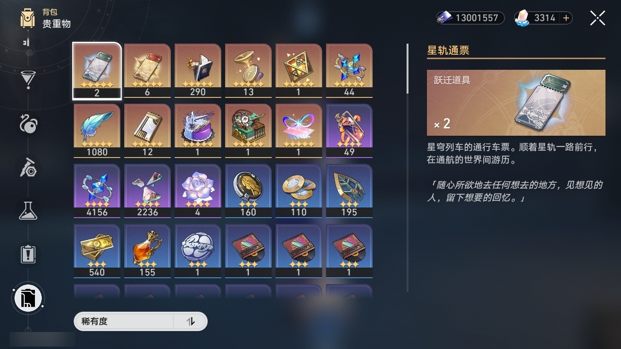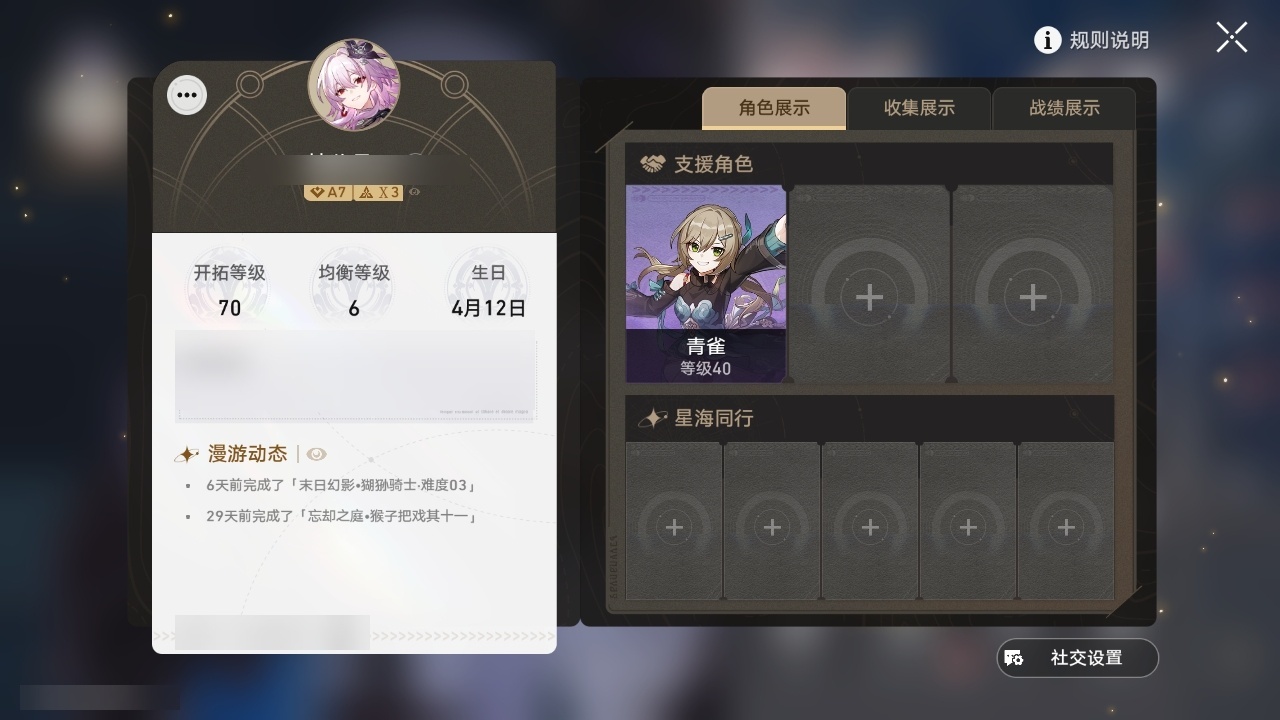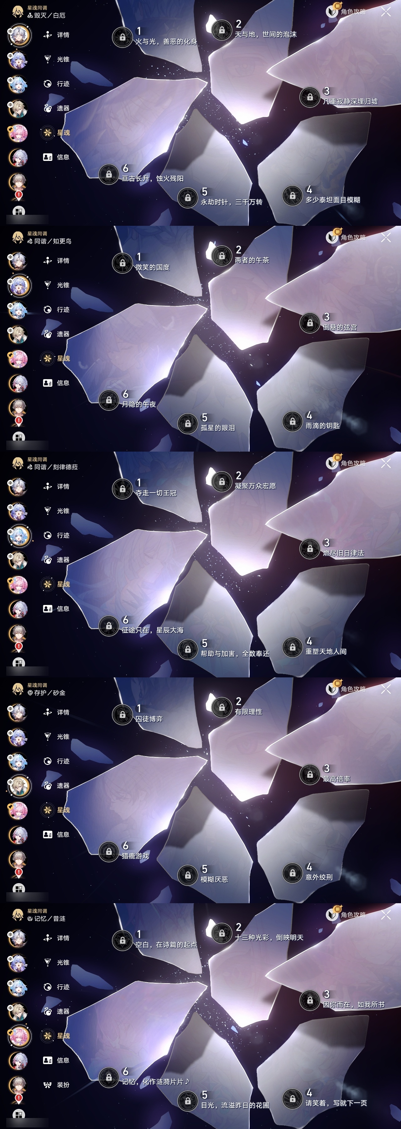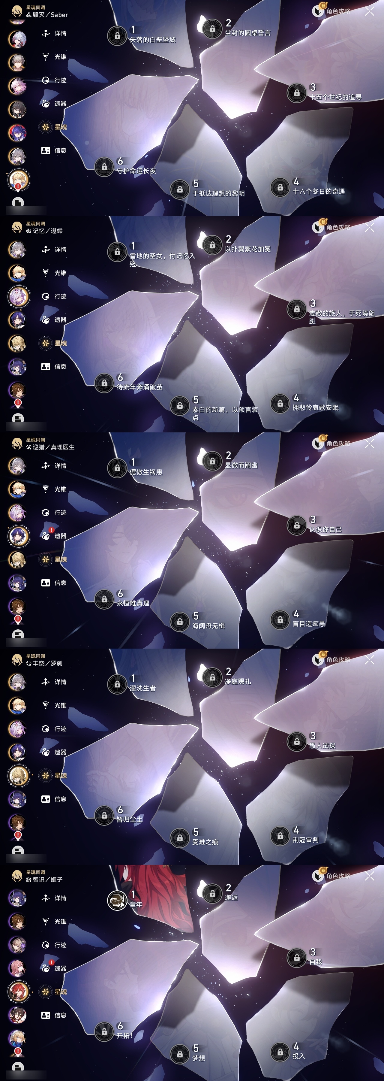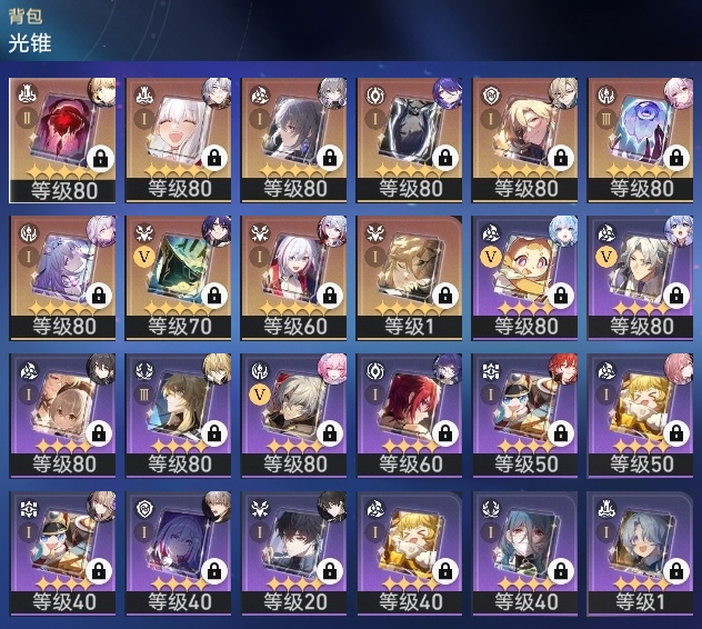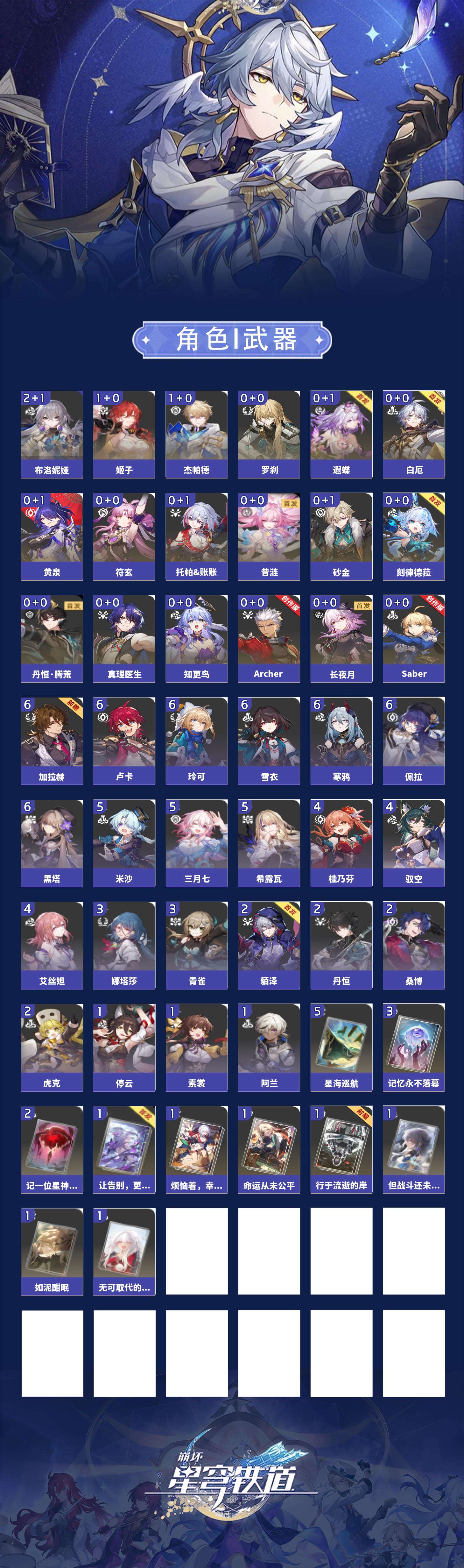 【崩坏·星穹铁道】【lyxq8646】冒险等级:70,男主,五星数量:28,五星角色:布洛妮娅 2命姬子 1命杰帕德 1命罗刹遐蝶符玄托帕账账真理医生黄泉砂金知更鸟白厄saberarcher刻律德菈长夜月丹恒·腾荒昔涟__五星光锥:星海巡航 5精记忆永不落幕 3精记一位星神的陨落 2精无可取代的东西如泥酣眠但战斗还未结束让告别,更美一些烦恼着,幸福着行于流逝的岸命运从未公平__四星角色:黑塔 6命佩拉 6命卢卡 6命玲可 6命寒鸦 6命雪衣 6命加拉赫 6命希露瓦 5命三月七 5命米沙 5命艾丝妲 4命驭空 4命桂乃芬 4命娜塔莎 3命青雀 3命貊泽 2命虎克 2命丹恒 2命桑博 2命阿兰 1命停云 1命素裳 1命