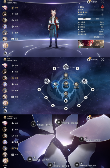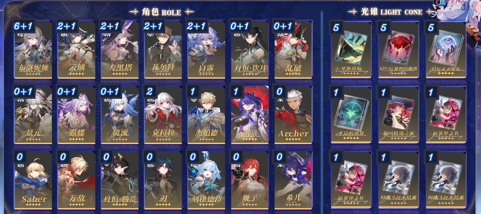 [15302468]m24554,70级 87黄,女主,38个五星角色:满命布洛妮娅,2命白露,2命瓦尔特,2命克拉拉,2命大黑塔,2命云璃,1命黄泉,1命杰帕德,砂金,花火,黑天鹅,真理医生,阮梅,藿藿,托帕账账,镜流,刃,银狼,景元,希儿,姬子,风堇,星期日,长夜月,丹恒腾荒,波提欧,流萤,椒丘,知更鸟,阿格莱雅,刻律德菈,saber,遐蝶,缇宝,archer,万敌,乱破,丹恒·饮月, 时装:冬去煦至;19个五星光锥:精5记一位星神的陨落,精5星海巡航,精5记忆永不落幕,精1落日时起舞,精1比阳光更明亮的,精1此身为剑,精1向着不可追问处,精1忍法帖缭乱破魔,精1拂晓之前,精1但战斗还未结束2,精1以世界之名2,精1时节不居3,精1让告别更美一些,精1不息的演算,精1银河铁道之夜, 梦华0,星琼6,星轨专票0