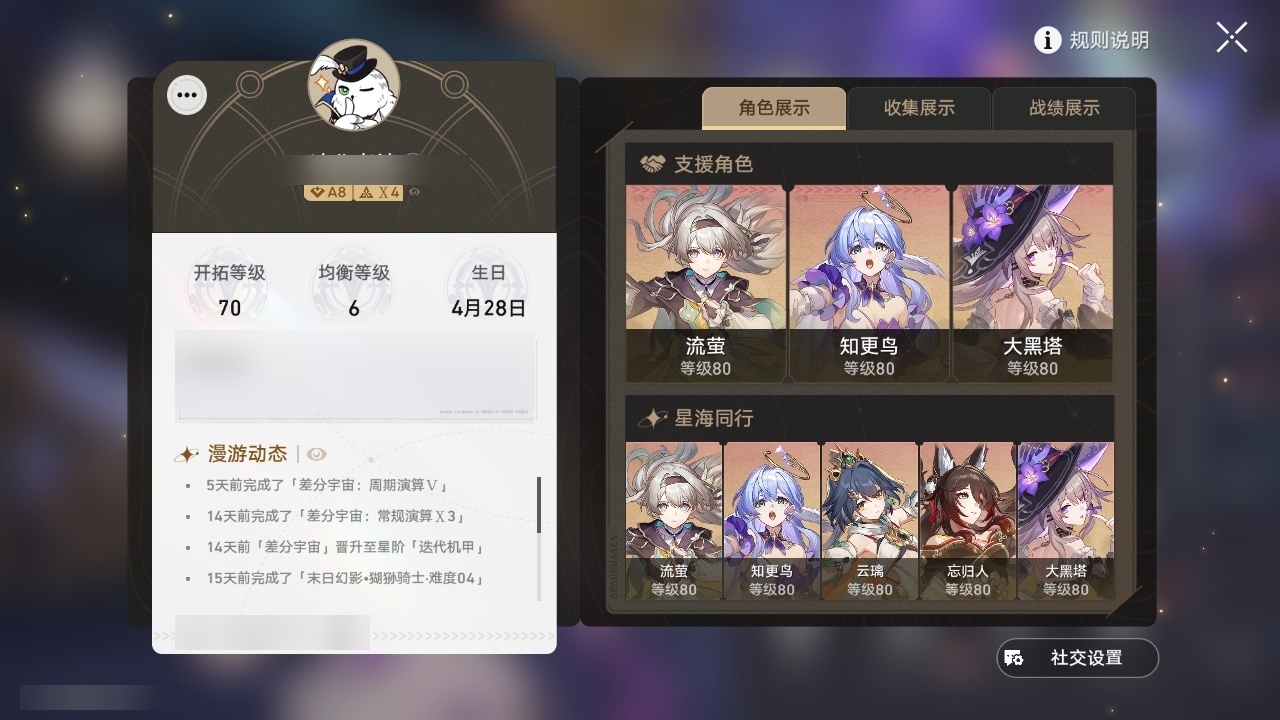 【崩坏·星穹铁道】【lyxq8656】冒险等级:70,女主,五星数量:39,五星角色:布洛妮娅 4命彦卿 4命姬子 2命流萤 2命杰帕德 1命缇宝 1命符玄 1命那刻夏 1命长夜月 1命云璃希儿克拉拉大黑塔忘归人遐蝶镜流藿藿真理医生花火黄泉风堇知更鸟白厄archer刻律德菈丹恒·腾荒__五星光锥:记一位星神的陨落 5精孤独的疗愈 4精记忆永不落幕 3精星海巡航 2精落日时起舞银河铁道之夜无可取代的东西时节不居时节不居向着不可追问处向着不可追问处此身为剑梦应归于何处__四星角色:阿兰 6命娜塔莎 6命貊泽 6命黑塔 6命丹恒 6命艾丝妲 6命希露瓦 6命停云 6命素裳 6命三月七 6命青雀 6命佩拉 6命驭空 6命卢卡 6命玲可 6命桂乃芬 6命寒鸦 6命雪衣 6命米沙 6命加拉赫 6命虎克 5命桑博 5命