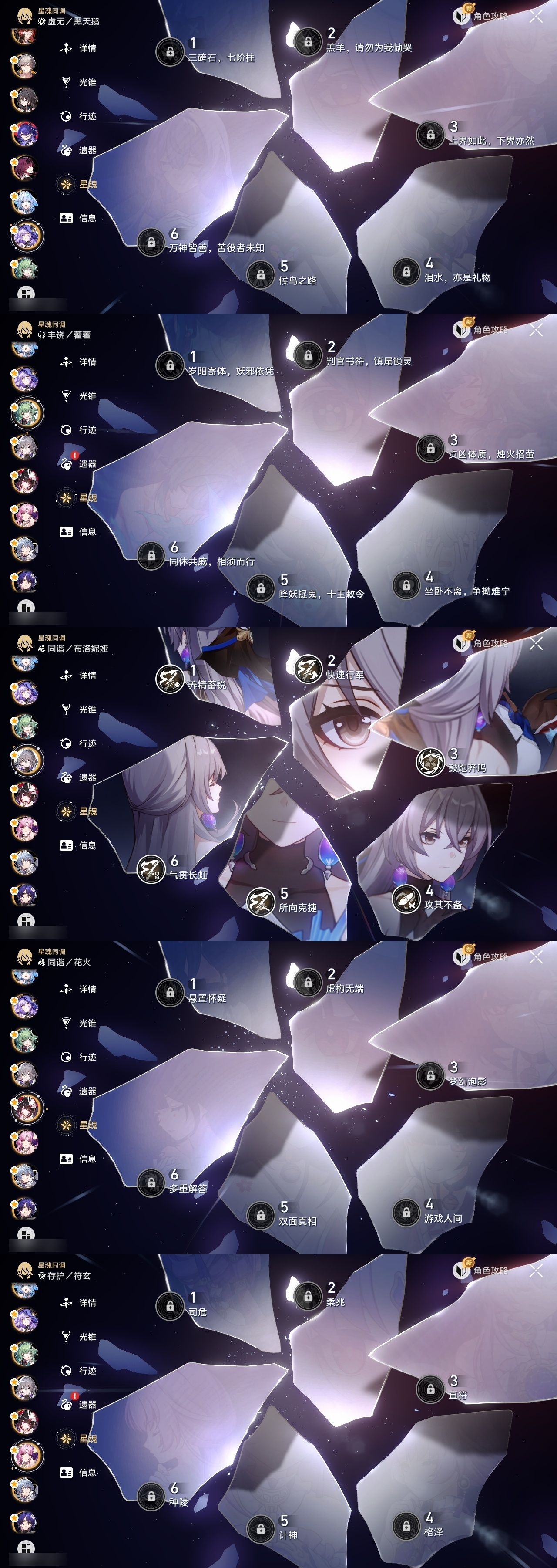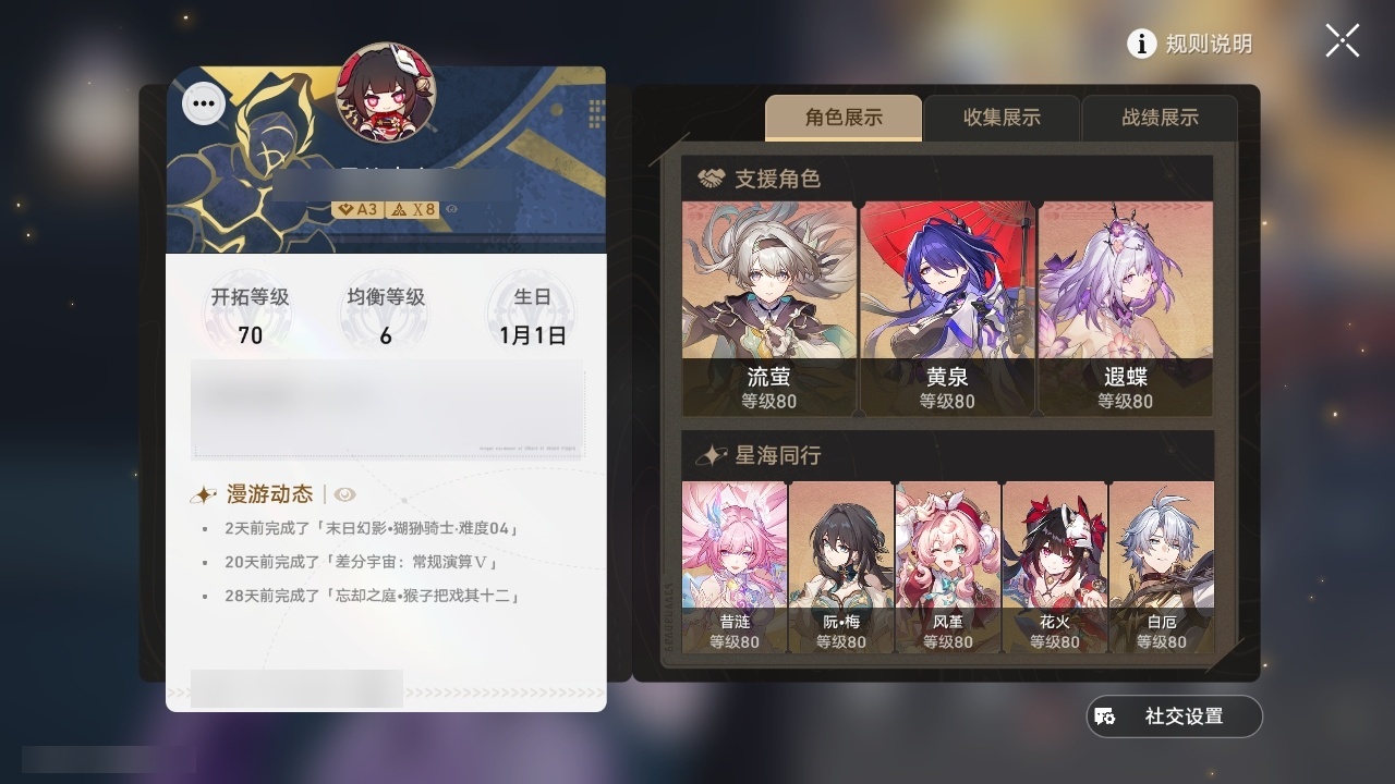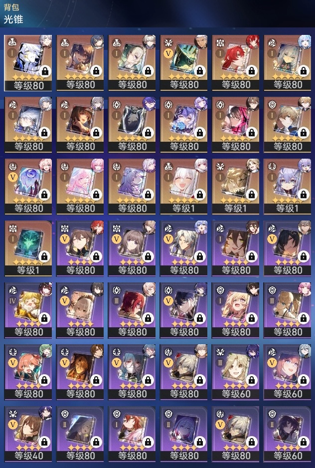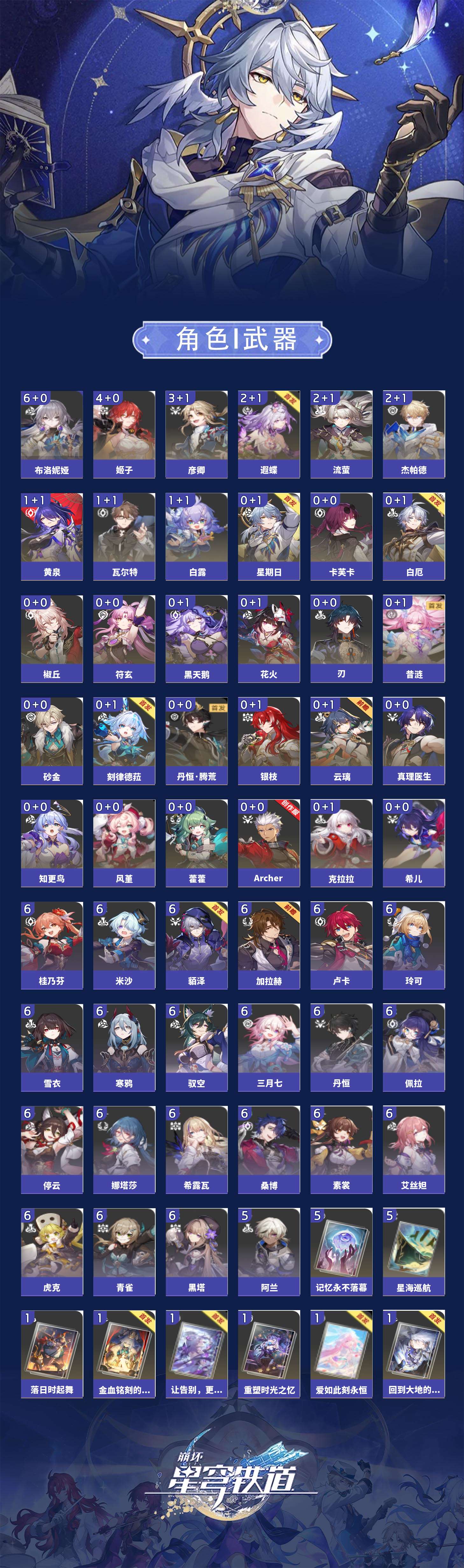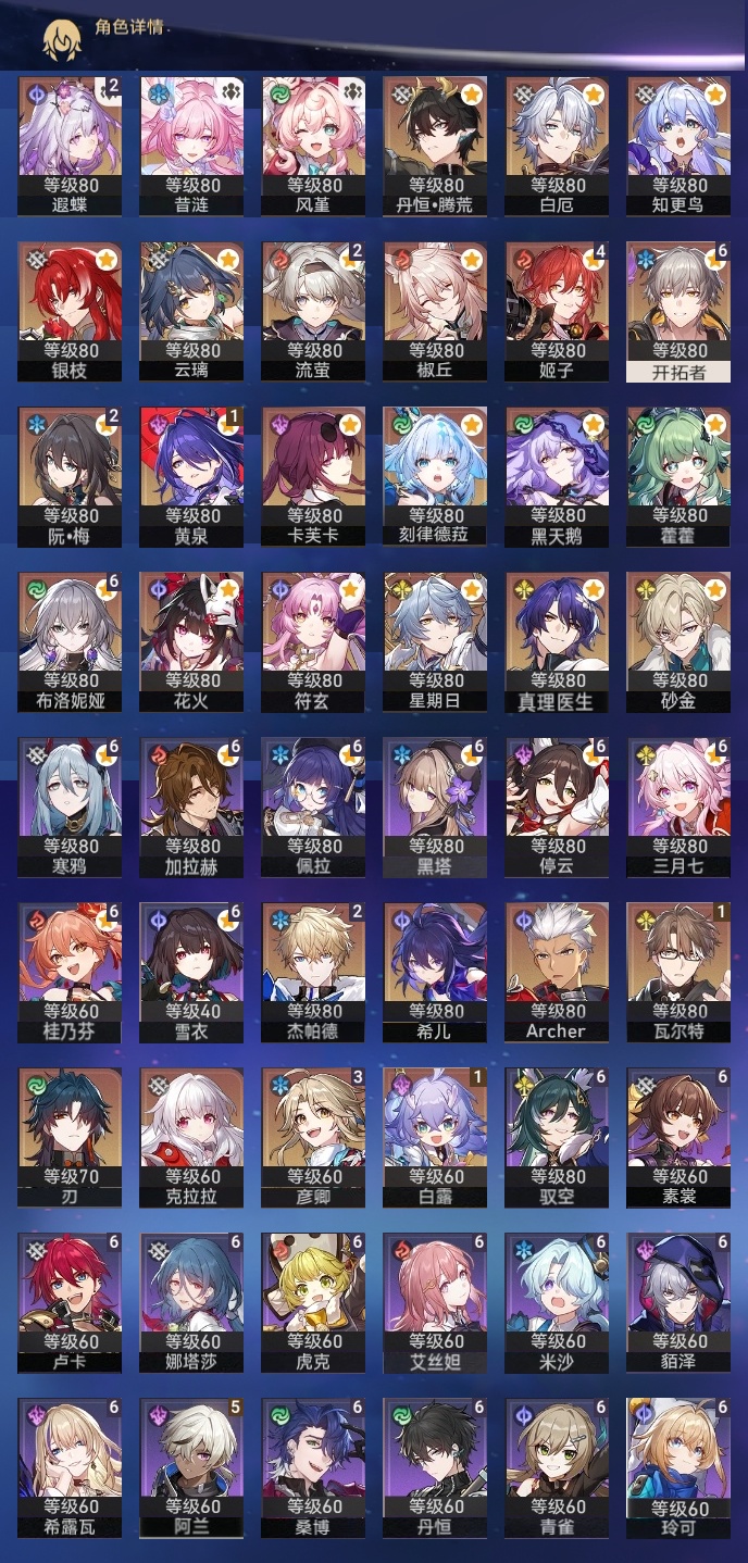 【崩坏·星穹铁道】【lyxq8655】冒险等级:70,男主,五星数量:49,五星角色:布洛妮娅 6命姬子 4命彦卿 3命杰帕德 2命遐蝶 2命流萤 2命白露 1命瓦尔特 1命黄泉 1命云璃椒丘希儿克拉拉星期日刃卡芙卡符玄藿藿银枝真理医生黑天鹅花火风堇砂金知更鸟白厄archer刻律德菈丹恒·腾荒昔涟__五星光锥:星海巡航 5精记忆永不落幕 5精落日时起舞制胜的瞬间以世界之名无可取代的东西时节不居如泥酣眠不息的演算回到大地的飞行让告别,更美一些片刻,留在眼底重塑时光之忆游戏尘寰行于流逝的岸黎明恰如此燃烧金血铭刻的时代爱如此刻永恒梦应归于何处__四星角色:娜塔莎 6命虎克 6命貊泽 6命黑塔 6命丹恒 6命艾丝妲 6命希露瓦 6命停云 6命素裳 6命桑博 6命三月七 6命青雀 6命佩拉 6命驭空 6命卢卡 6命玲可 6命桂乃芬 6命寒鸦 6命雪衣 6命米沙 6命加拉赫 6命阿兰 5命