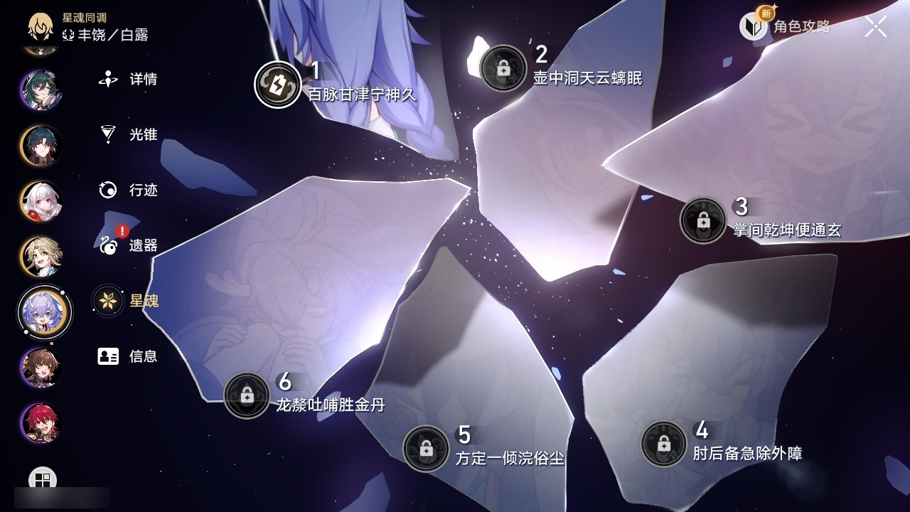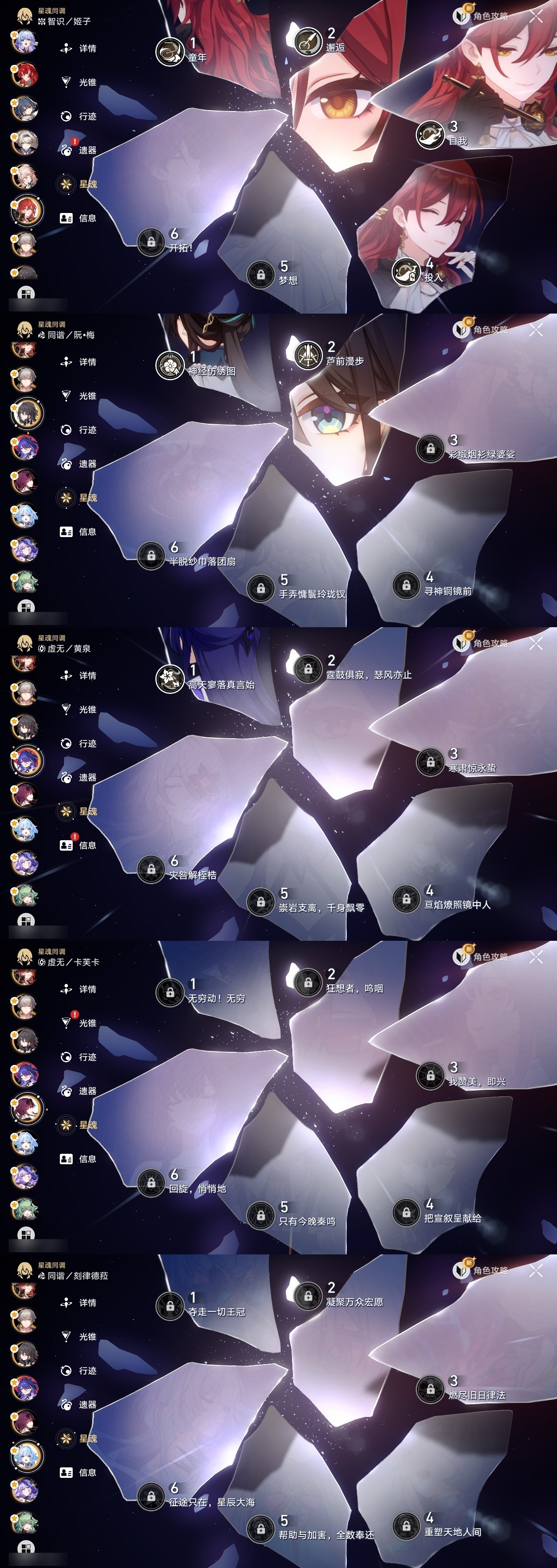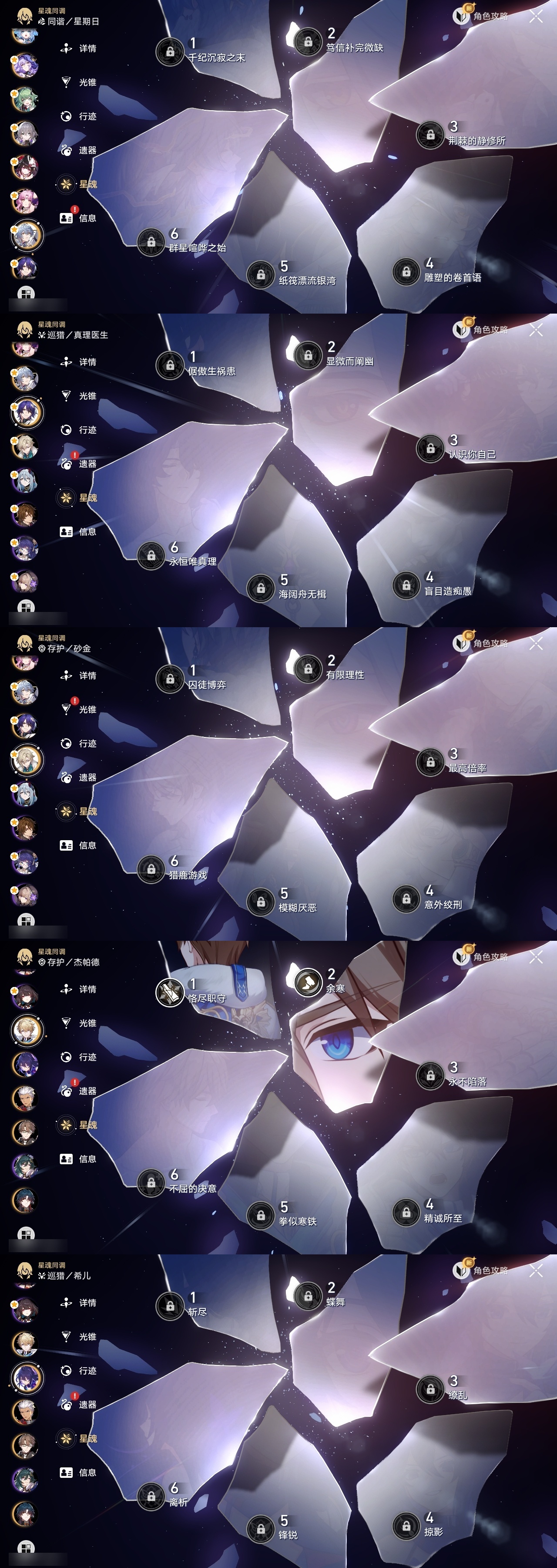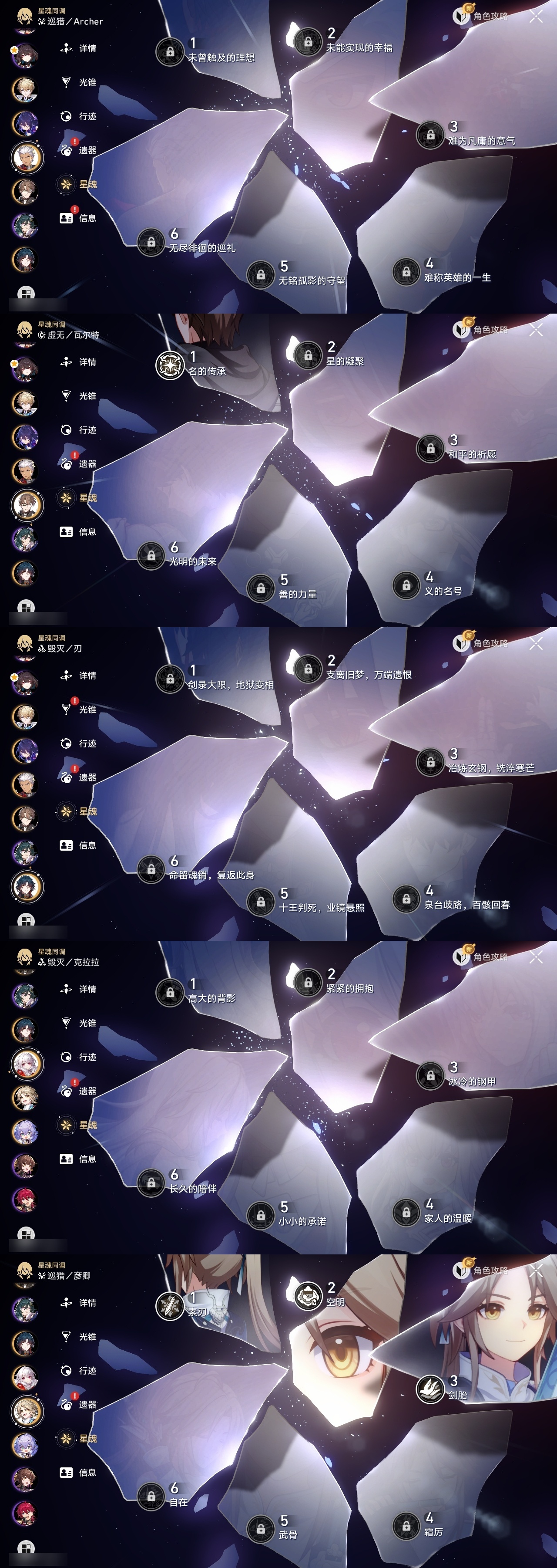 【崩坏·星穹铁道】【lyxq8655】冒险等级:70,男主,五星数量:49,五星角色:布洛妮娅 6命姬子 4命彦卿 3命杰帕德 2命遐蝶 2命流萤 2命白露 1命瓦尔特 1命黄泉 1命云璃椒丘希儿克拉拉星期日刃卡芙卡符玄藿藿银枝真理医生黑天鹅花火风堇砂金知更鸟白厄archer刻律德菈丹恒·腾荒昔涟__五星光锥:星海巡航 5精记忆永不落幕 5精落日时起舞制胜的瞬间以世界之名无可取代的东西时节不居如泥酣眠不息的演算回到大地的飞行让告别,更美一些片刻,留在眼底重塑时光之忆游戏尘寰行于流逝的岸黎明恰如此燃烧金血铭刻的时代爱如此刻永恒梦应归于何处__四星角色:娜塔莎 6命虎克 6命貊泽 6命黑塔 6命丹恒 6命艾丝妲 6命希露瓦 6命停云 6命素裳 6命桑博 6命三月七 6命青雀 6命佩拉 6命驭空 6命卢卡 6命玲可 6命桂乃芬 6命寒鸦 6命雪衣 6命米沙 6命加拉赫 6命阿兰 5命