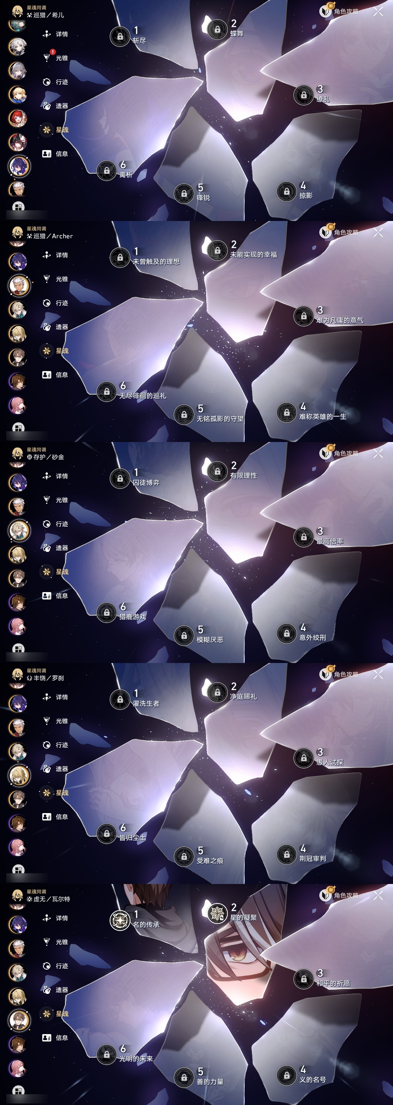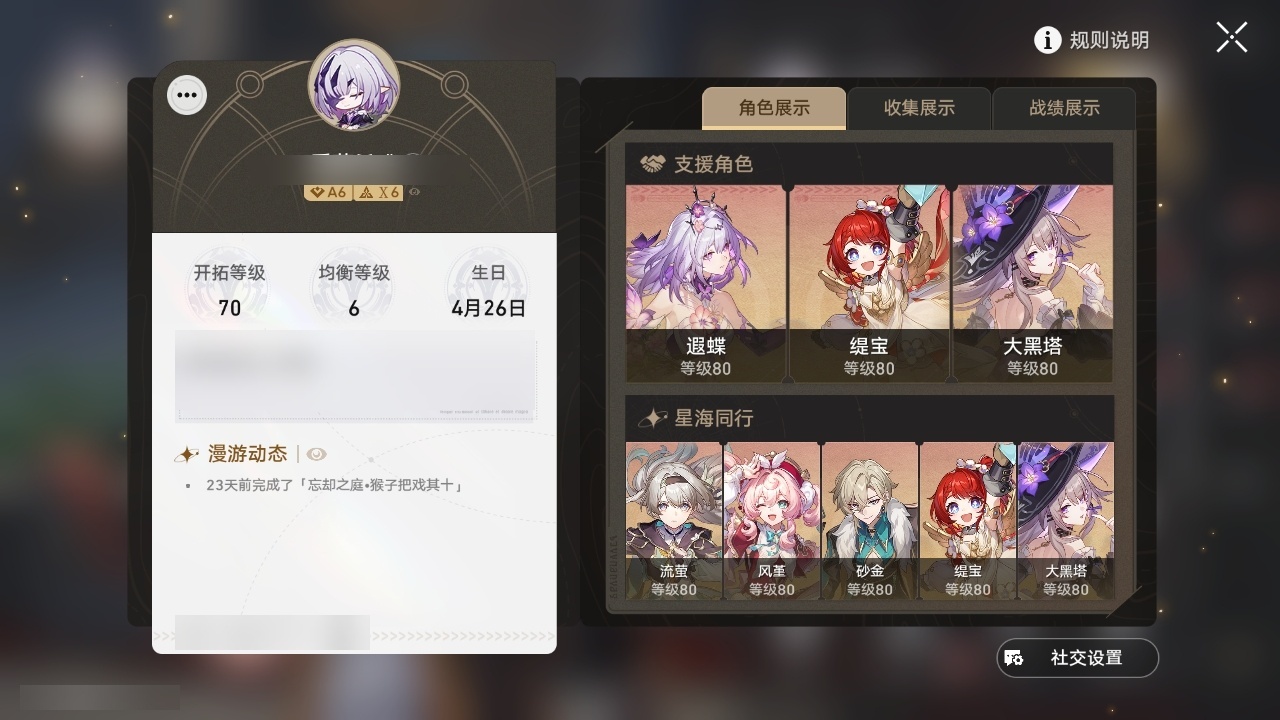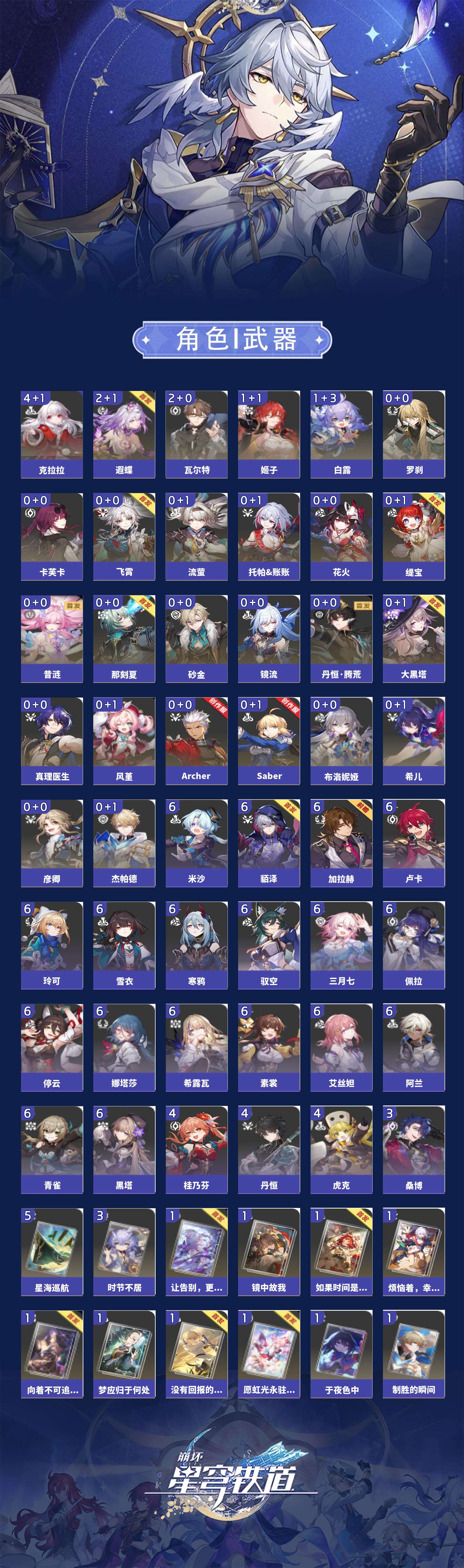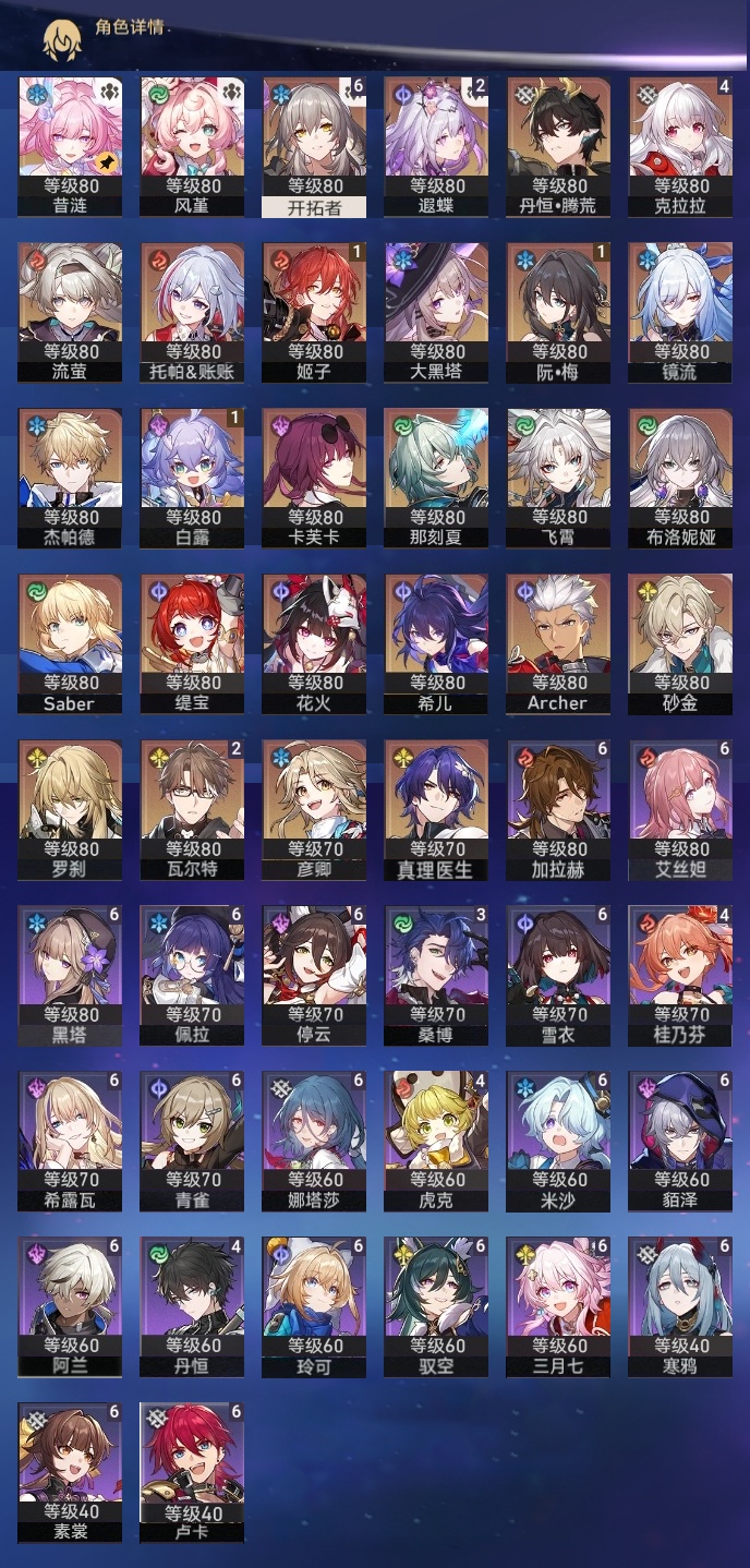【崩坏·星穹铁道】【lyxq8673】冒险等级:70,女主,五星数量:41,五星角色:克拉拉 4命瓦尔特 2命遐蝶 2命白露 1命姬子 1命飞霄希儿布洛妮娅杰帕德彦卿大黑塔罗刹缇宝卡芙卡镜流托帕账账真理医生花火那刻夏风堇砂金saberarcher丹恒·腾荒昔涟流萤__五星光锥:星海巡航 5精时节不居 3精制胜的瞬间制胜的瞬间银河铁道之夜无可取代的东西于夜色中向着不可追问处如果时间是一朵花让告别,更美一些烦恼着,幸福着镜中故我愿虹光永驻天空没有回报的加冕梦应归于何处__四星角色:阿兰 6命娜塔莎 6命貊泽 6命黑塔 6命艾丝妲 6命希露瓦 6命停云 6命素裳 6命三月七 6命青雀 6命佩拉 6命驭空 6命卢卡 6命玲可 6命寒鸦 6命雪衣 6命米沙 6命加拉赫 6命虎克 4命丹恒 4命桂乃芬 4命桑博 3命