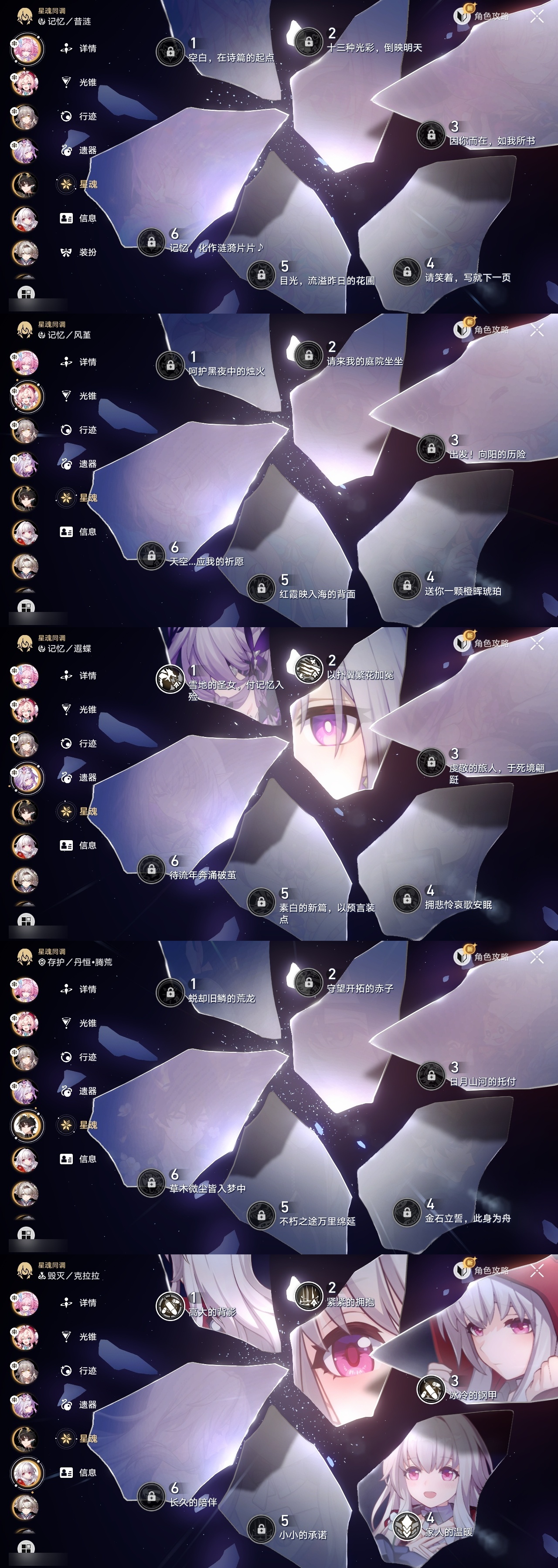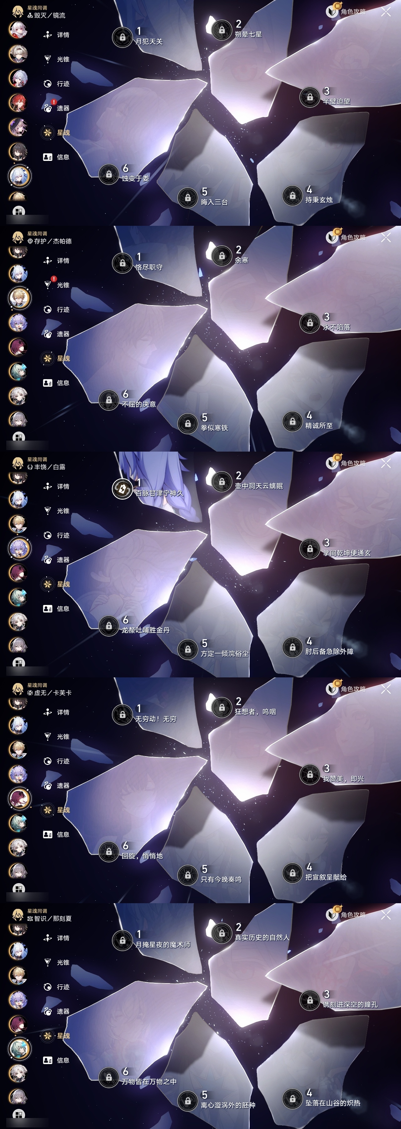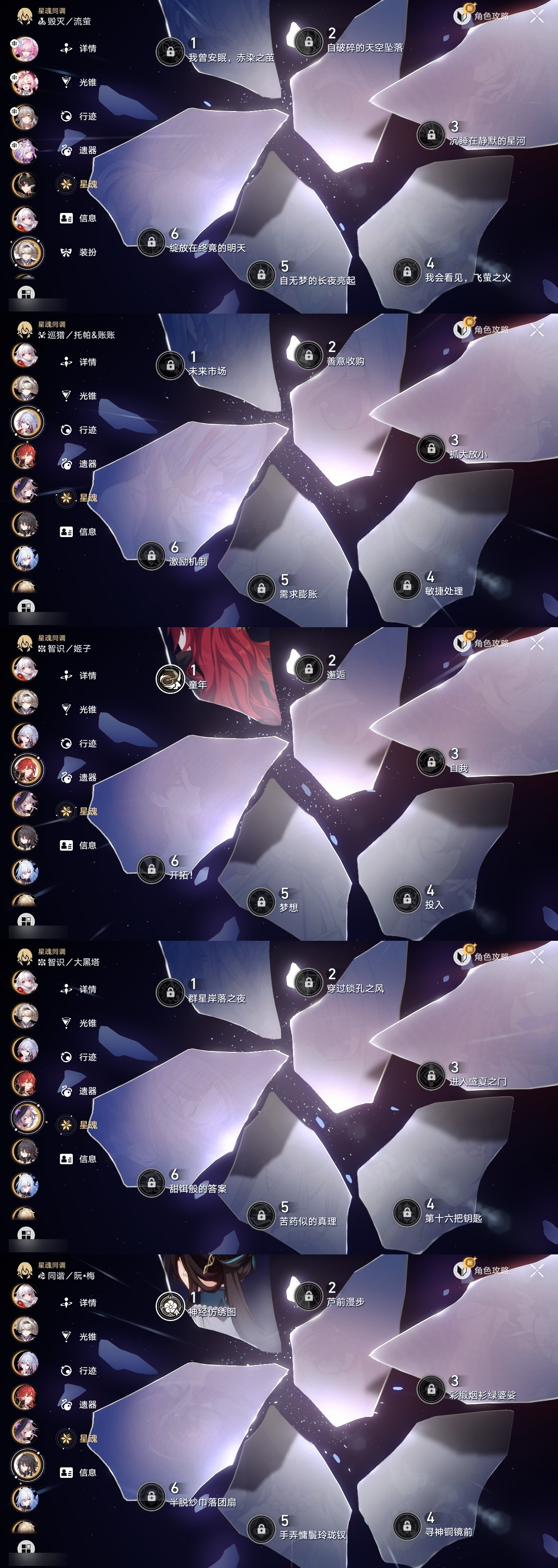 【崩坏·星穹铁道】【lyxq8673】冒险等级:70,女主,五星数量:41,五星角色:克拉拉 4命瓦尔特 2命遐蝶 2命白露 1命姬子 1命飞霄希儿布洛妮娅杰帕德彦卿大黑塔罗刹缇宝卡芙卡镜流托帕账账真理医生花火那刻夏风堇砂金saberarcher丹恒·腾荒昔涟流萤__五星光锥:星海巡航 5精时节不居 3精制胜的瞬间制胜的瞬间银河铁道之夜无可取代的东西于夜色中向着不可追问处如果时间是一朵花让告别,更美一些烦恼着,幸福着镜中故我愿虹光永驻天空没有回报的加冕梦应归于何处__四星角色:阿兰 6命娜塔莎 6命貊泽 6命黑塔 6命艾丝妲 6命希露瓦 6命停云 6命素裳 6命三月七 6命青雀 6命佩拉 6命驭空 6命卢卡 6命玲可 6命寒鸦 6命雪衣 6命米沙 6命加拉赫 6命虎克 4命丹恒 4命桂乃芬 4命桑博 3命
