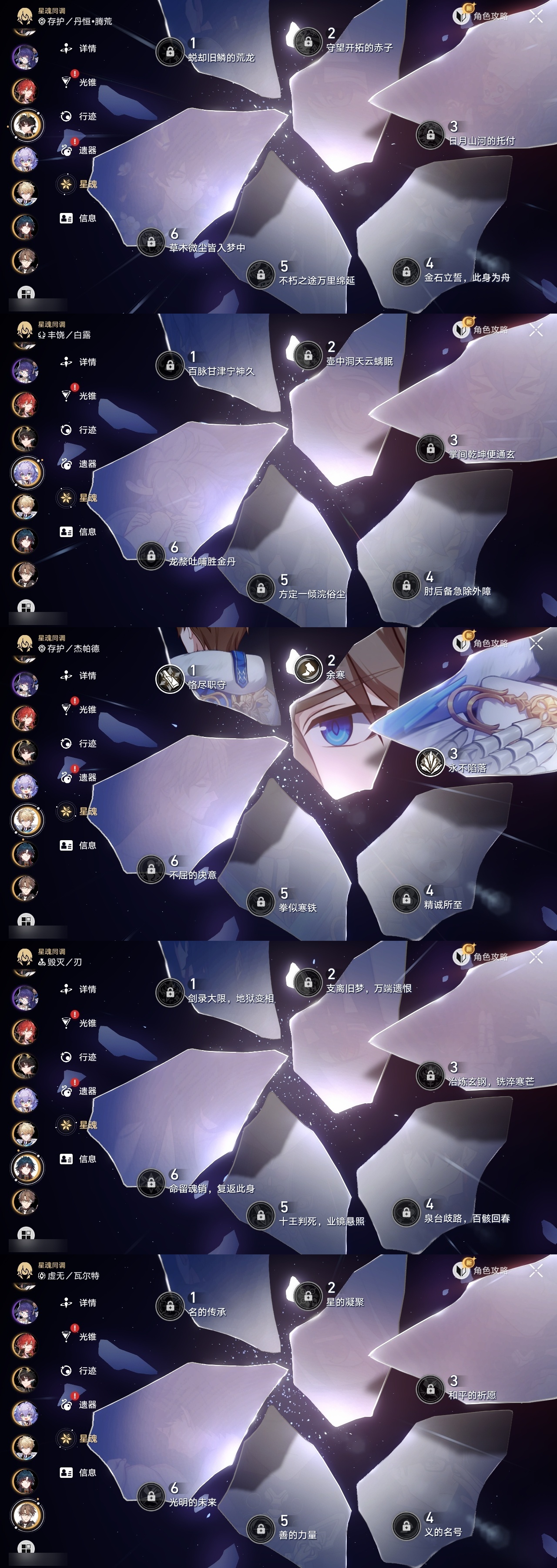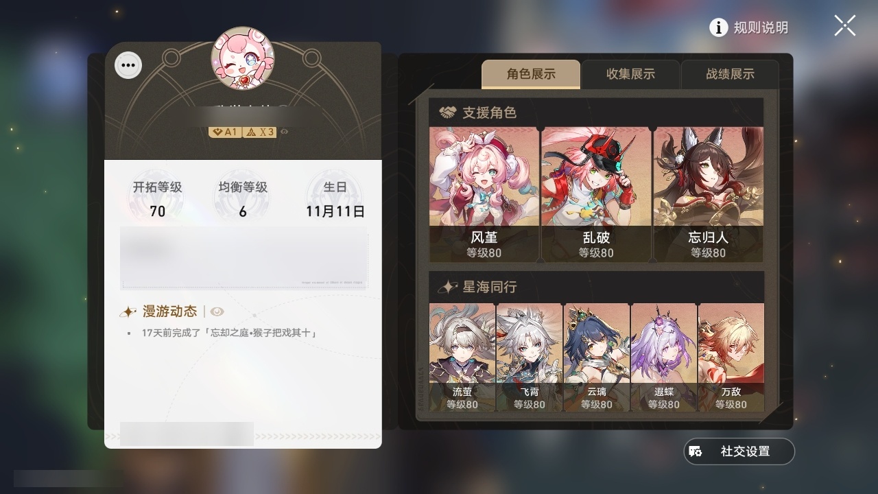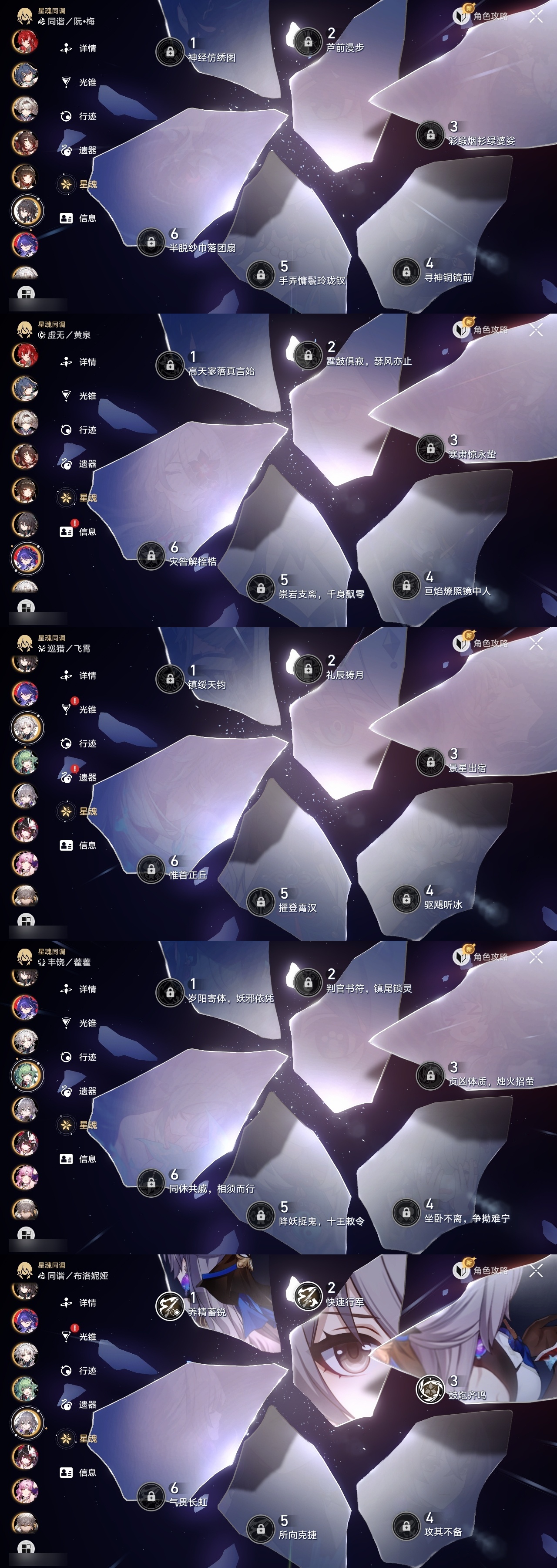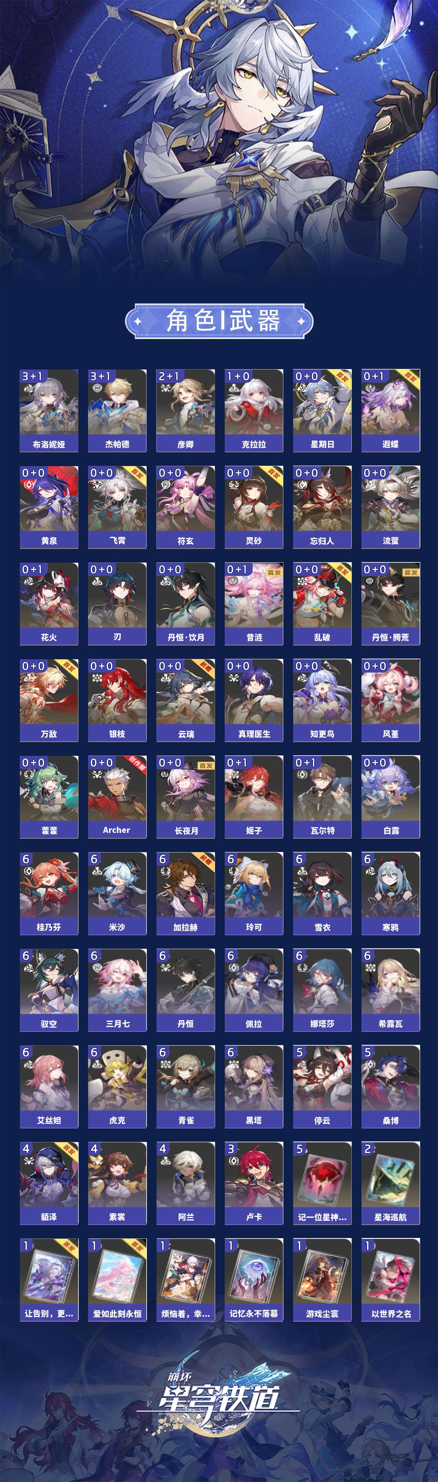 【崩坏·星穹铁道】【lyxq8689】冒险等级:70,男主,五星数量:42,五星角色:布洛妮娅 3命杰帕德 3命彦卿 2命克拉拉 1命云璃飞霄白露姬子灵砂瓦尔特乱破星期日忘归人万敌刃丹恒·饮月遐蝶符玄藿藿银枝真理医生花火黄泉风堇知更鸟archer长夜月丹恒·腾荒昔涟流萤__五星光锥:记一位星神的陨落 5精星海巡航 2精制胜的瞬间银河铁道之夜以世界之名如泥酣眠但战斗还未结束让告别,更美一些烦恼着,幸福着游戏尘寰记忆永不落幕爱如此刻永恒__四星角色:娜塔莎 6命虎克 6命黑塔 6命丹恒 6命艾丝妲 6命希露瓦 6命三月七 6命青雀 6命佩拉 6命驭空 6命玲可 6命桂乃芬 6命寒鸦 6命雪衣 6命米沙 6命加拉赫 6命停云 5命桑博 5命阿兰 4命貊泽 4命素裳 4命卢卡 3命