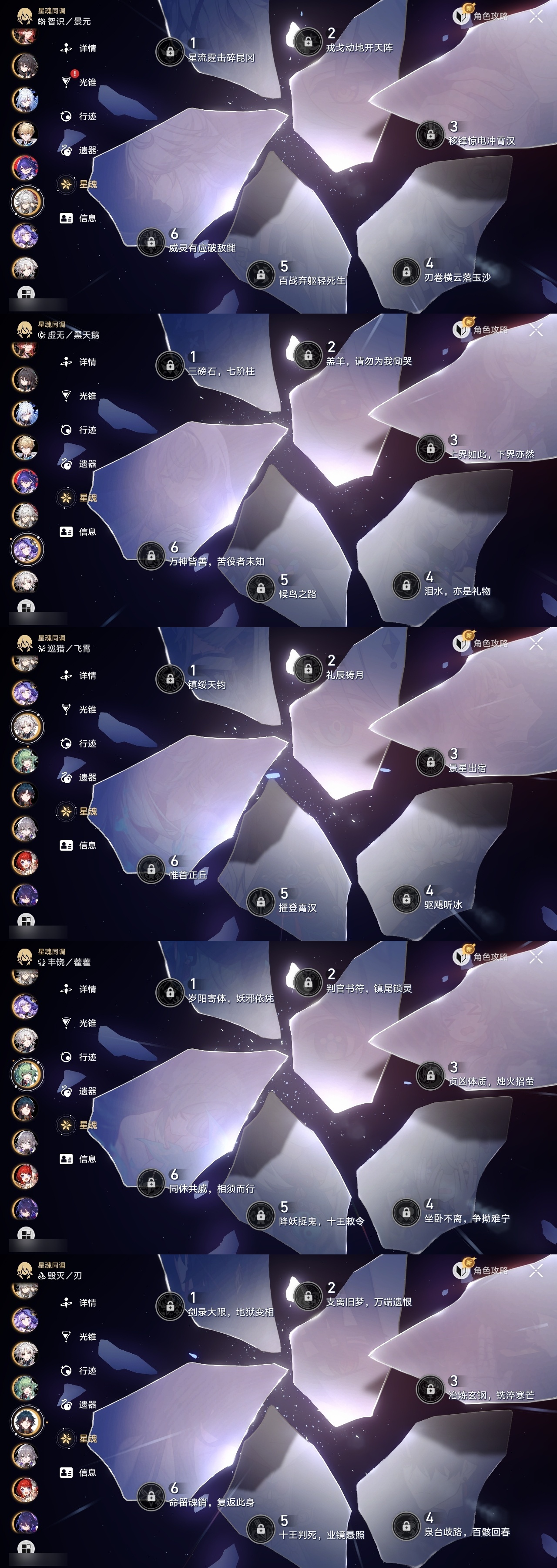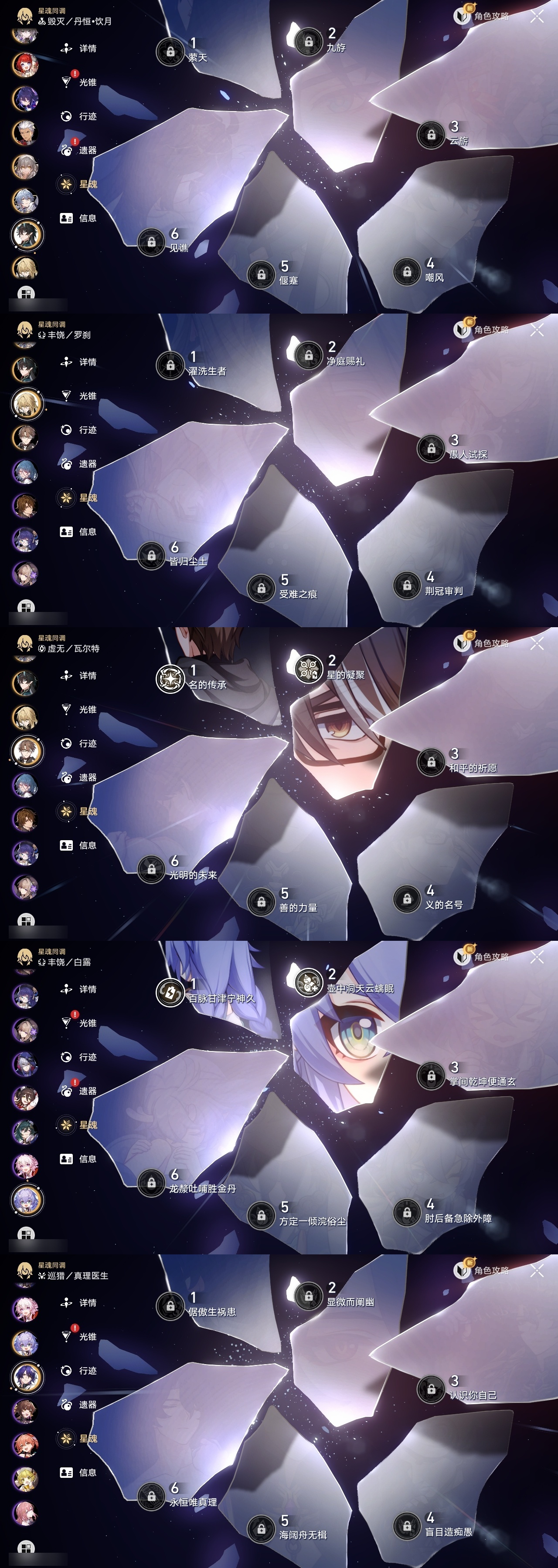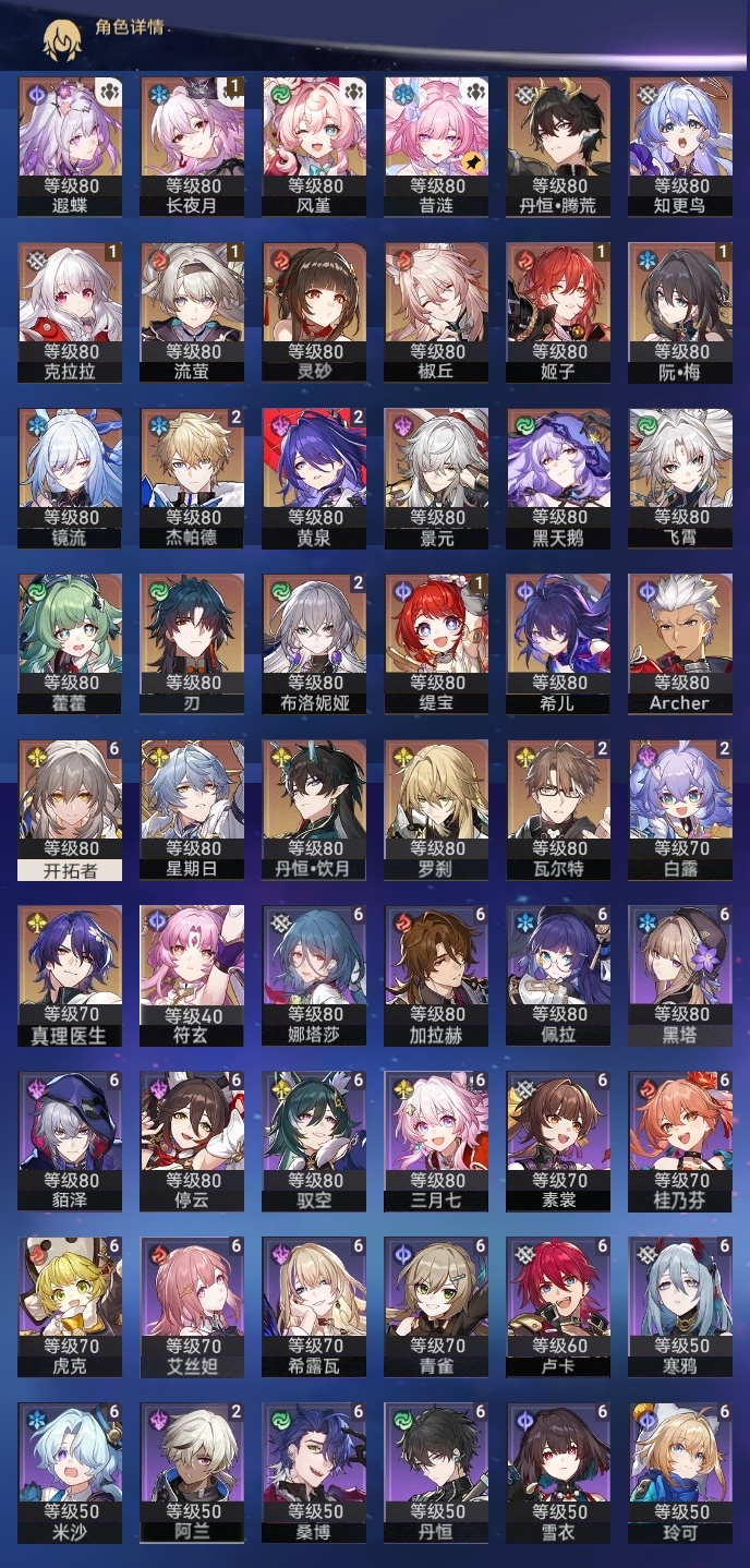 【崩坏·星穹铁道】【lyxq8715】冒险等级:70,女主,五星数量:44,五星角色:白露 2命布洛妮娅 2命杰帕德 2命瓦尔特 2命黄泉 2命姬子 1命克拉拉 1命缇宝 1命长夜月 1命流萤 1命椒丘飞霄景元希儿灵砂星期日罗刹刃丹恒·饮月遐蝶符玄镜流藿藿真理医生黑天鹅风堇知更鸟archer丹恒·腾荒昔涟__五星光锥:记一位星神的陨落 5精孤独的疗愈 5精记忆永不落幕 5精星海巡航 3精制胜的瞬间 2精银河铁道之夜以世界之名时节不居于夜色中我将,巡征追猎比阳光更明亮的让告别,更美一些重塑时光之忆行于流逝的岸__四星角色:娜塔莎 6命虎克 6命貊泽 6命黑塔 6命丹恒 6命艾丝妲 6命希露瓦 6命停云 6命素裳 6命桑博 6命三月七 6命青雀 6命佩拉 6命驭空 6命卢卡 6命玲可 6命桂乃芬 6命寒鸦 6命雪衣 6命米沙 6命加拉赫 6命阿兰 2命